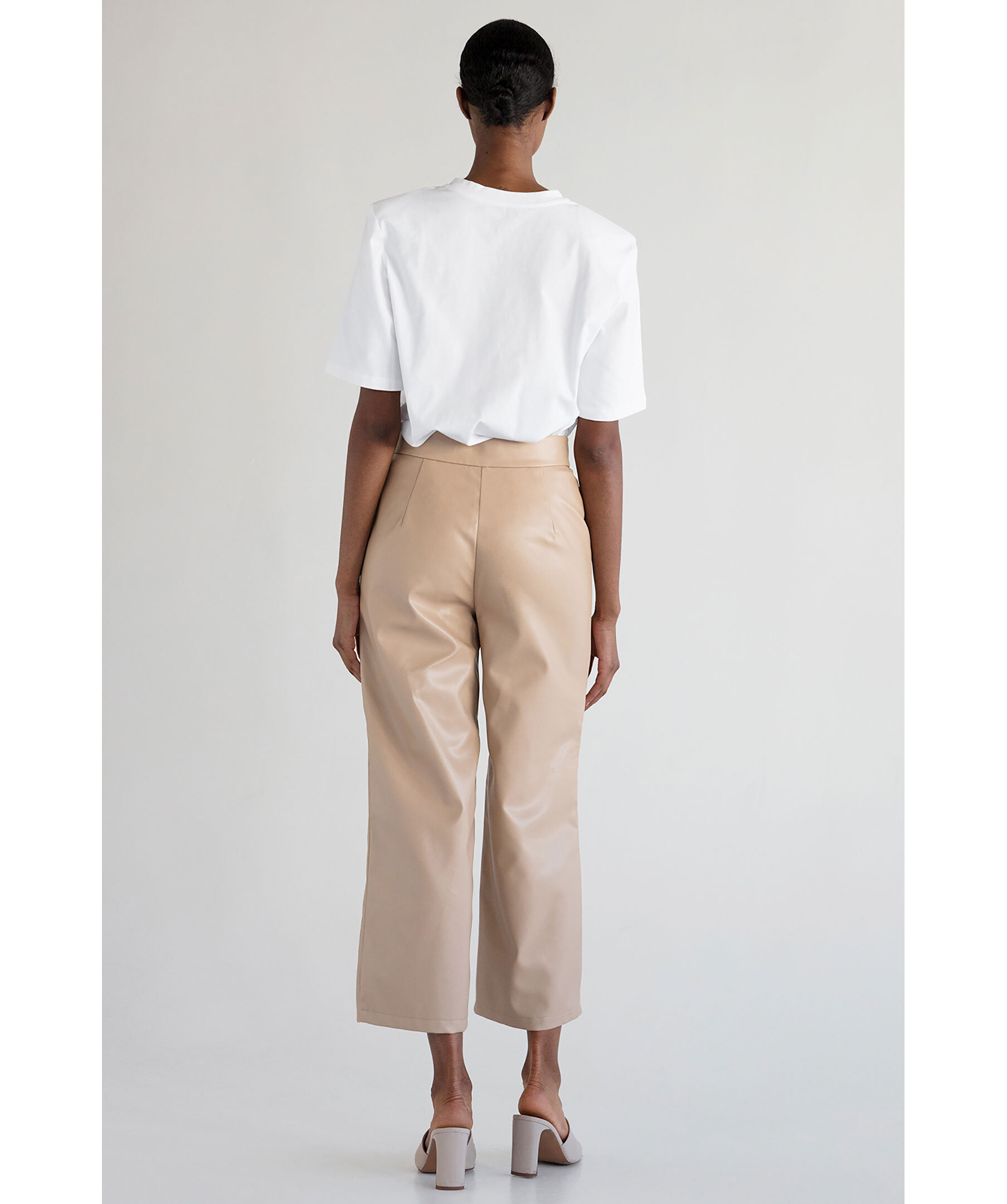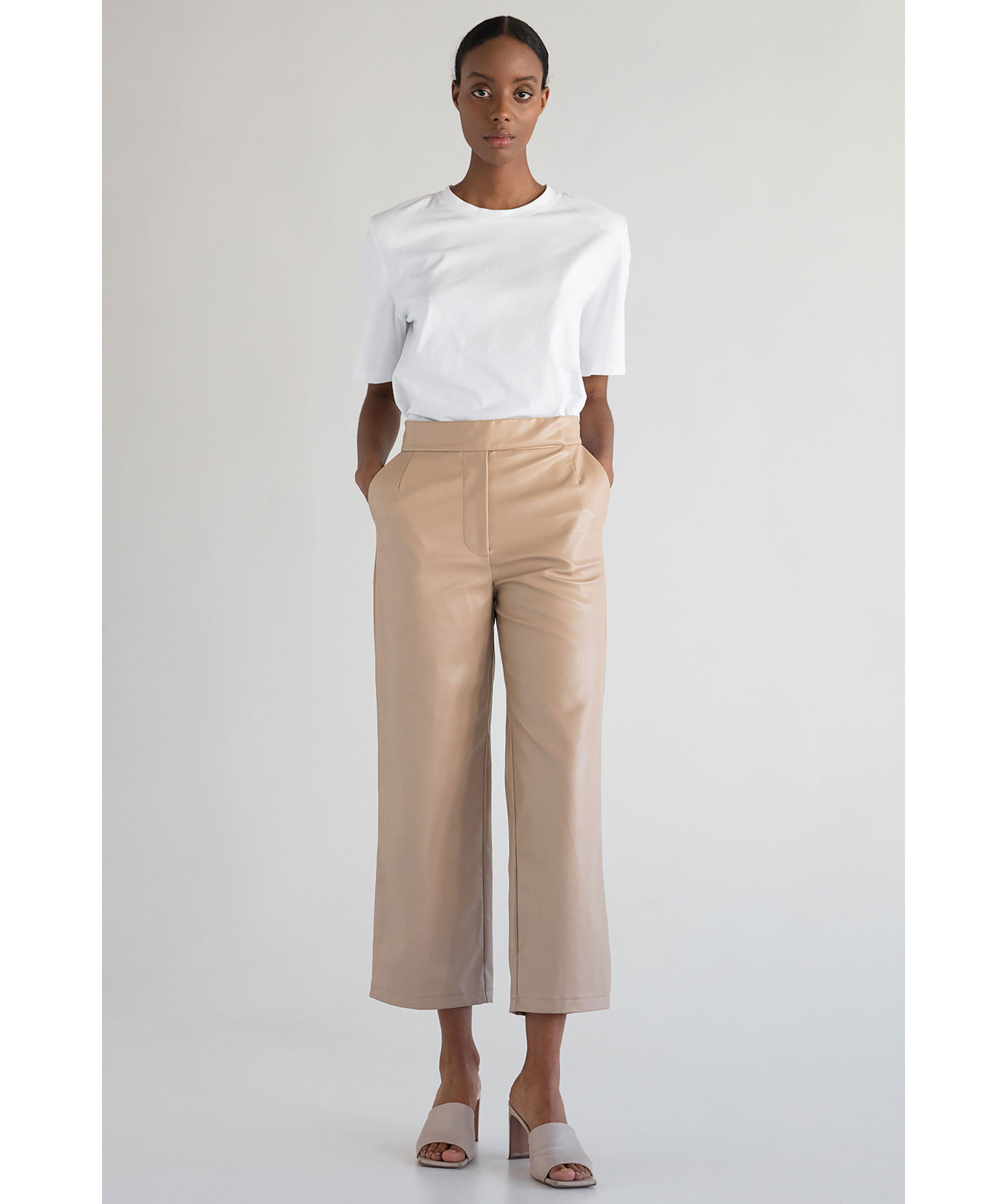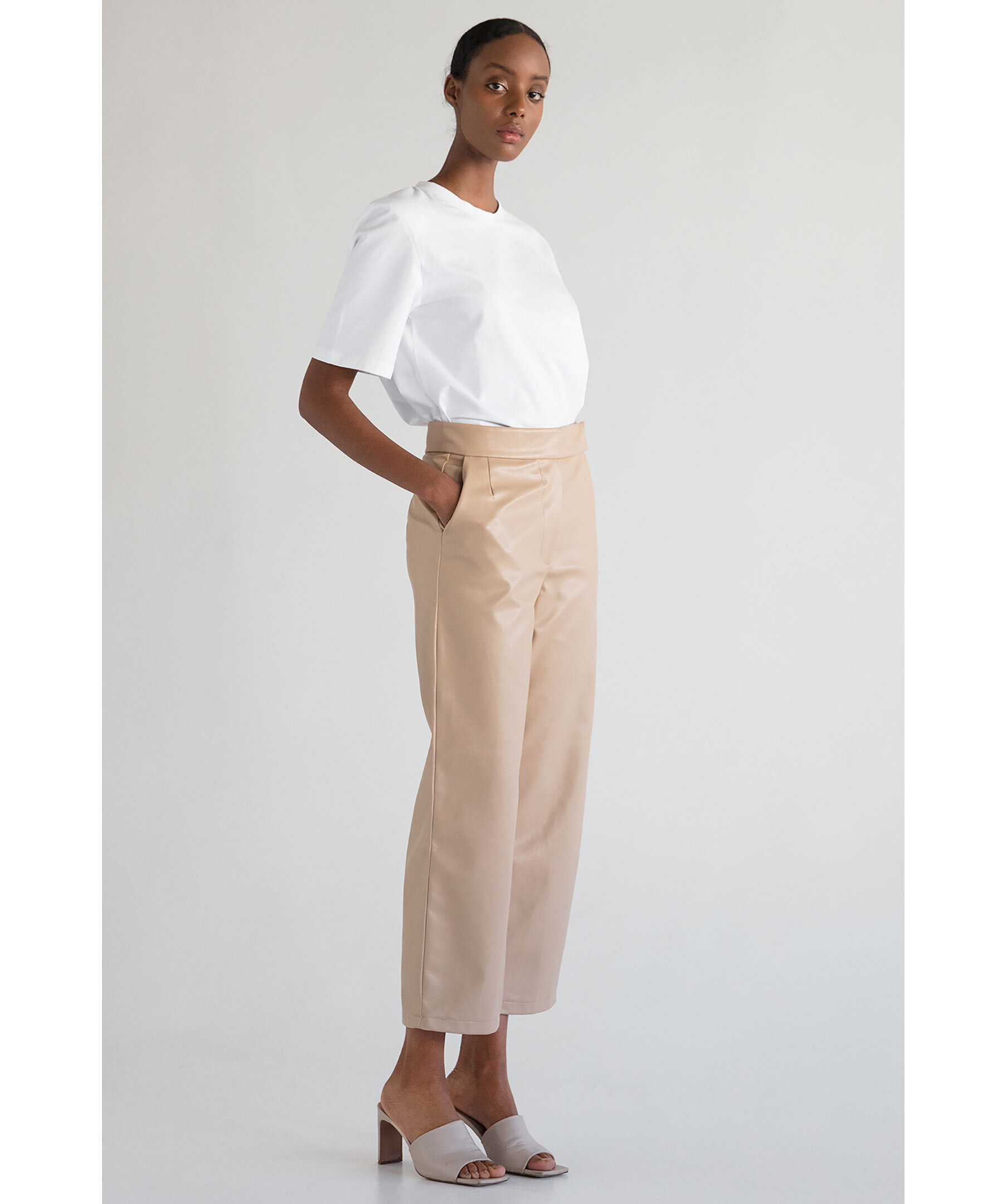 Beige dressade byxor från Stylein. Gjorda i veganskt konstskinn. Mellanhög midja och raka passform med croppade ben. Två sidofickor.