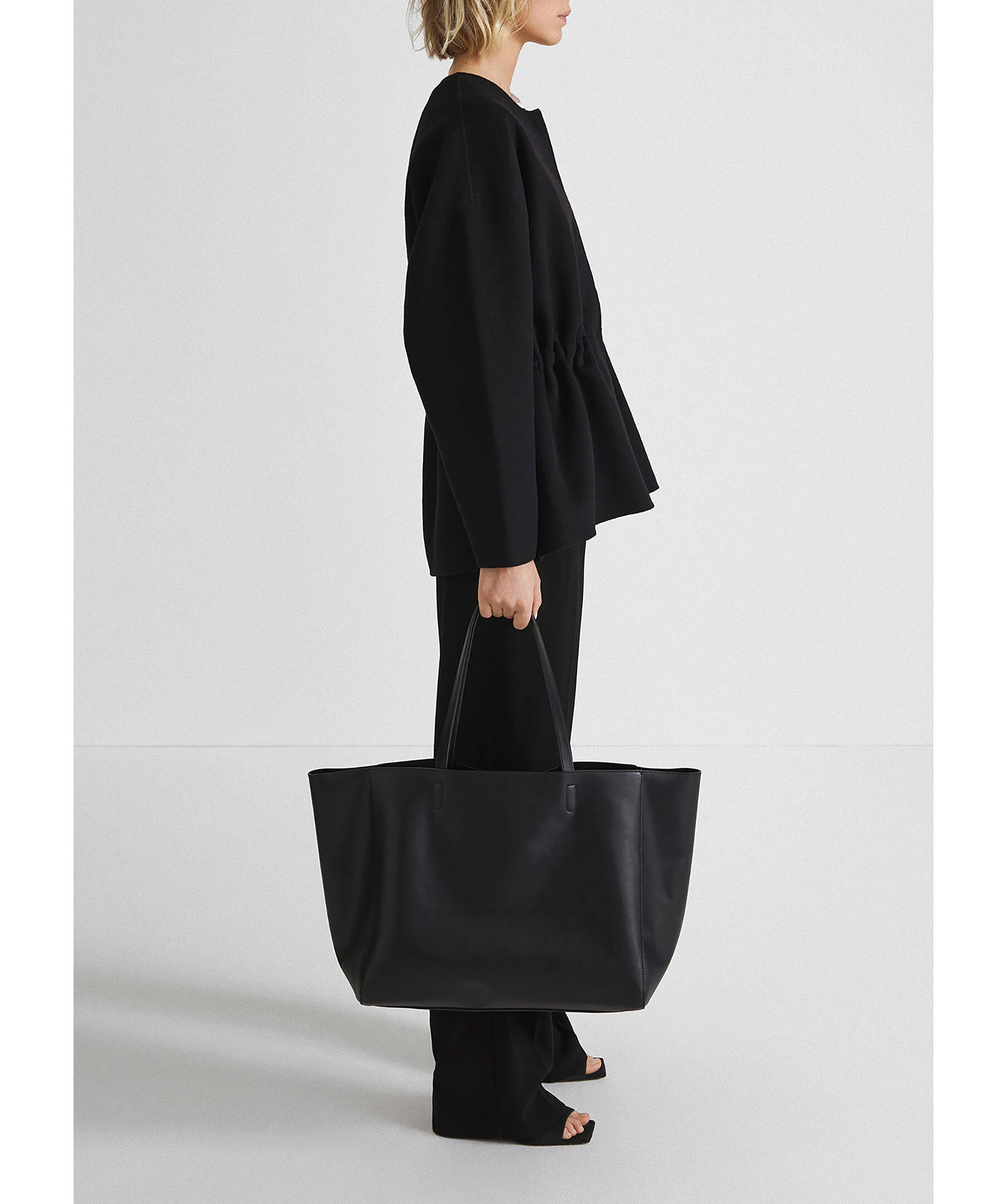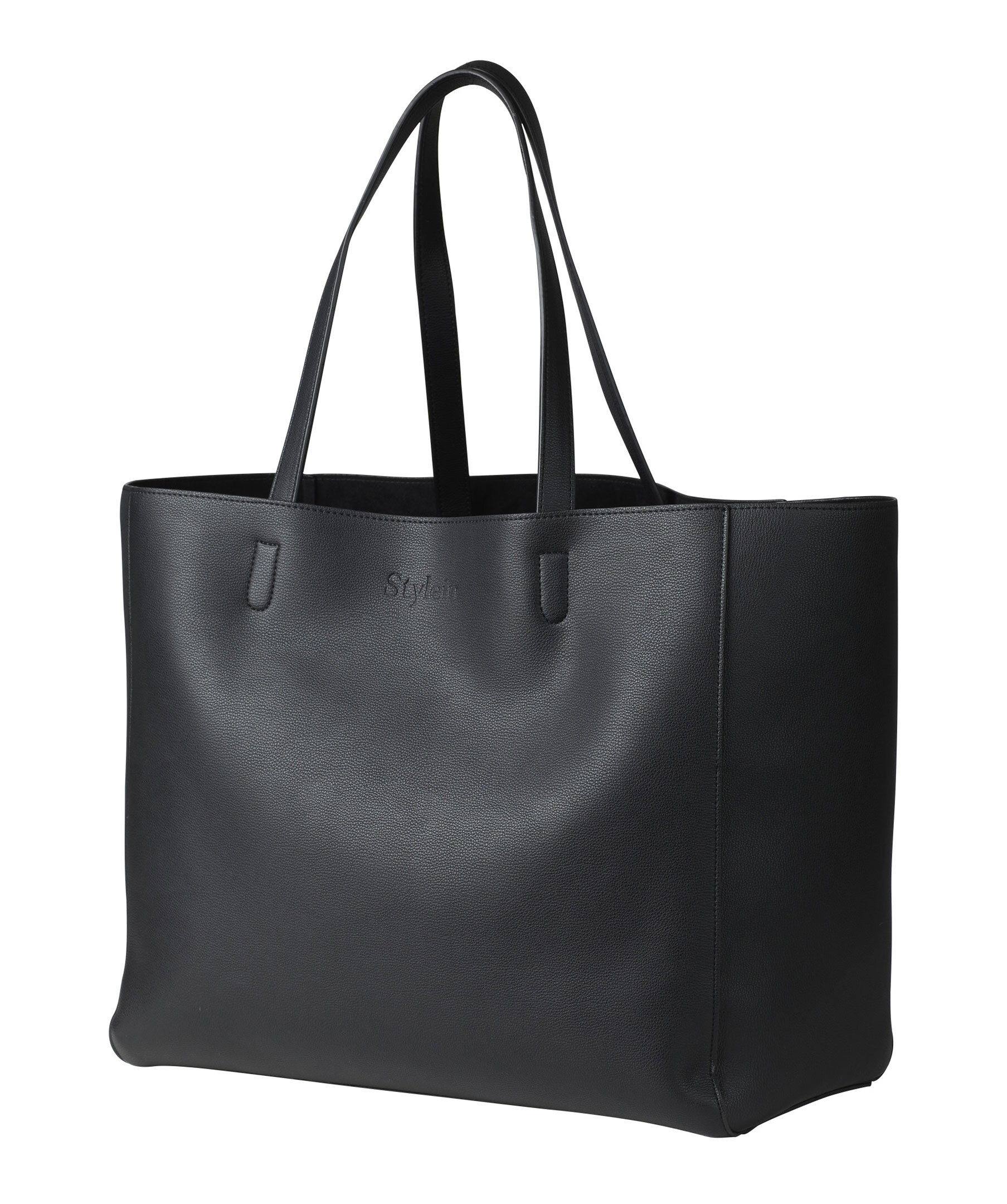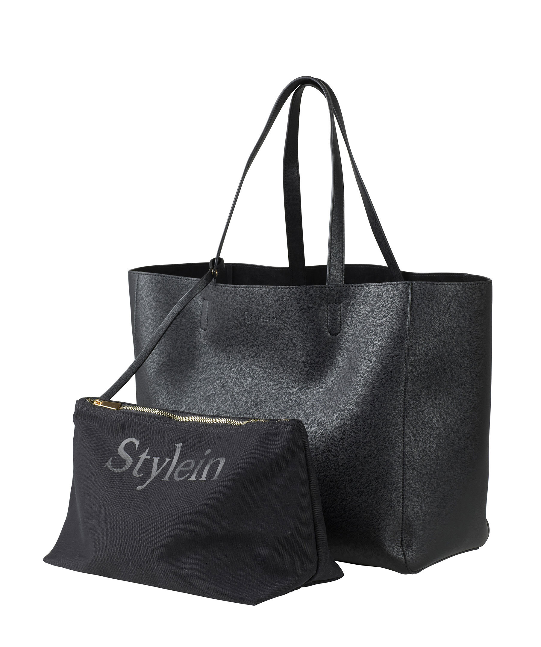 Stor svart tote bag från Stylein. En praktisk väska som även kommer med en bekväm innerväska, i form av en bomullscanvasclutch där du får plats med alla dina tillhörigheter. Den perfekta stadsväskan för vardagliga behov och kan passa din bärbara dator på väg till jobbet samt alla dina böcker till skolan eller varför inte fylla den med dina träningskläder. Deras klassiska shopper är skapad av det vackraste veganska lädret med strukturerad yta med en förstärkt bottenplatta för stabilitet.