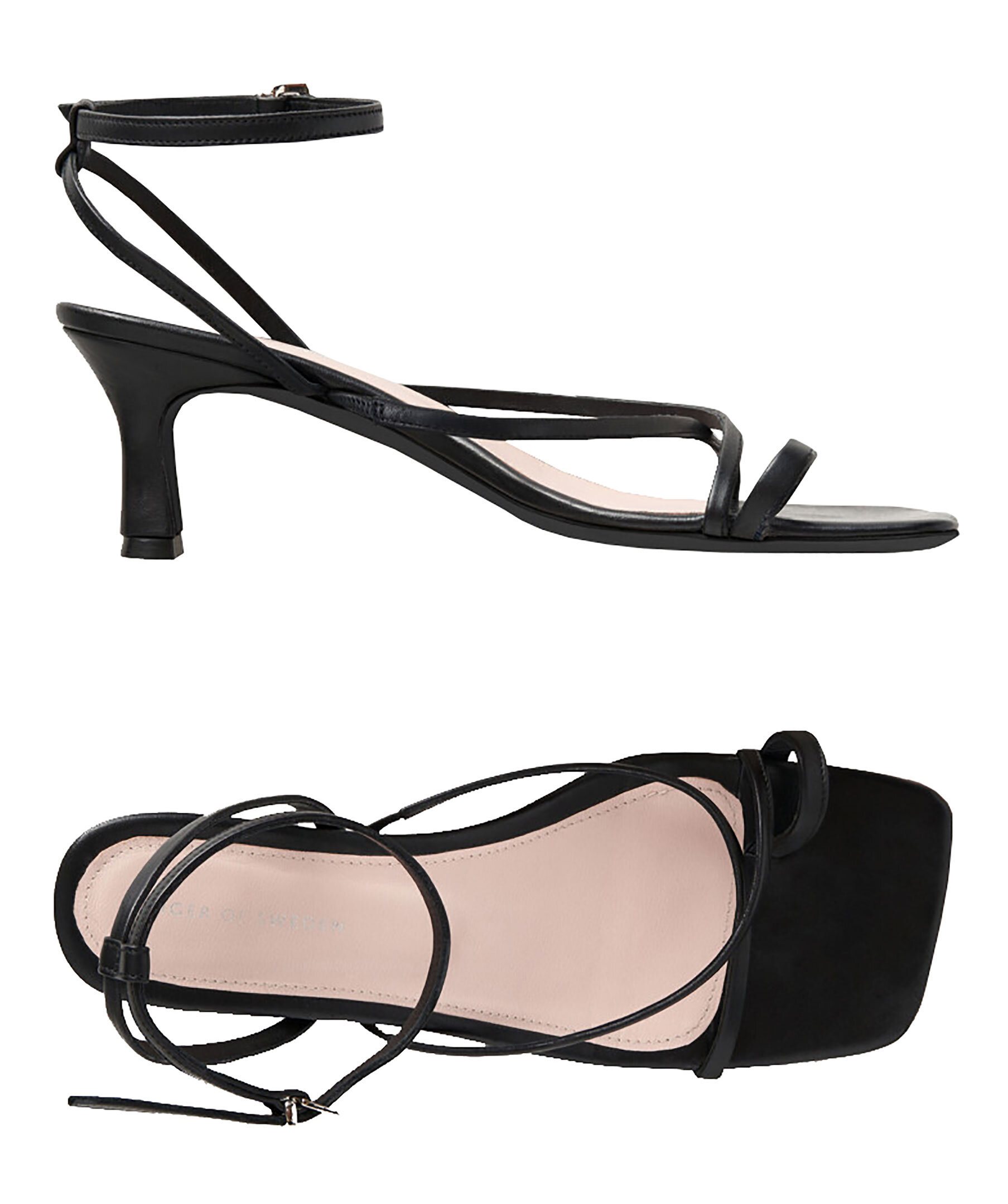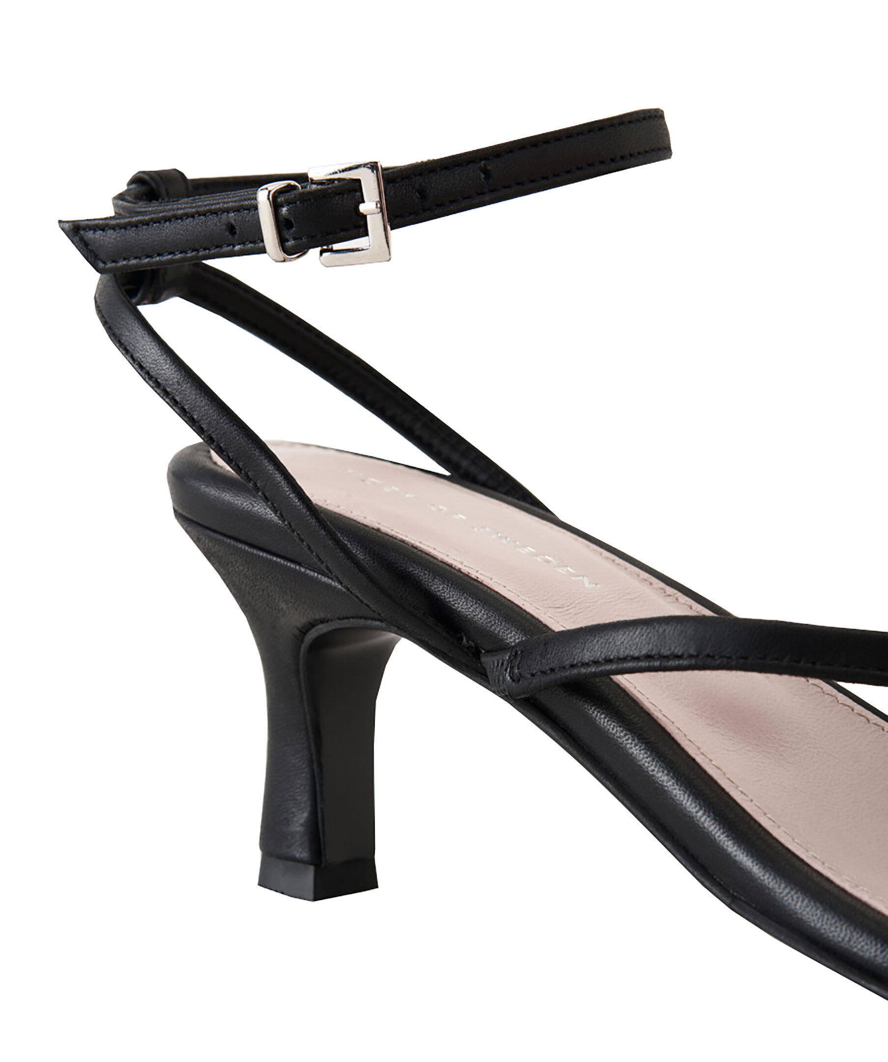 Svart sandal i kalvskinn från Tiger of Sweden. Rem som korsas som ett kryss över foten, ankelrem med justerbart spänne och lädersula och 7 cm lång klack med gummiinsats. Lädret i denna produkt kommer från ett LWG-certifierat garveri.