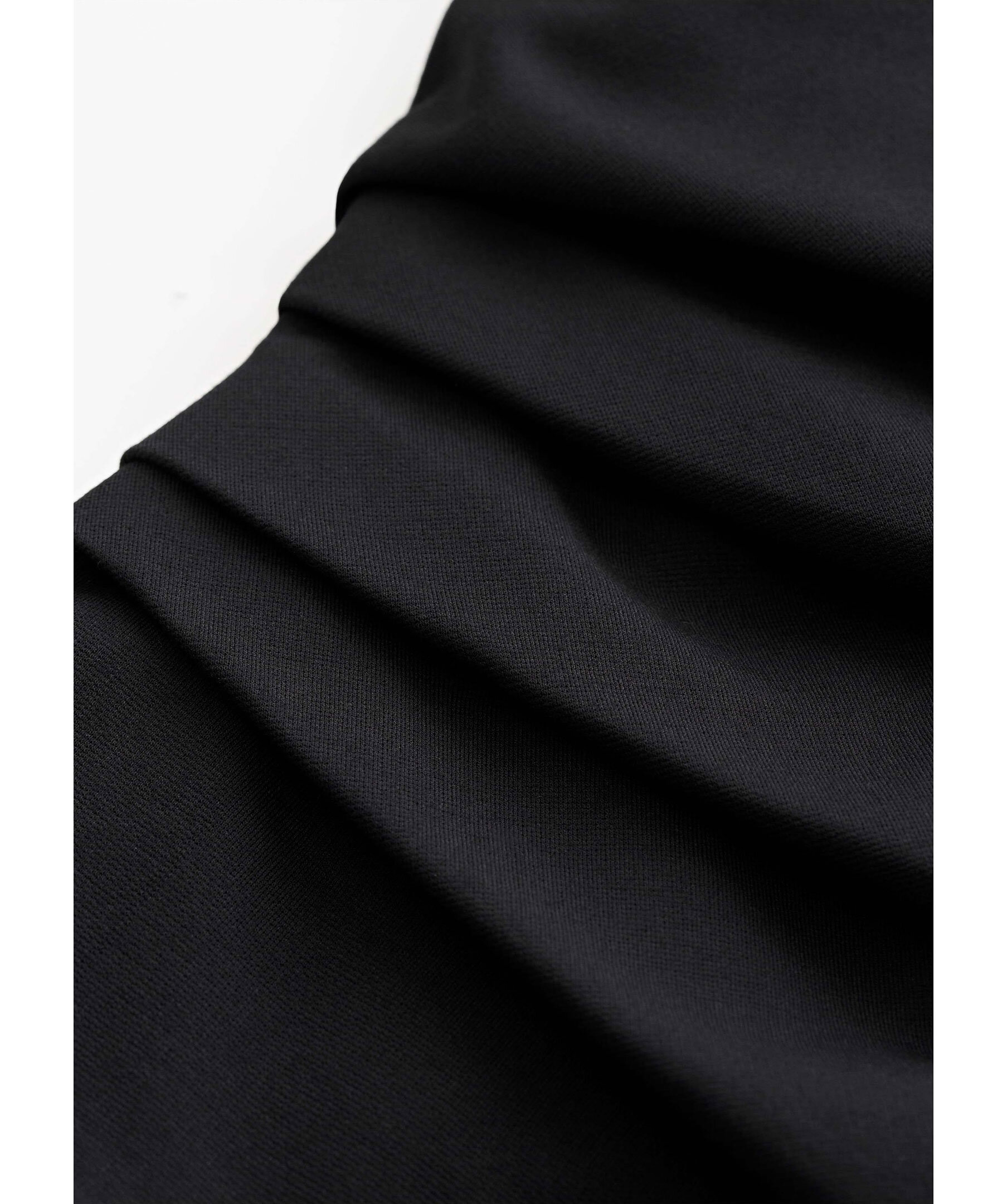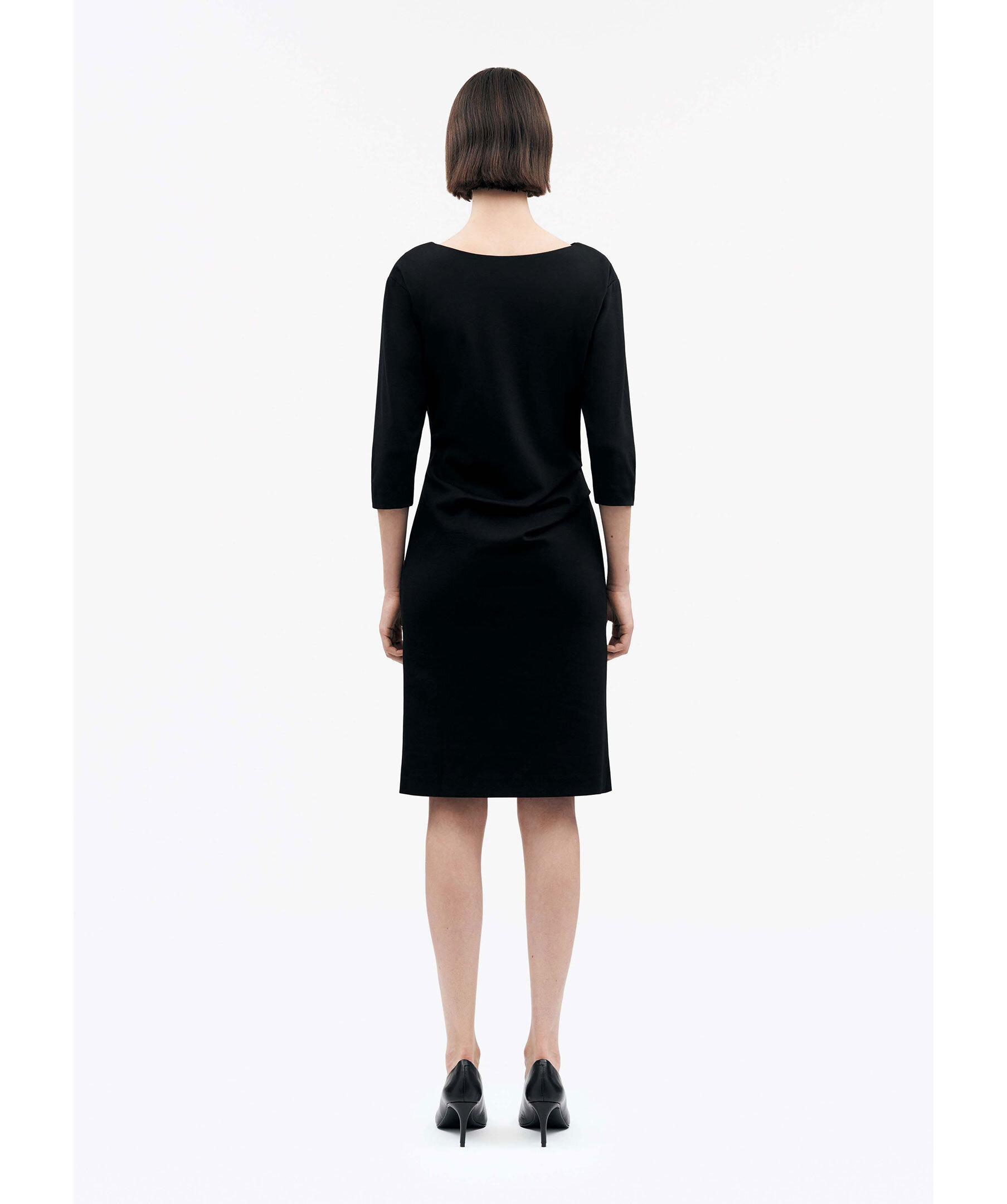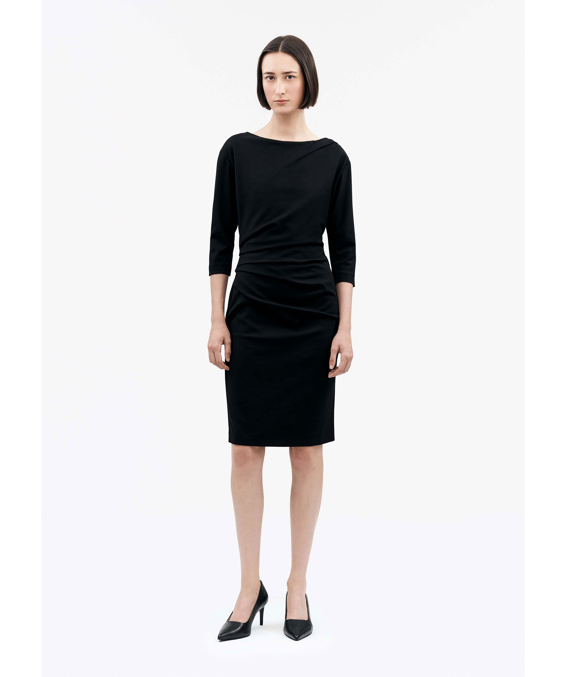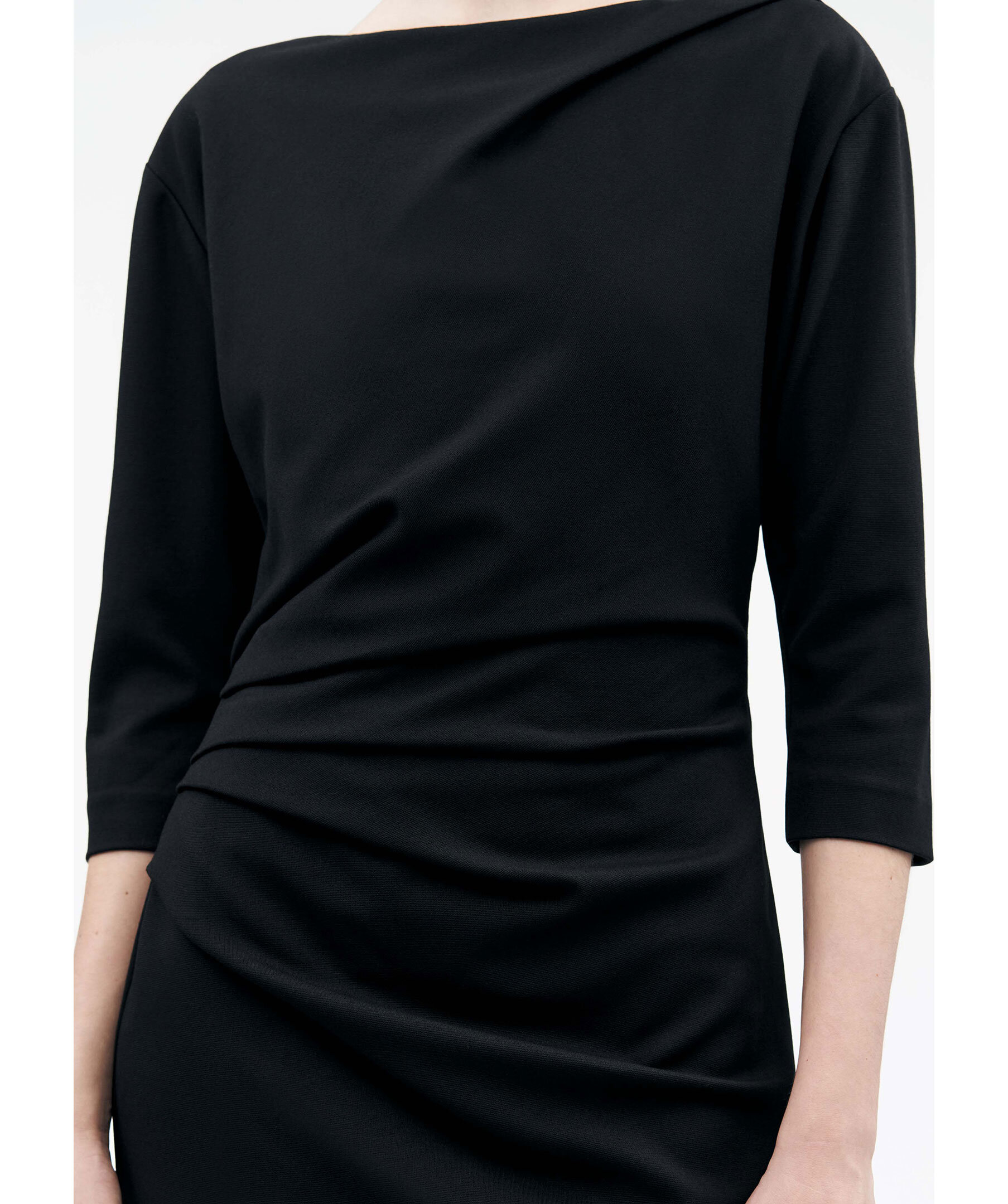 Svart figurnära klänning från Tiger of Sweden. Klänningen är i jerseykvalitet med ett veck över ena axeln och draperande veck framtill på ena sidan. Den har en rund hals med dold dragkedja baktill och raka 3/4-ärmar. Vävt foder. Tillverkad i en viskosblandning.