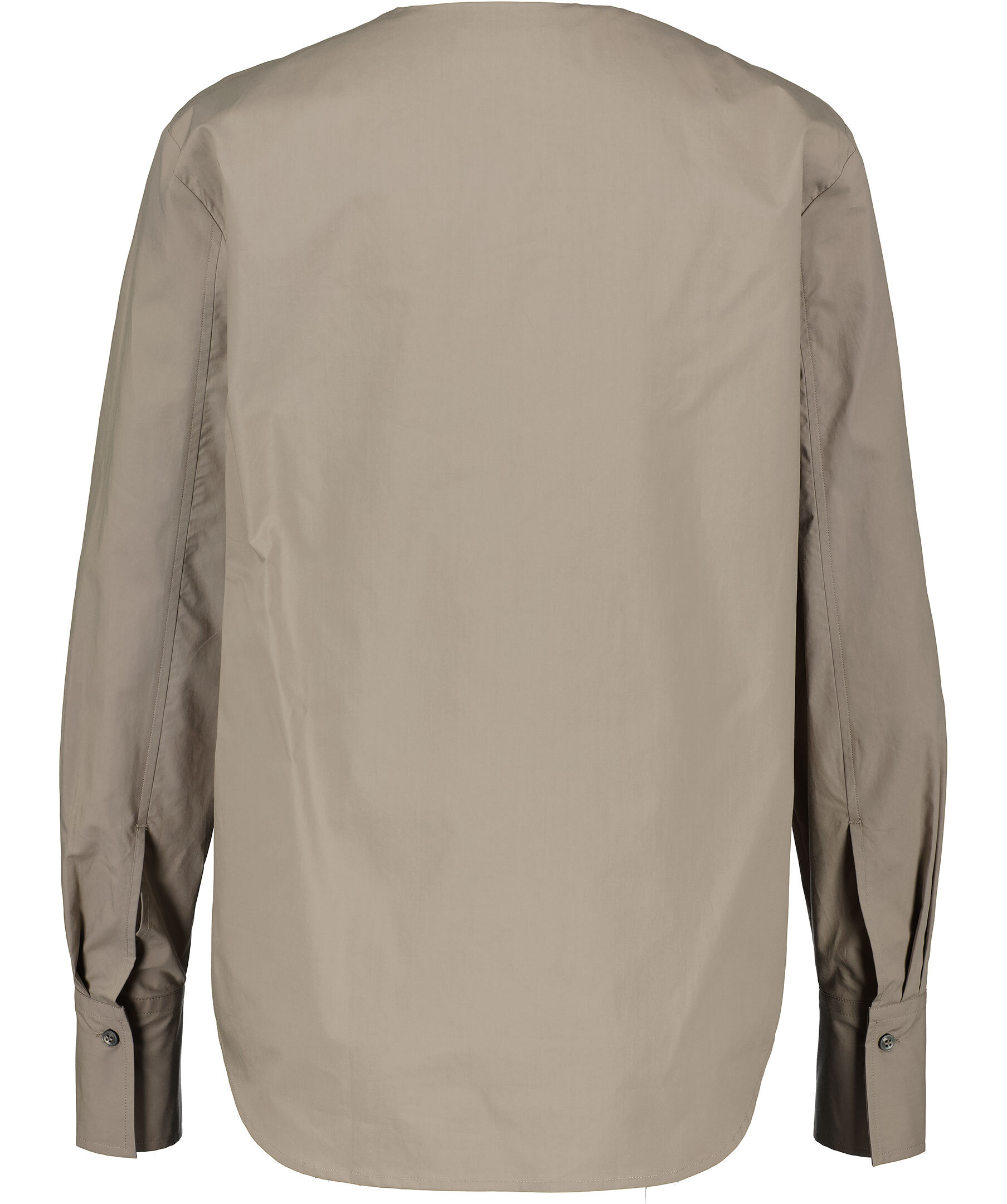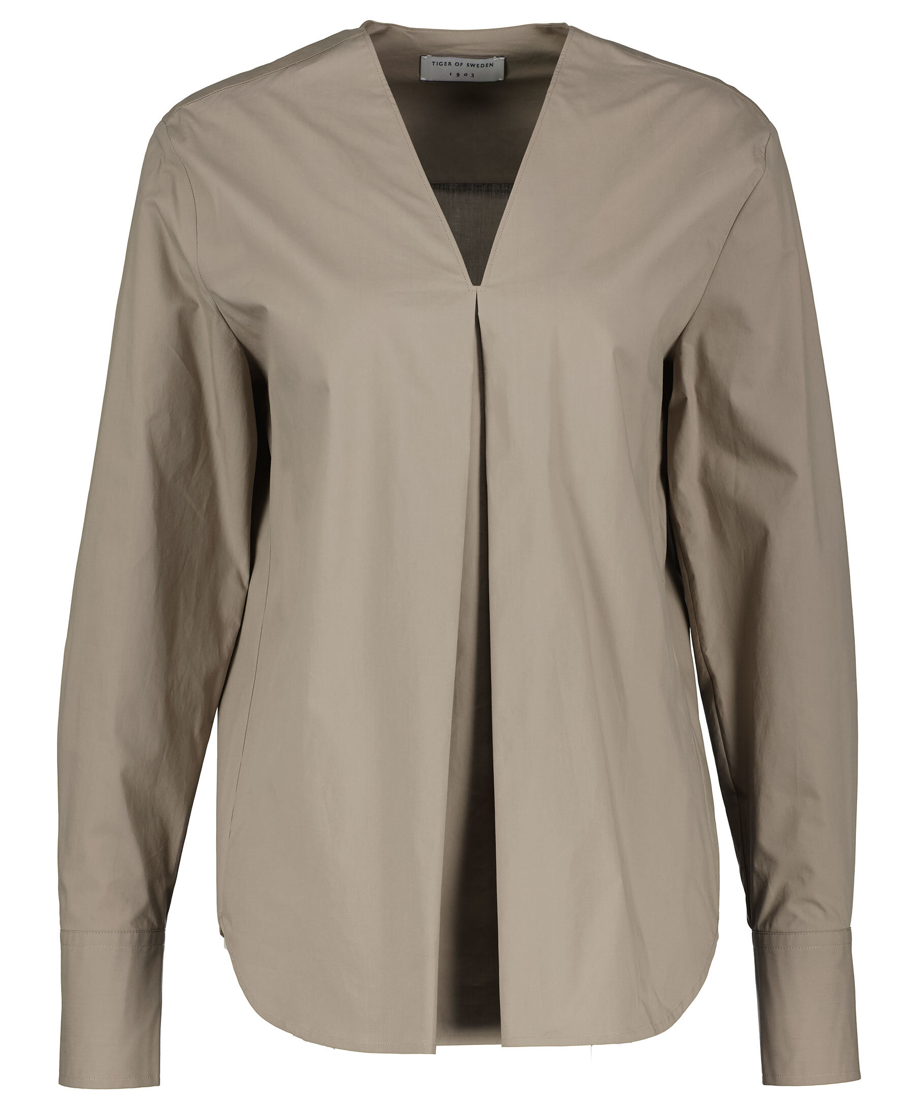 Ljusbrun, långärmad blus från Tiger of Sweden. Tillverkad i 100% bomull. V-ringning, liten drapering fram och har rundad fåll. Manschett med knappar i ärmslut.