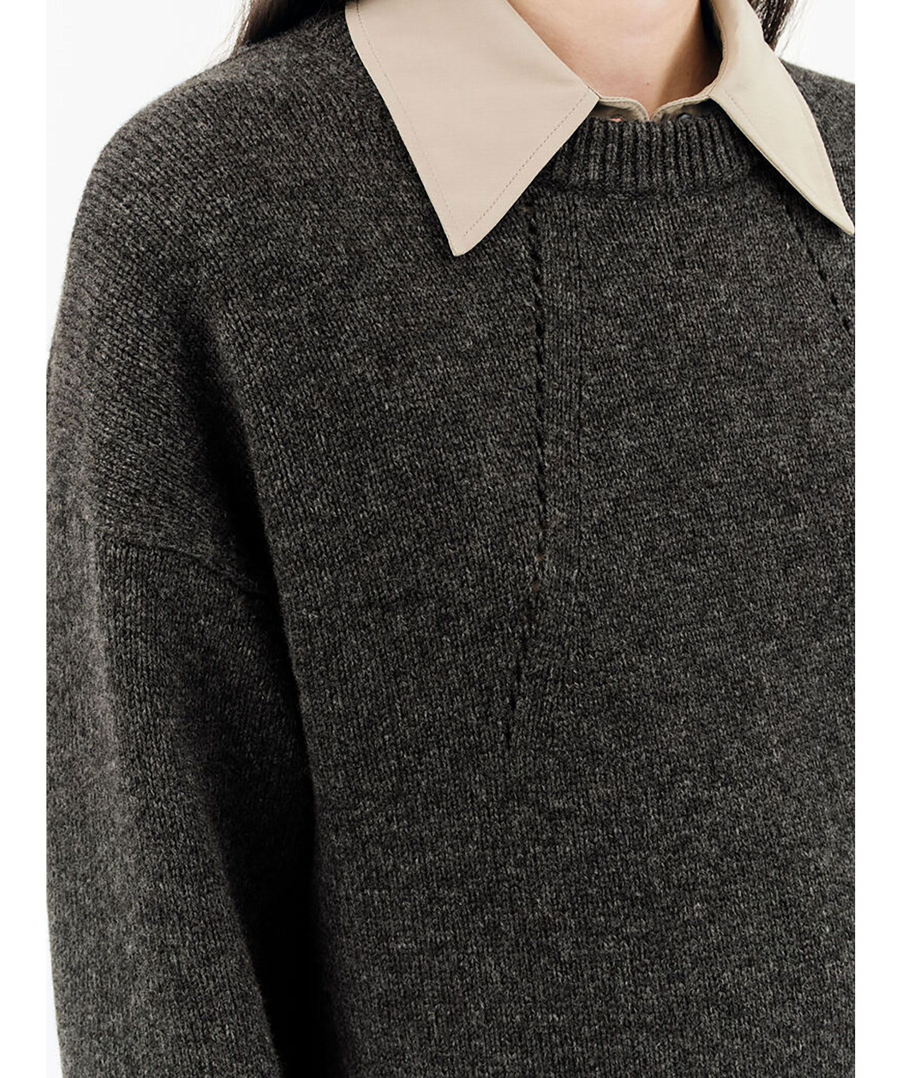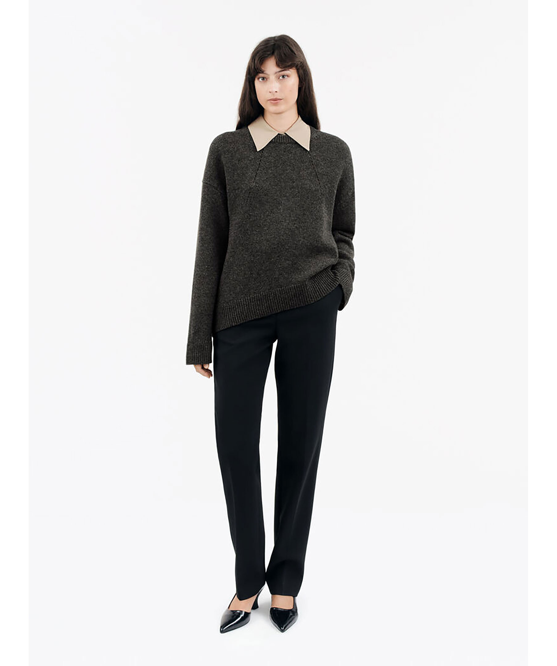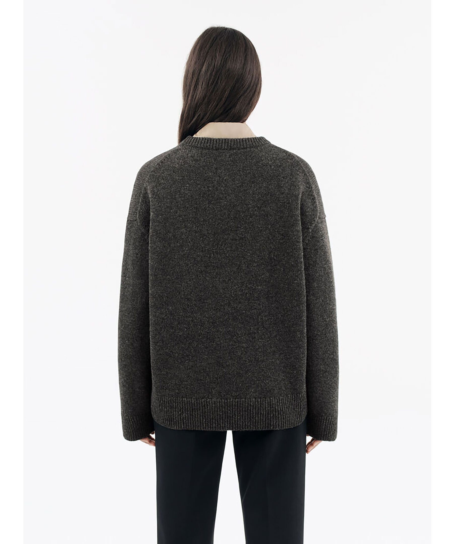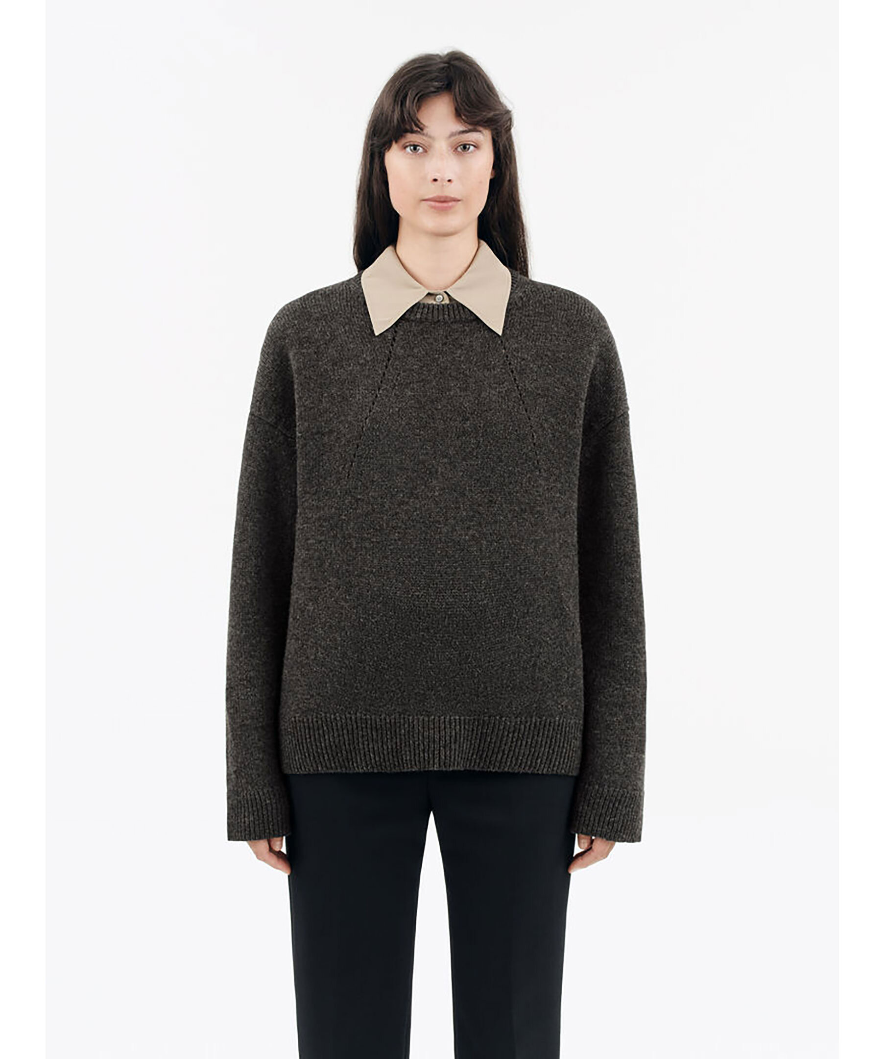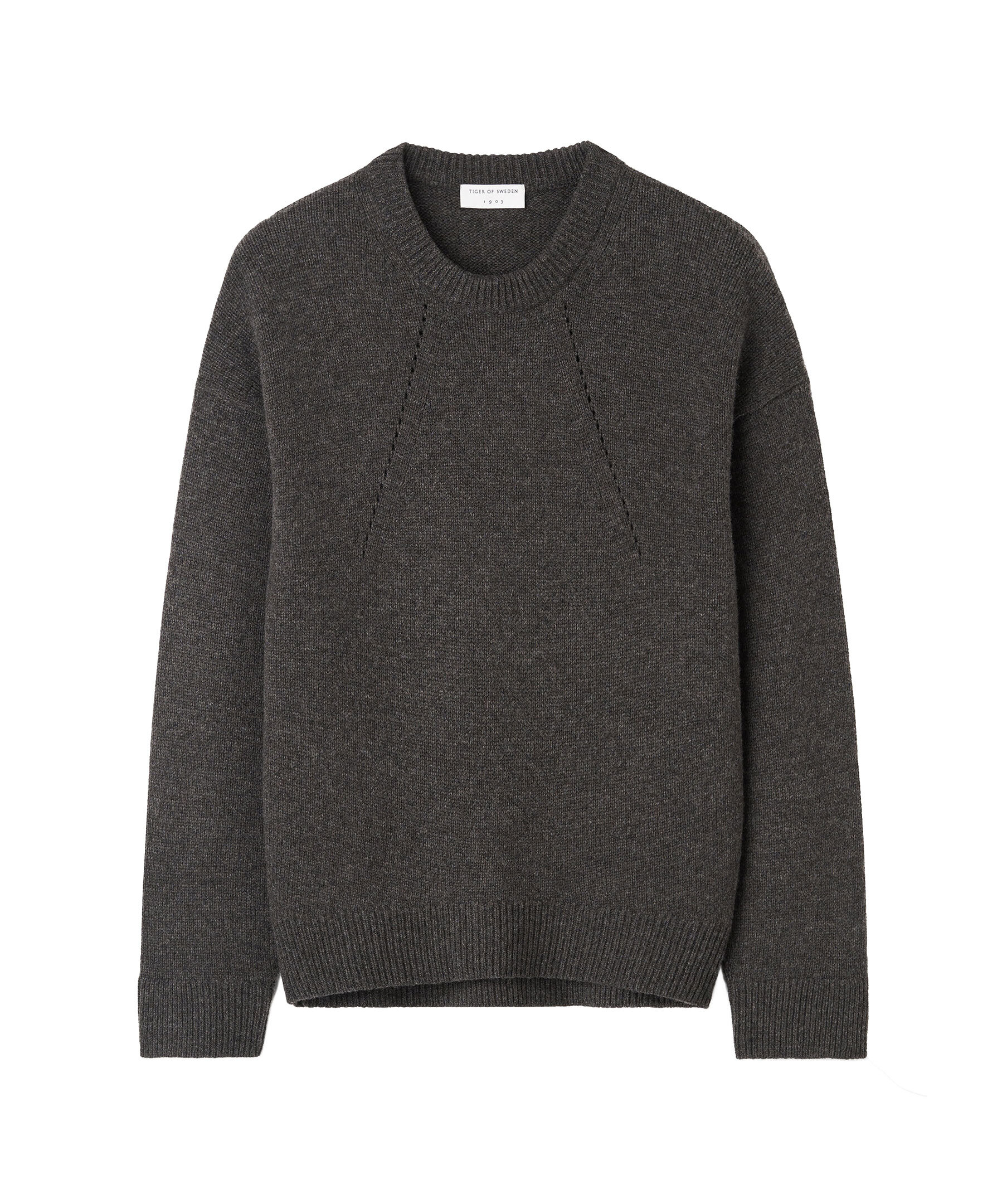 Mörkgrå stickad pullover från Tiger of Sweden. Ledig passform och rundad fåll. Ribbstickad fåll, ärmslut och halsringning. Gjord i jak- och merinoull. Dekorativa snörhål på bröstet. Modellen är 176 cm och bär storlek S.