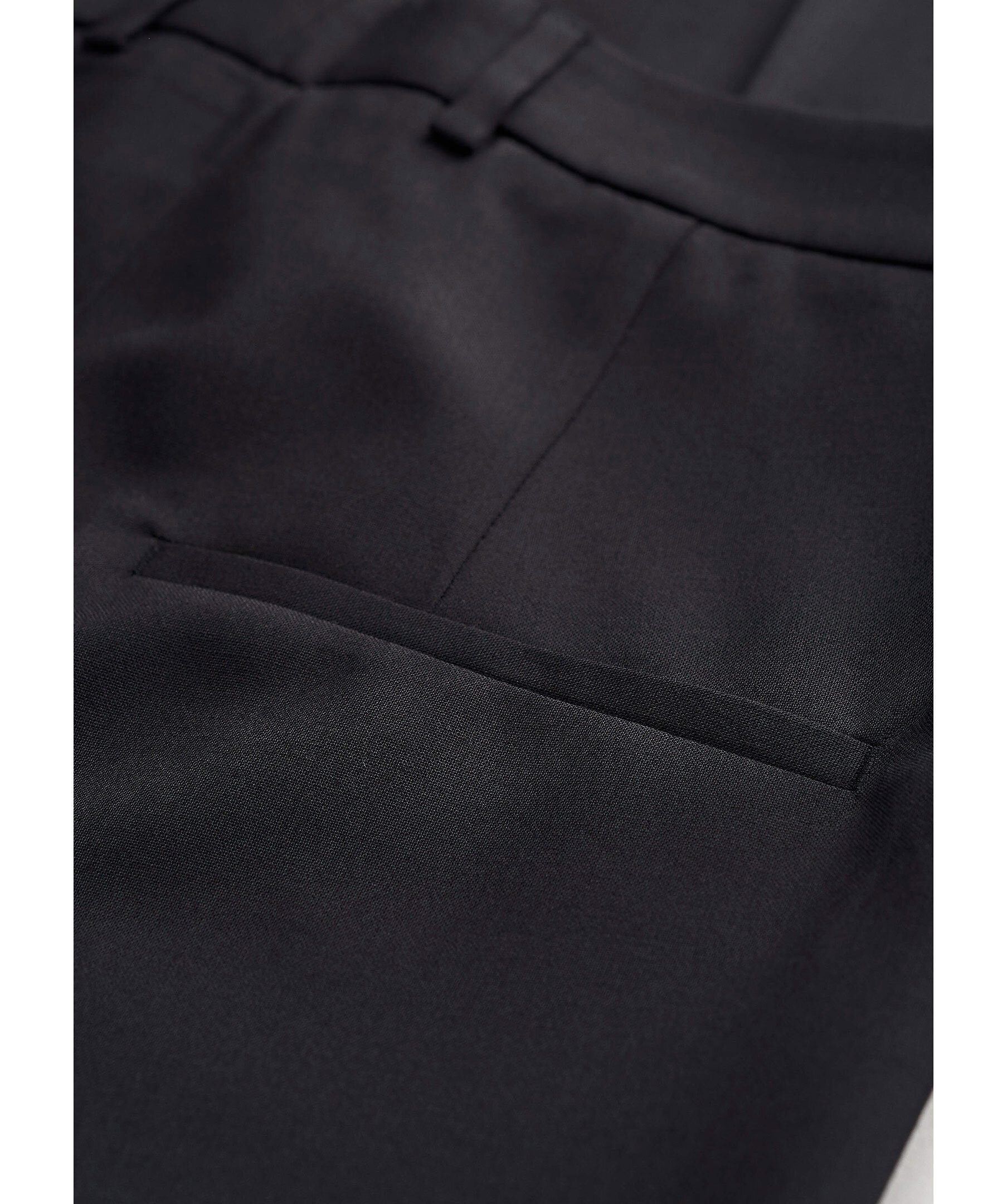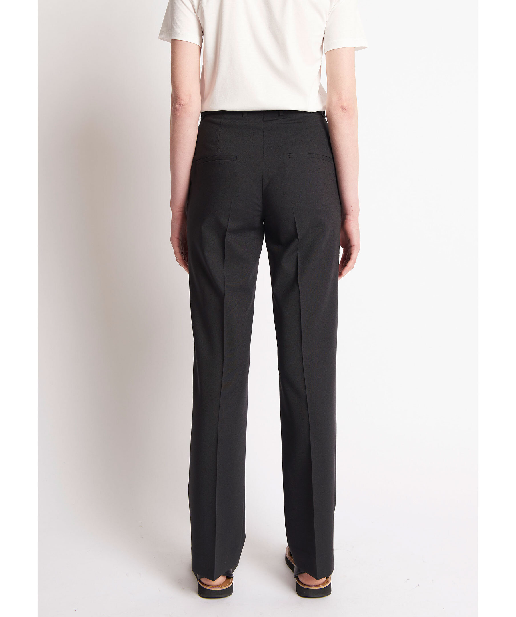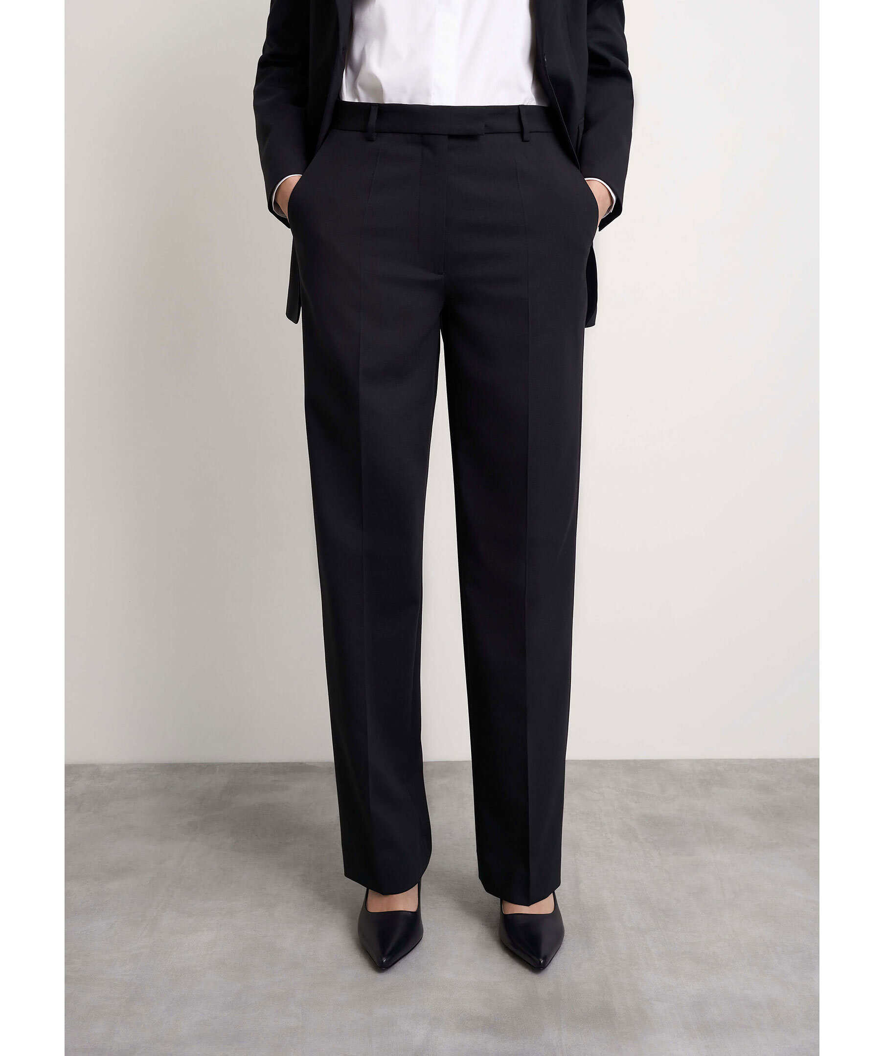 Svarta slim Straight Fit byxor i återvunnen polyester och ullstretch från Tiger of Sweden. Rynkfri och packvänlig tygkvalitet. Smal passform med raka ben och medelhög midja. Byxorna har blixtlås, hake och hyskstängning, snedställda framfickor och passpoalfickor bak.