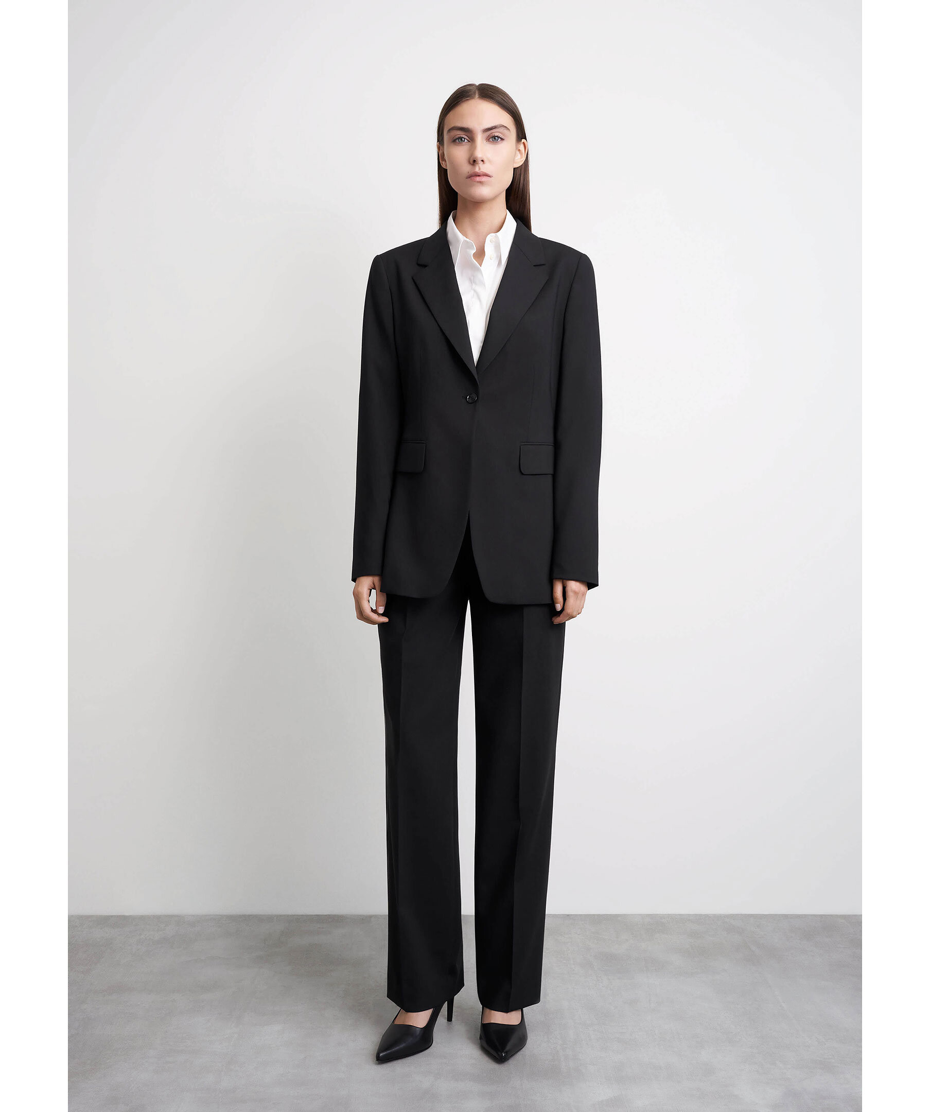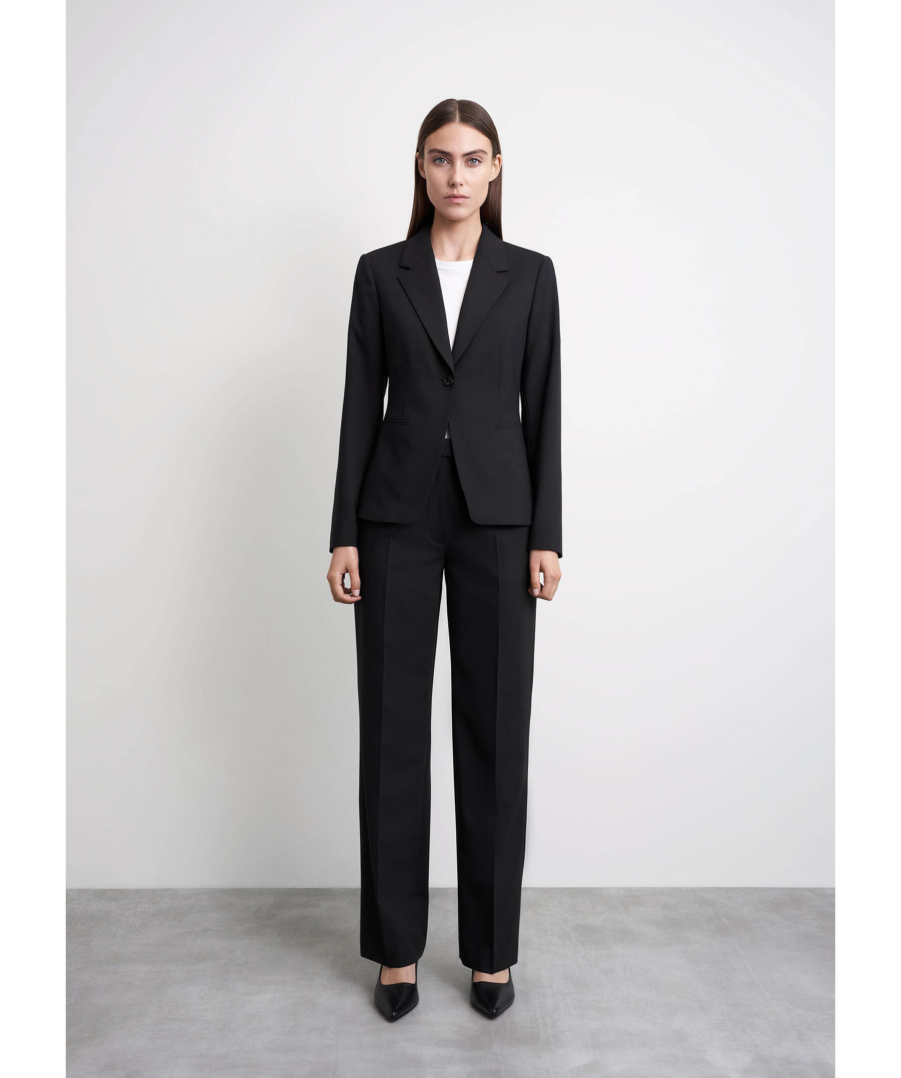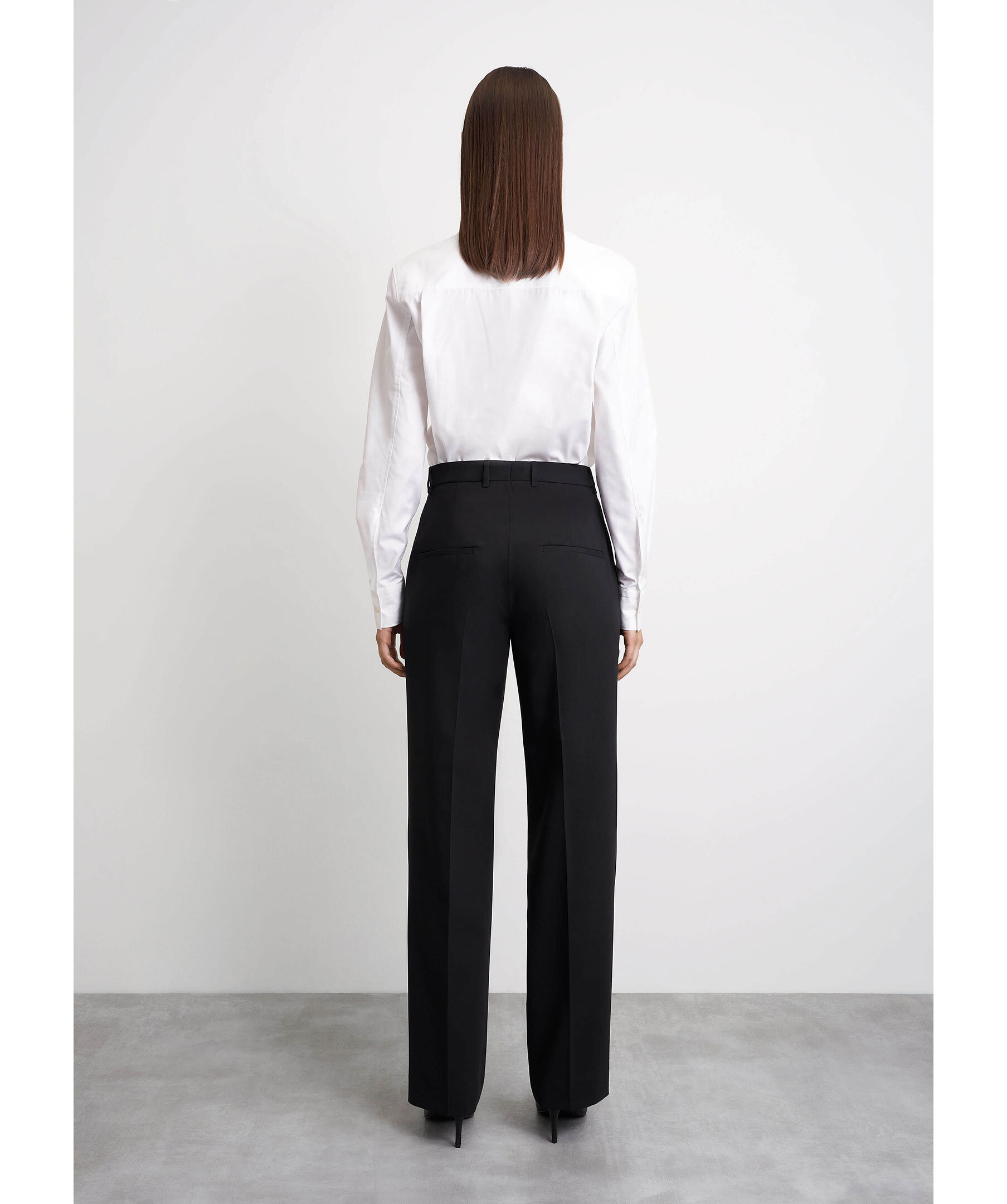Svarta slim Straight Fit byxor i återvunnen polyester och ullstretch från Tiger of Sweden. Rynkfri och packvänlig tygkvalitet. Smal passform med raka ben och medelhög midja. Byxorna har blixtlås, hake och hyskstängning, snedställda framfickor och passpoalfickor bak.