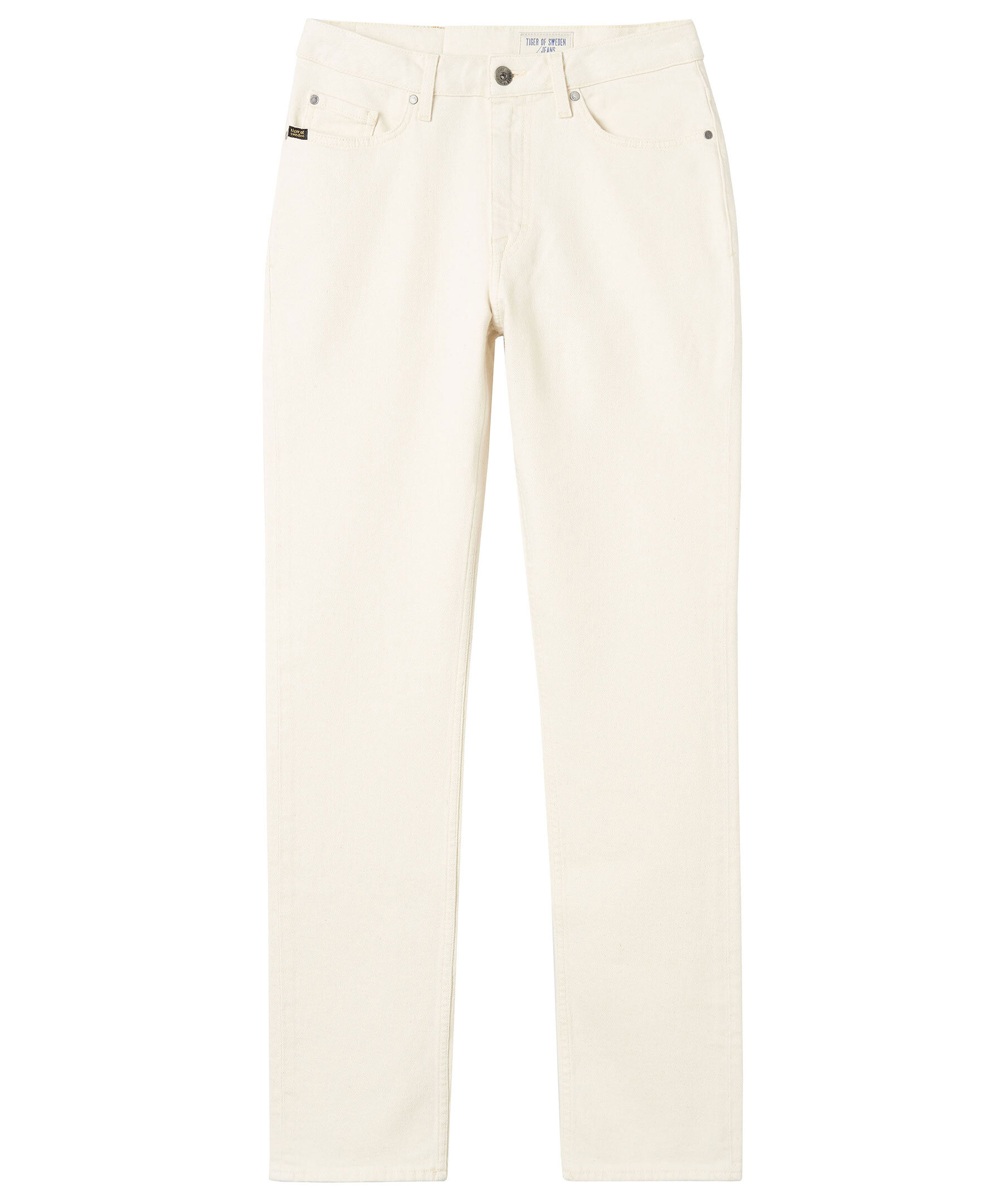 Gräddvita jeans från Tiger of Sweden. Tillverkade i stretchig bomull. Slim fit, fem fickor, hög midja med croppade och raka ben, logga på patch i midjan.