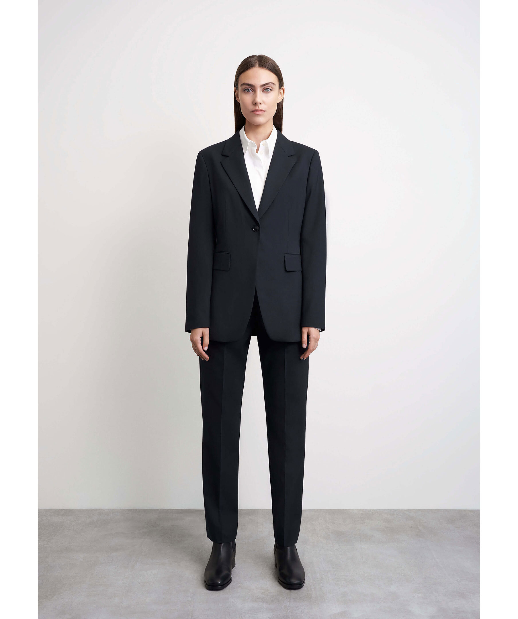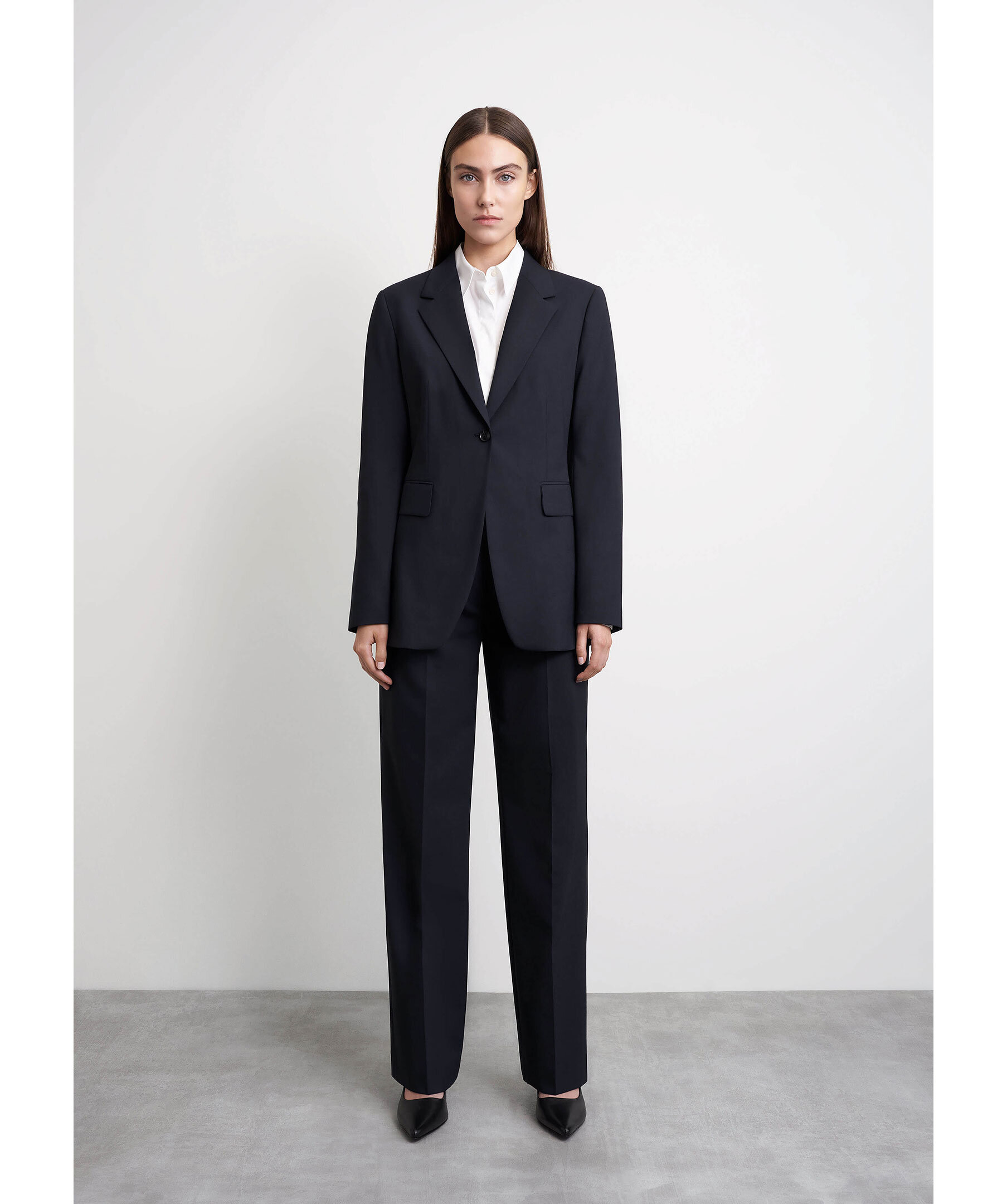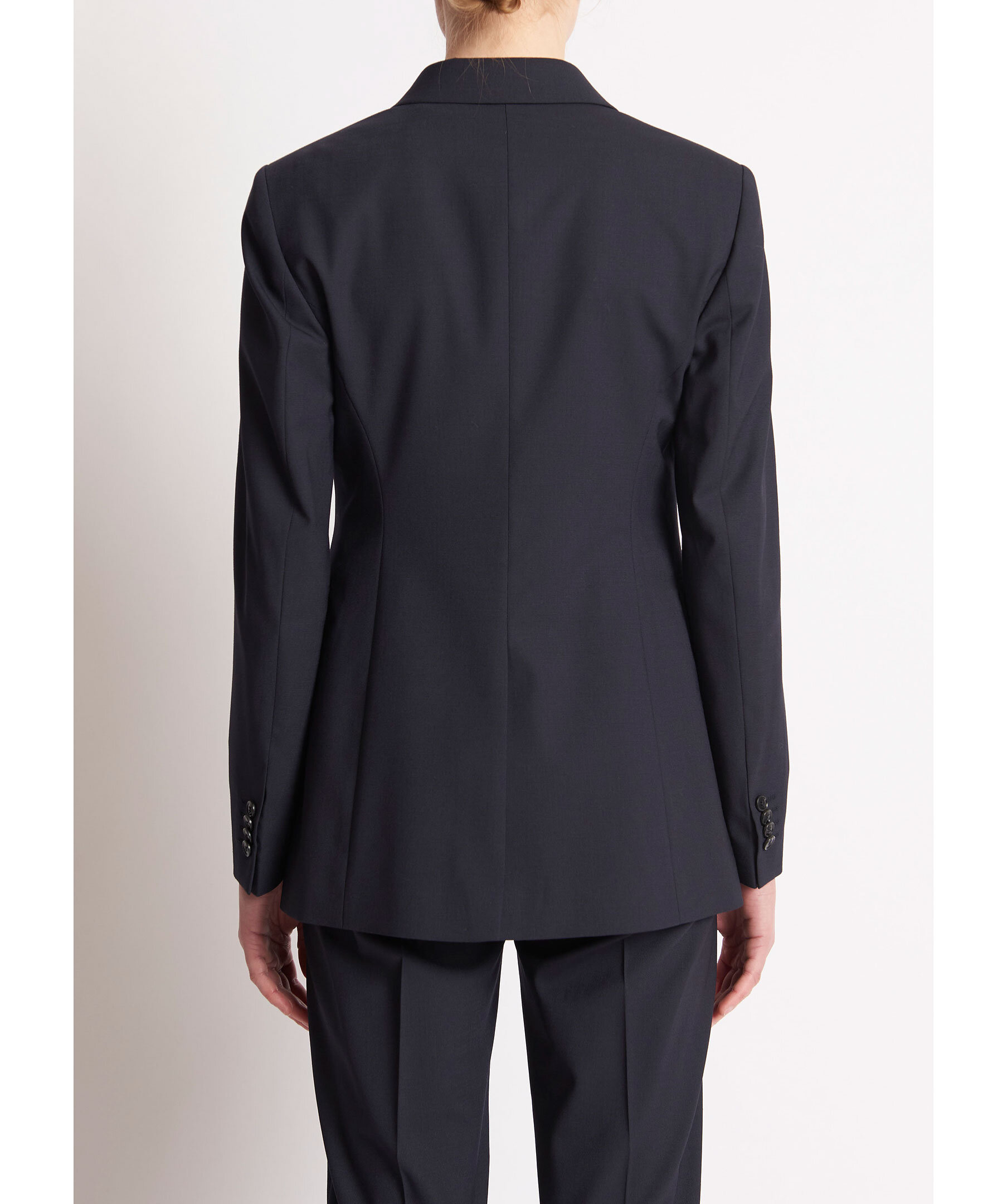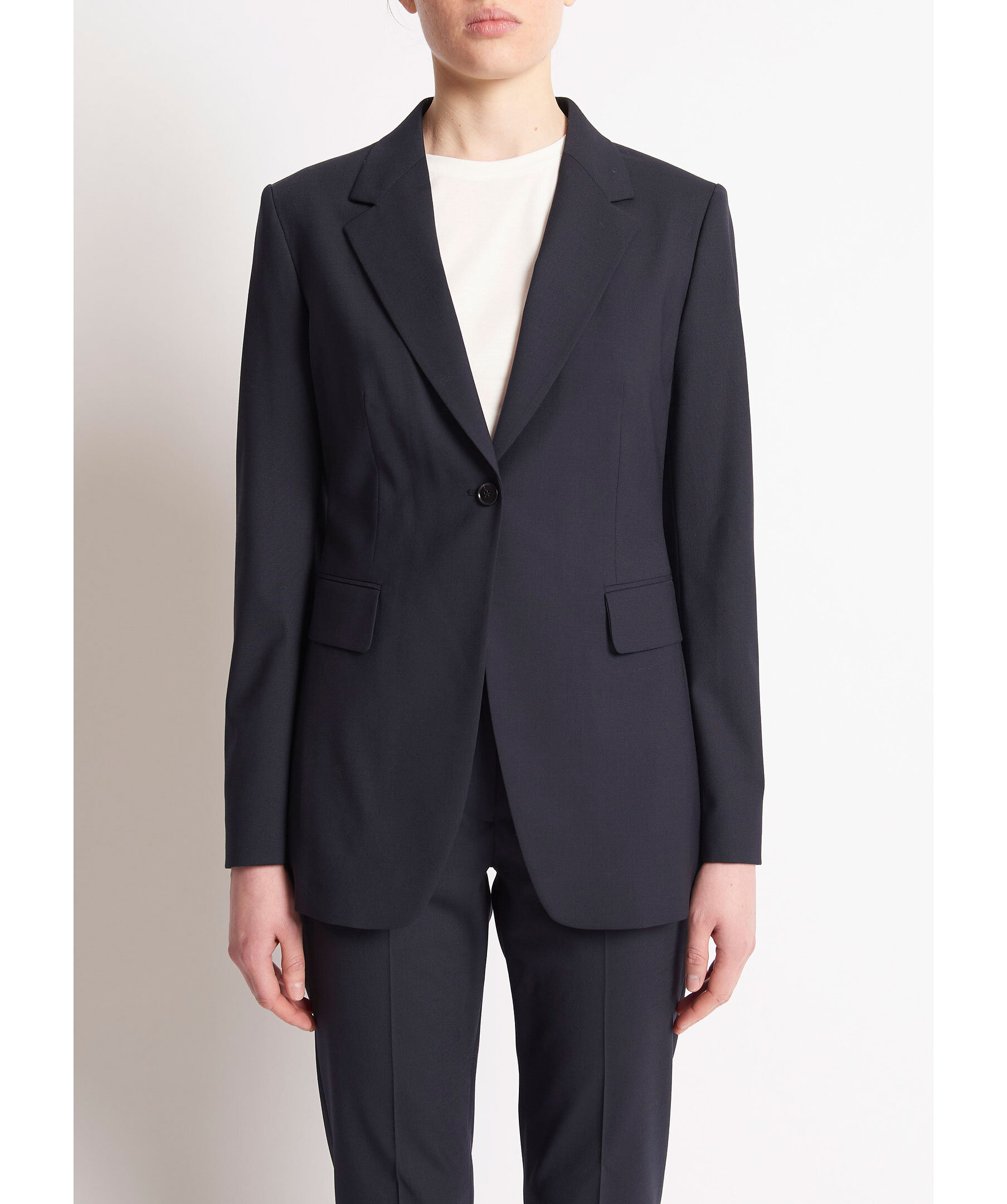 Marinblå regular Fit kavaj i återvunnen polyester och ullstretch från Tiger of Sweden. Rynkfri och packvänlig tygkvalitet. Normal passform, längd nedanför höften och skårad krage. Enknapps stängning fram, knappar vid ärmslut och framfickor med lock. Filtdetalj under kragen, enkel sprund bak och helt fodrad.