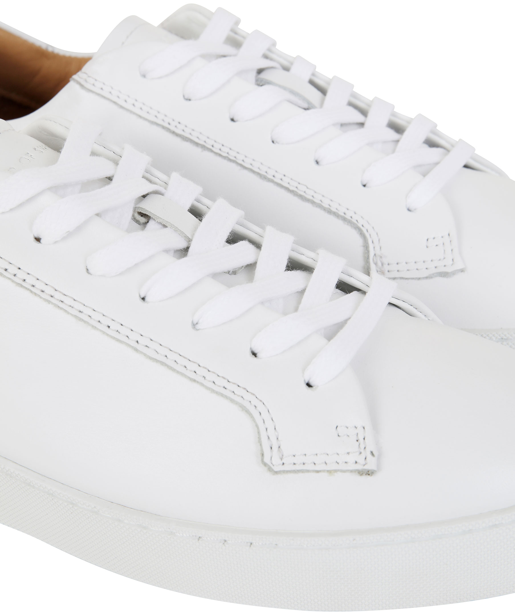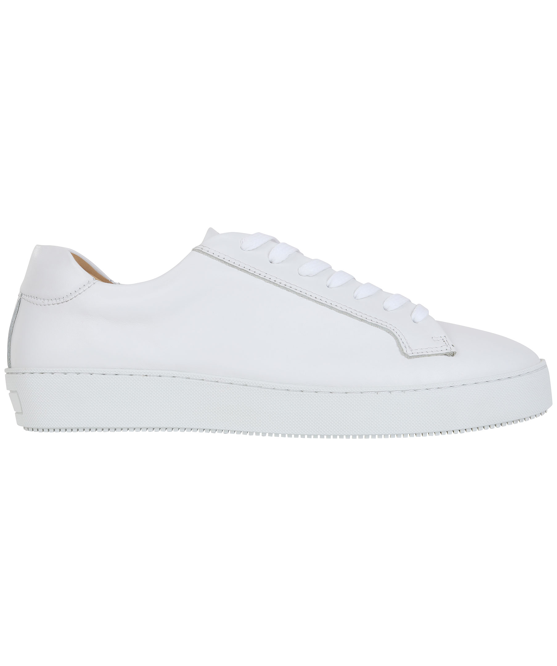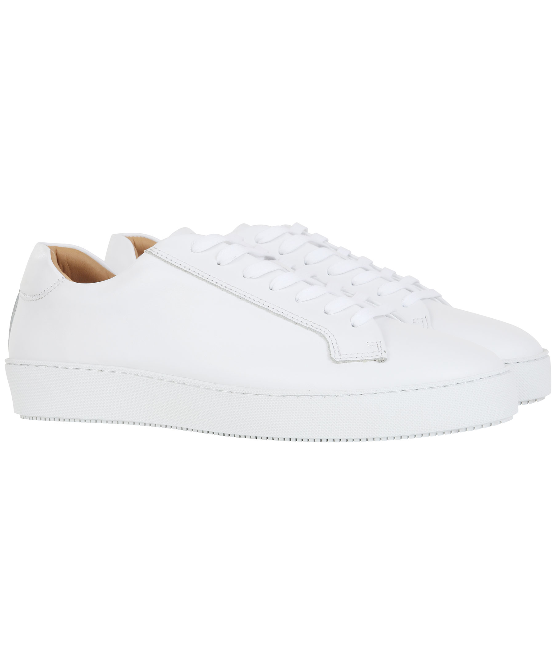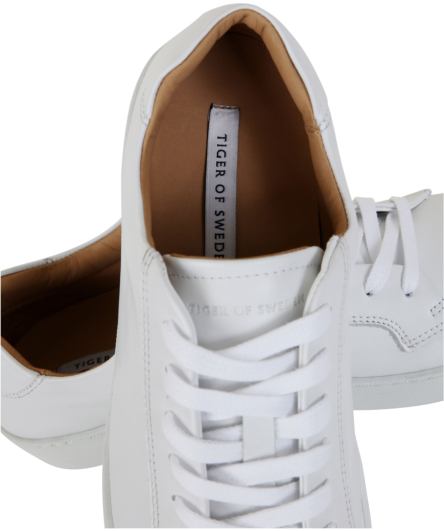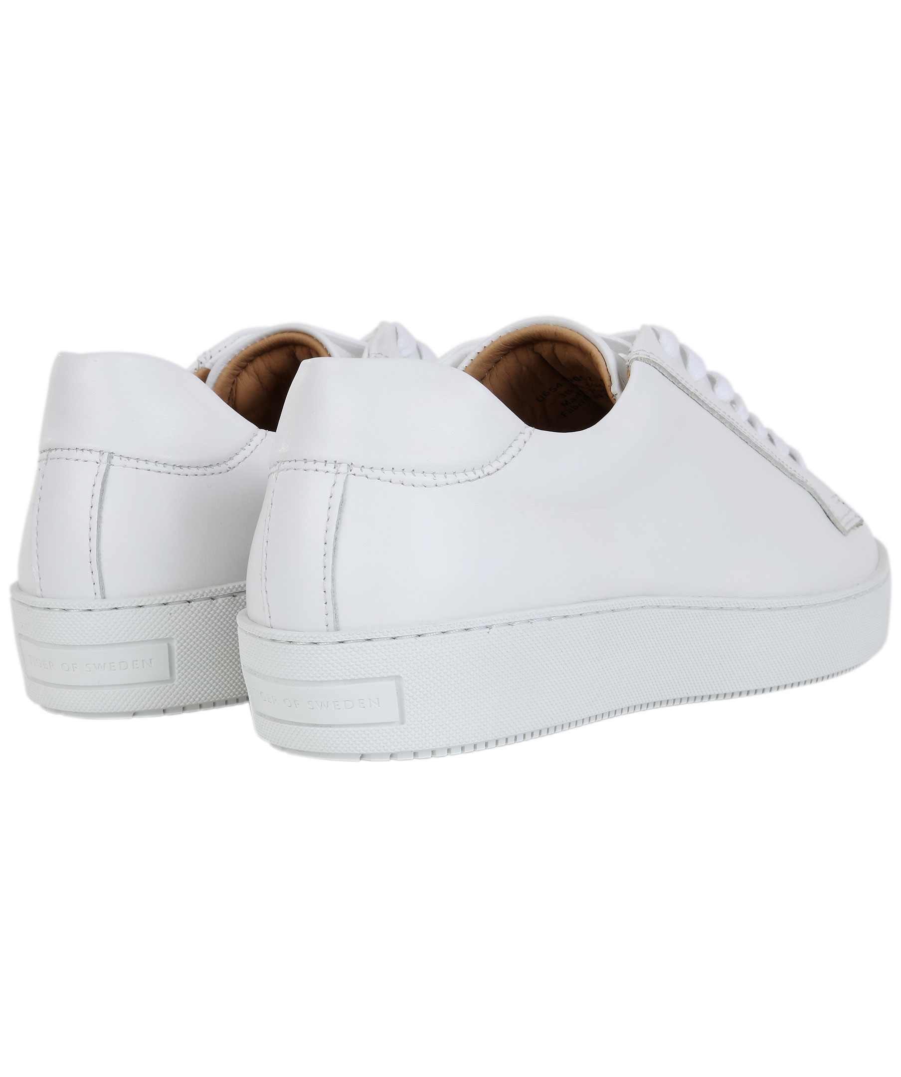Vita skinn sneakers från Tiger of Sweden. Diskret logga på skornas plös och en logga på skornas häl. Gummisula och vit snörning.