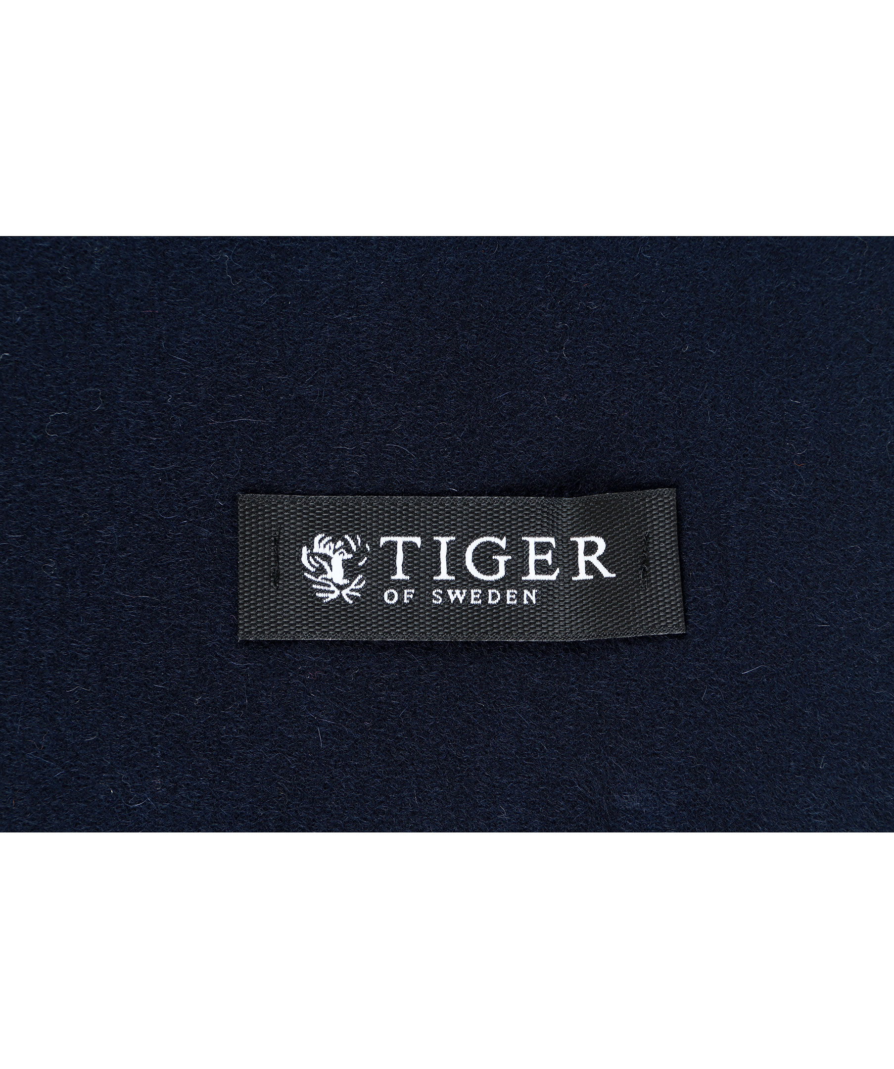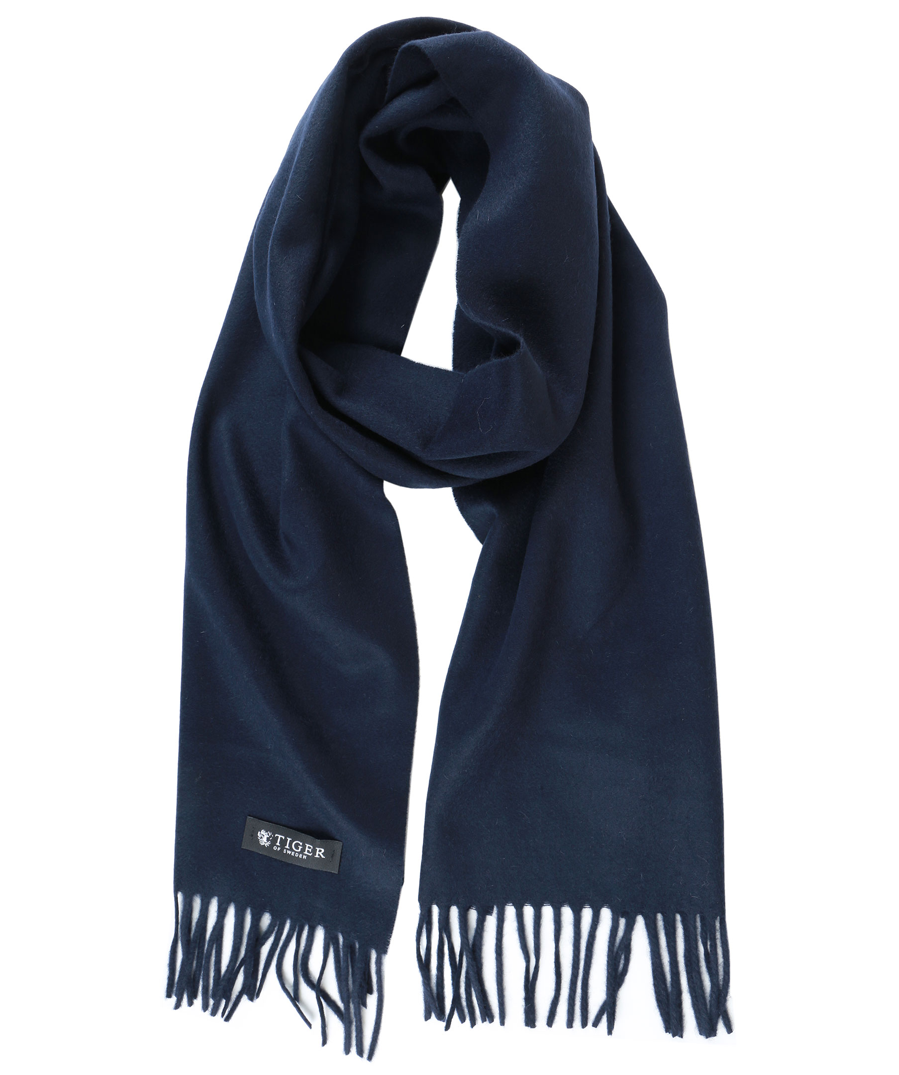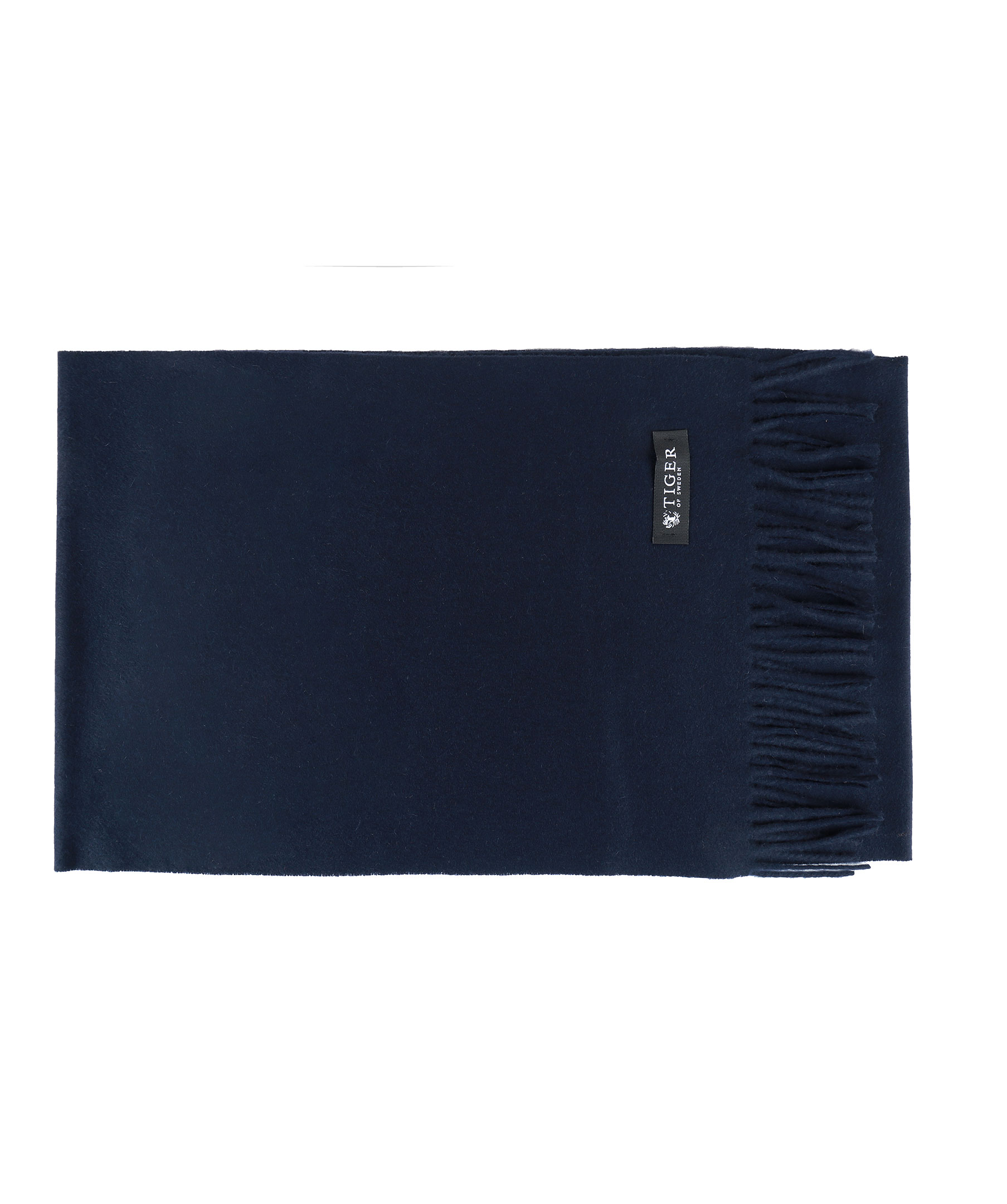 Marinblå halsduk från Tiger of Sweden. Fransar i kanterna. Gjord i ull och kashmir.