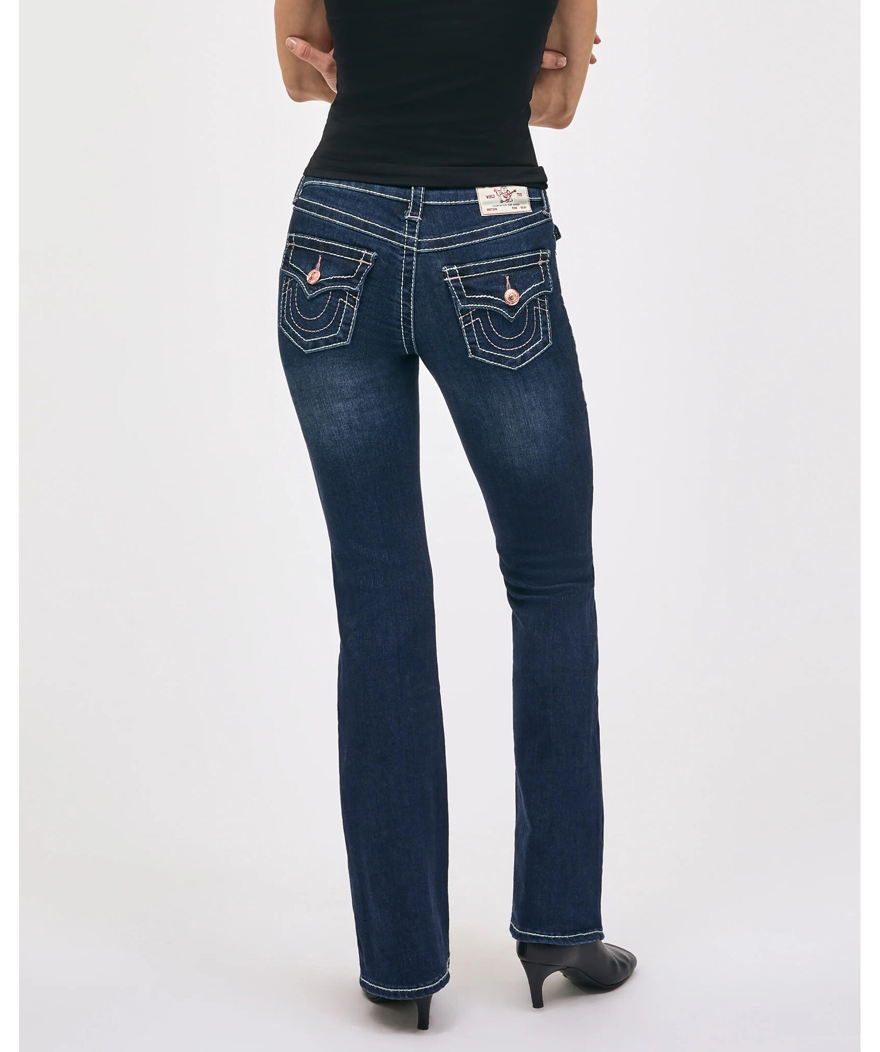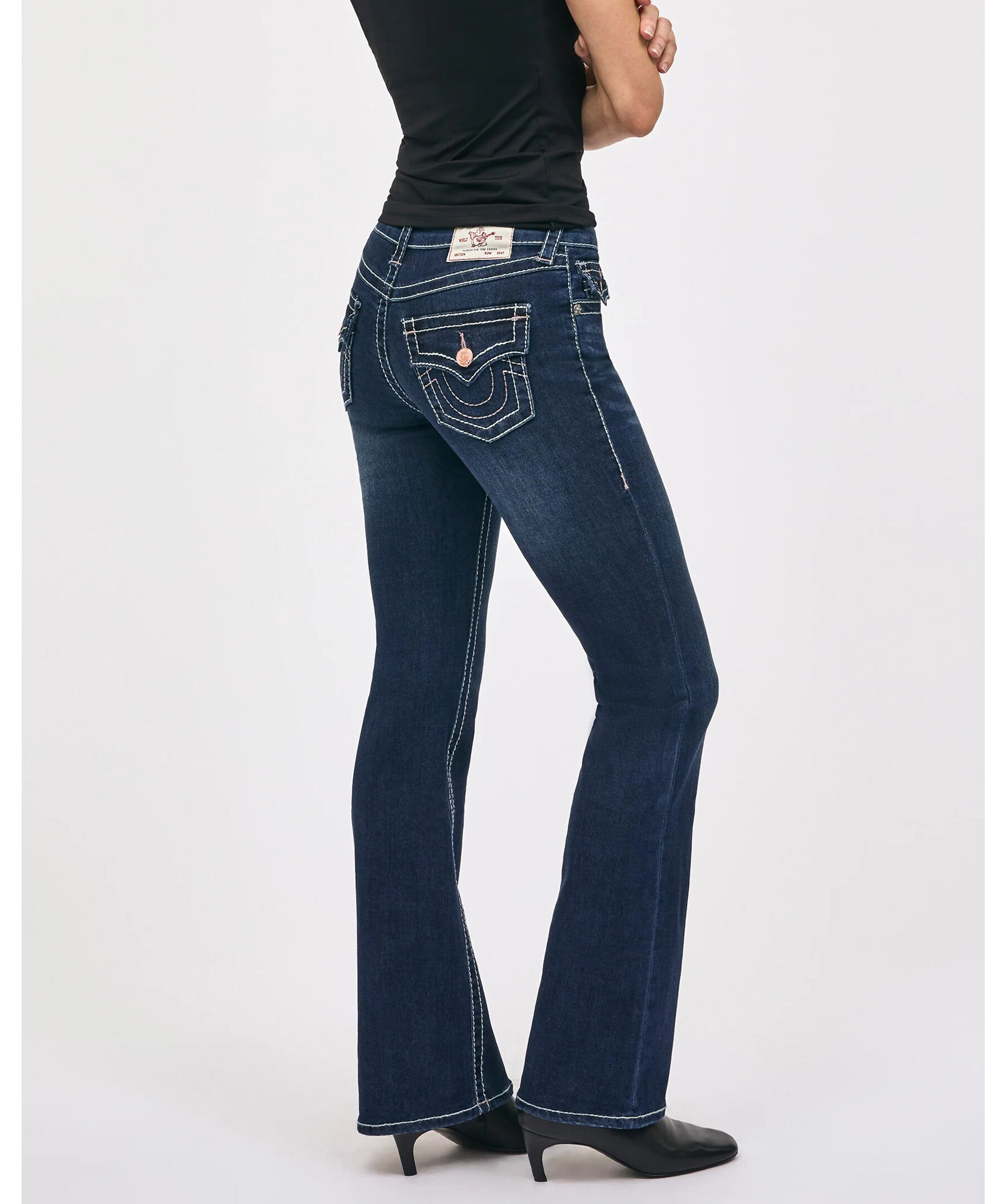 Becca bootcut‑jeans från True Religion i färgen Dark Stone Fox med medelhög midja och klassisk femficksdesign. Jeansens flared form och stretchiga denim ger en smickrande silhuett, medan dekorativa bakfickor med fåll och kontrastsömmar ger en ikonisk True Religion‑look som fungerar lika bra till vardag som kväll.
