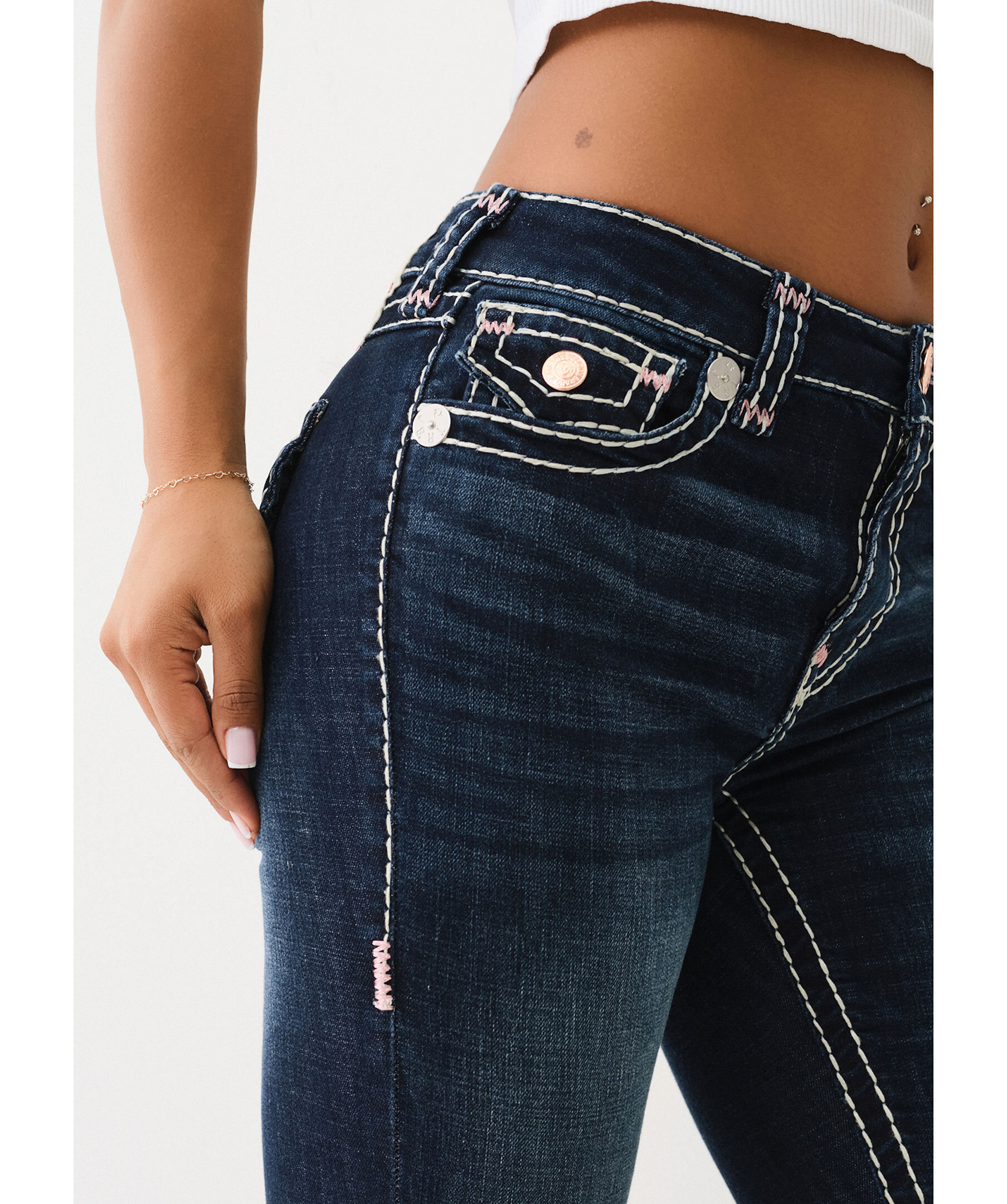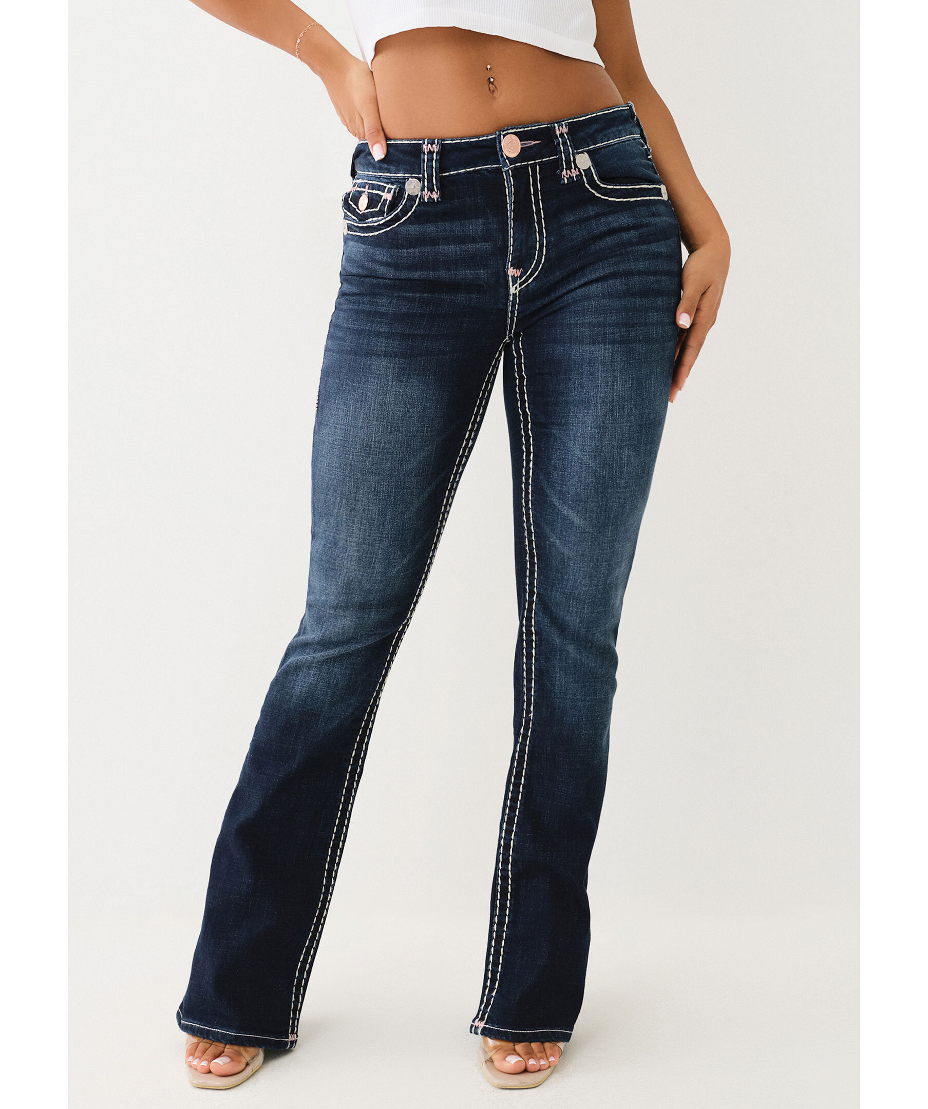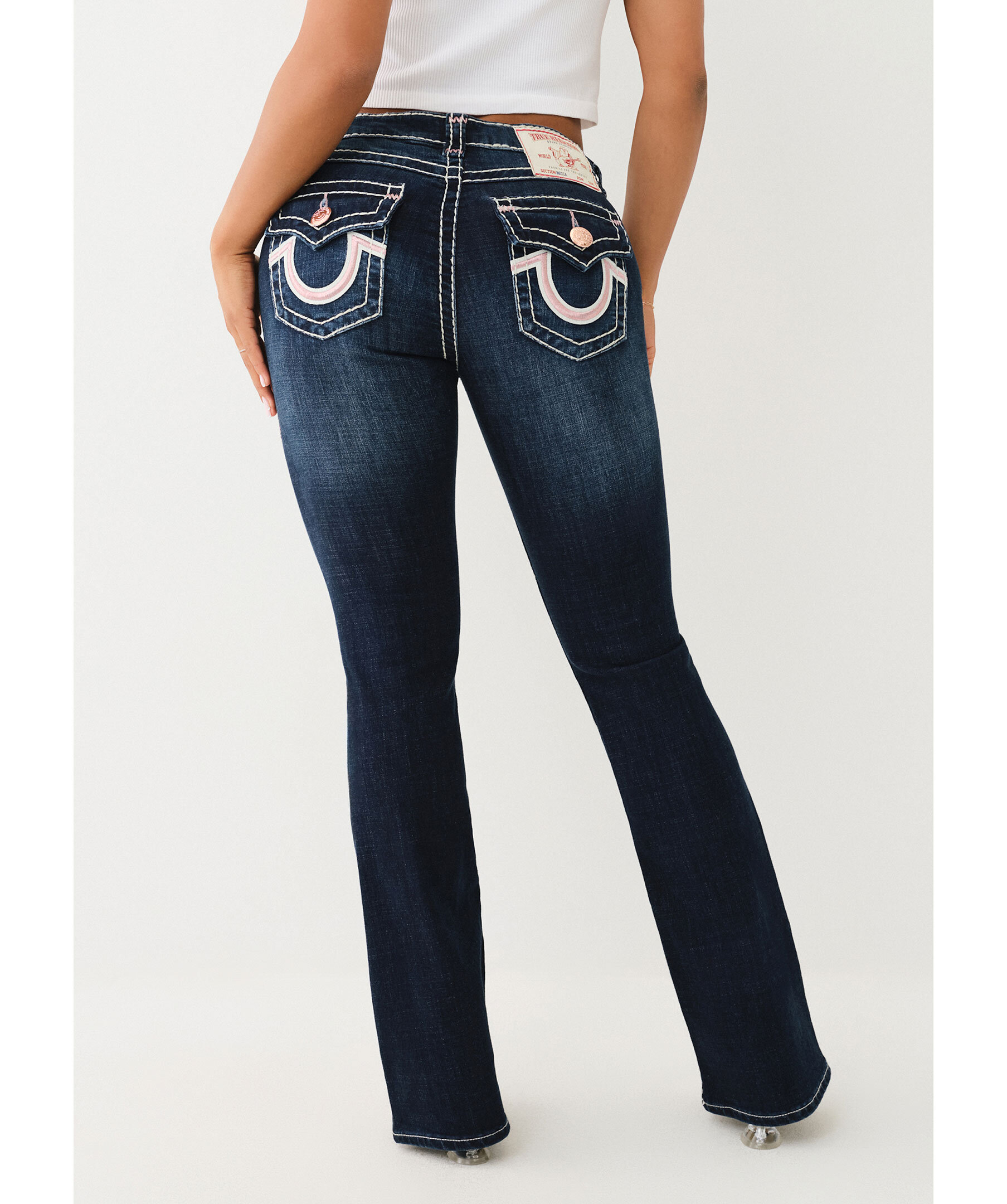 Mörkblåa bootcut jeans från True Religion. Jeansen har en mellanhög midja med bälteshällor, gylf med dragkedja, vita sömmar, tvåfärgad hårdvara och rosa lurex Super T-sömmar. Avslutad med präglade hästskodetaljer på bakfickorna med lock. Tillverkade i en bomullsblandning.
