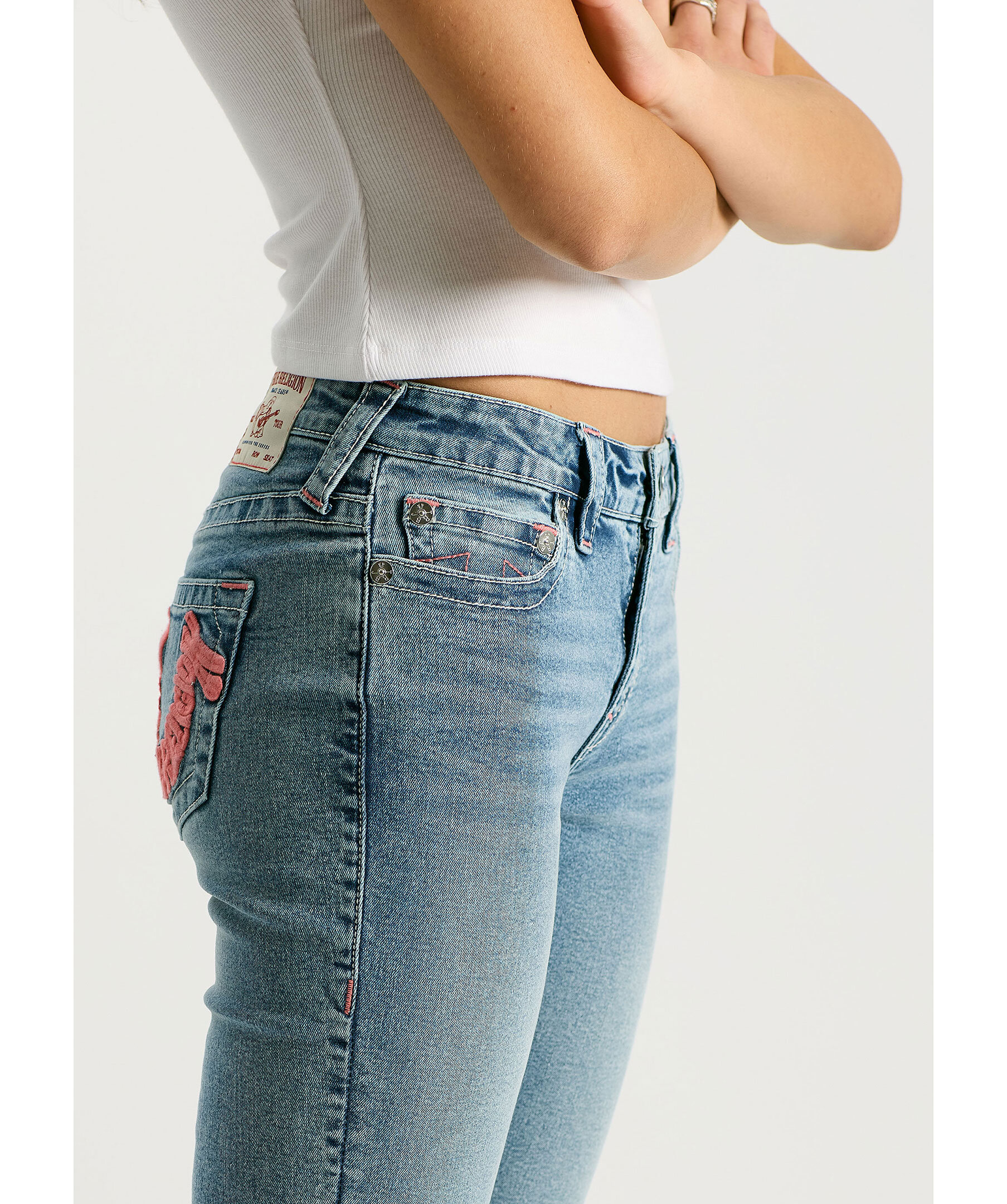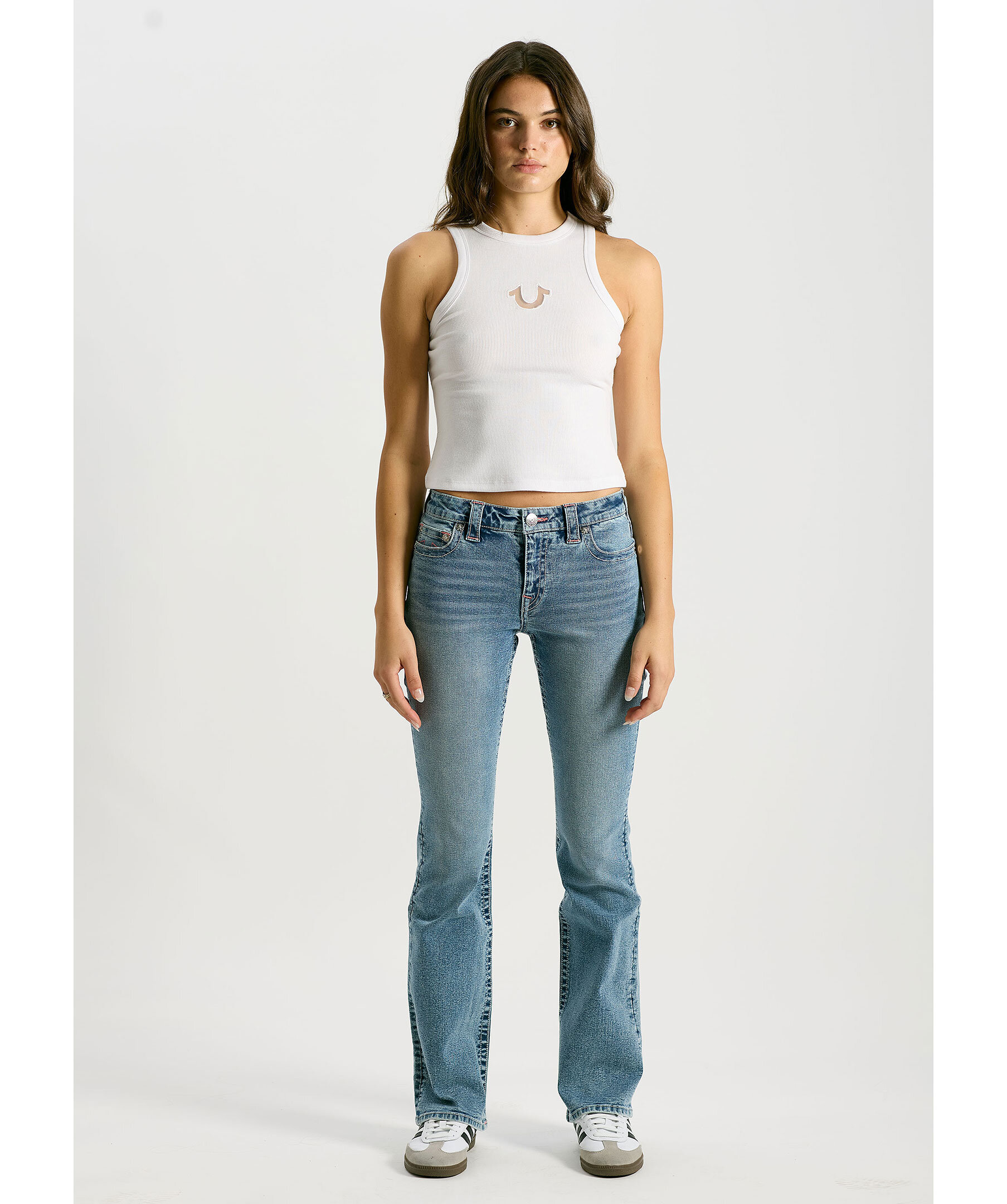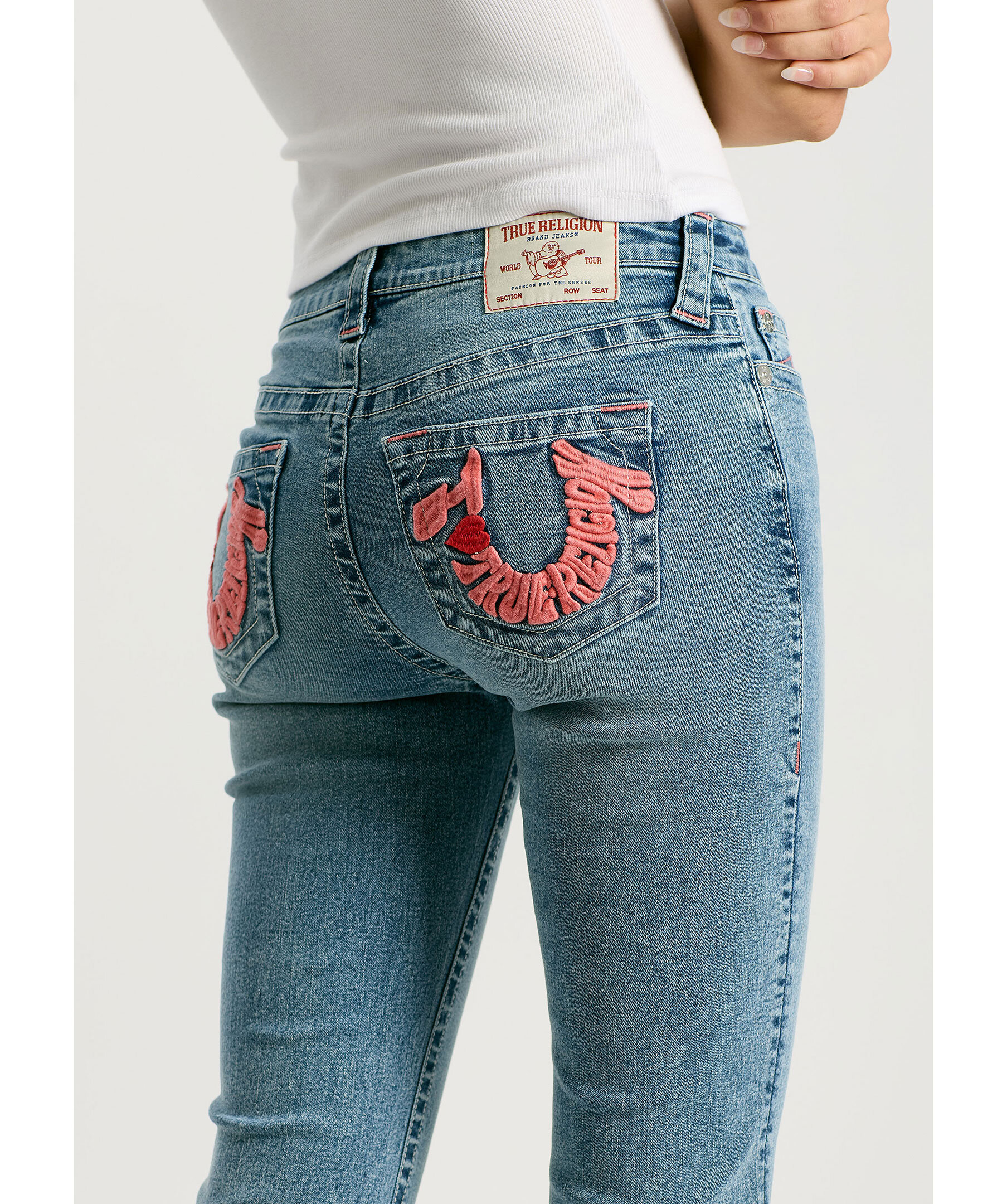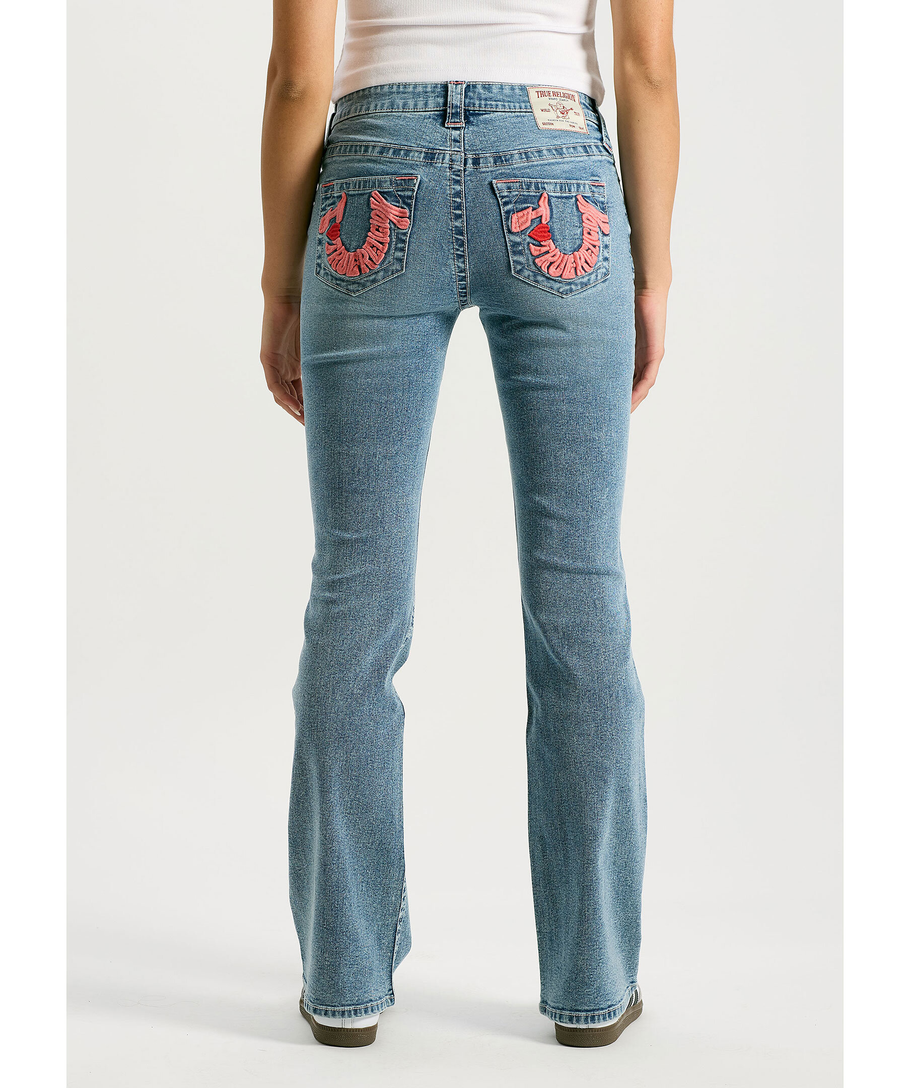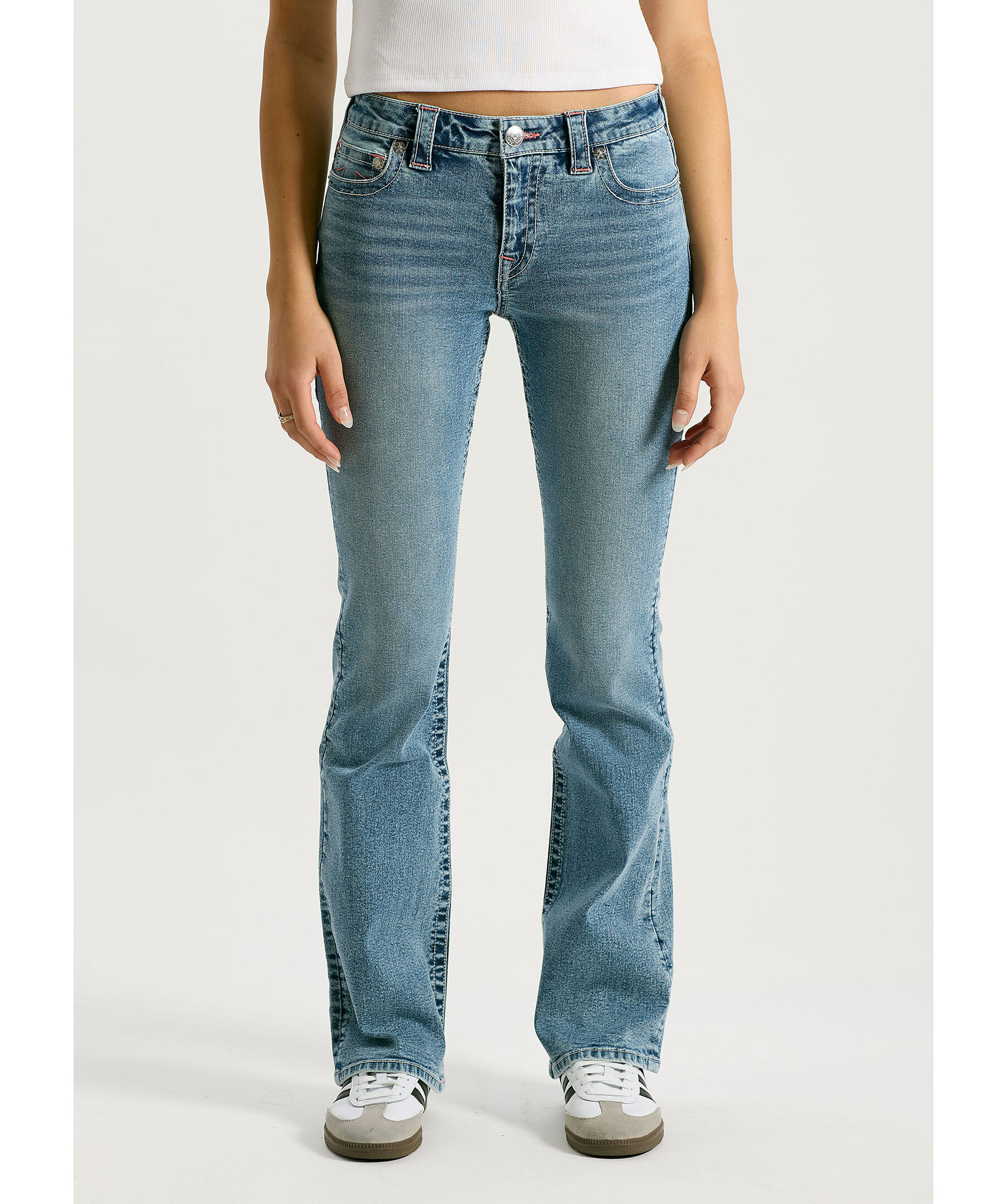 Blåa bootcut jeans från True Religion. Jeansen har en mellanhög midja med bälteshällor, fem fickor, samt broderad "I love True Religion" på bakfickorna. tillverkade i en bomullsblandning.