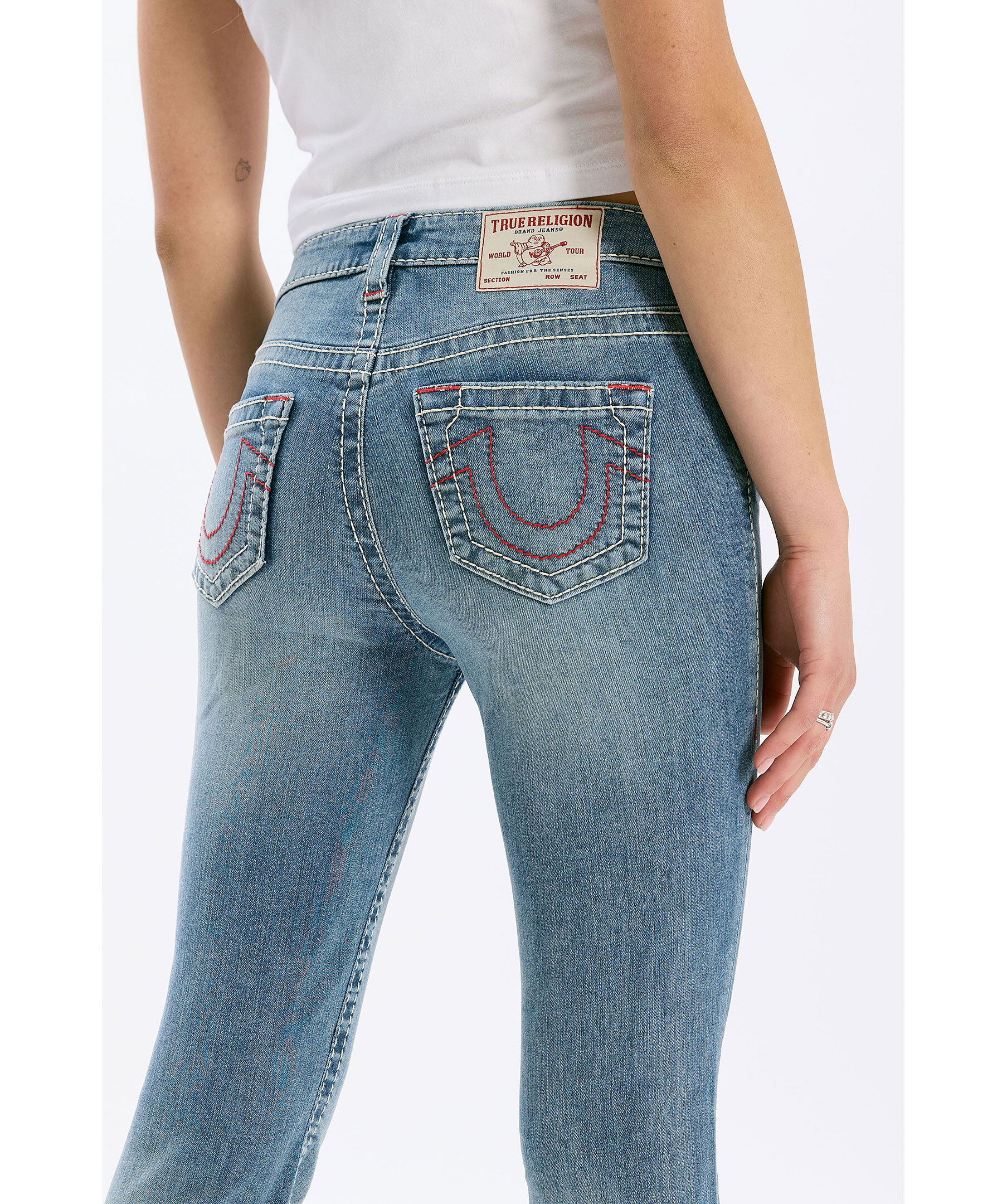 Blåa jeans från True Religion i bootcut modell. Mellanhög midja med bälteshällor. Två framfickor och en liten myntficka samt två bakfickor. Subtil blekning och flerfärgade sömmar. Hästsko formade sömmar på bakfickorna. Tillverkade i en bomullsblandning.