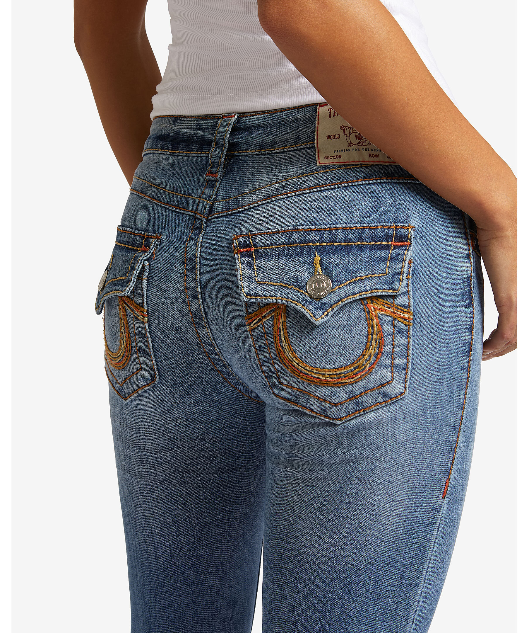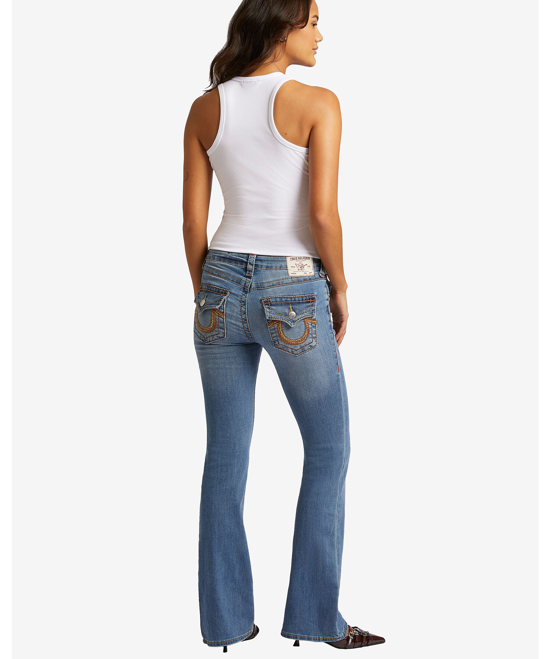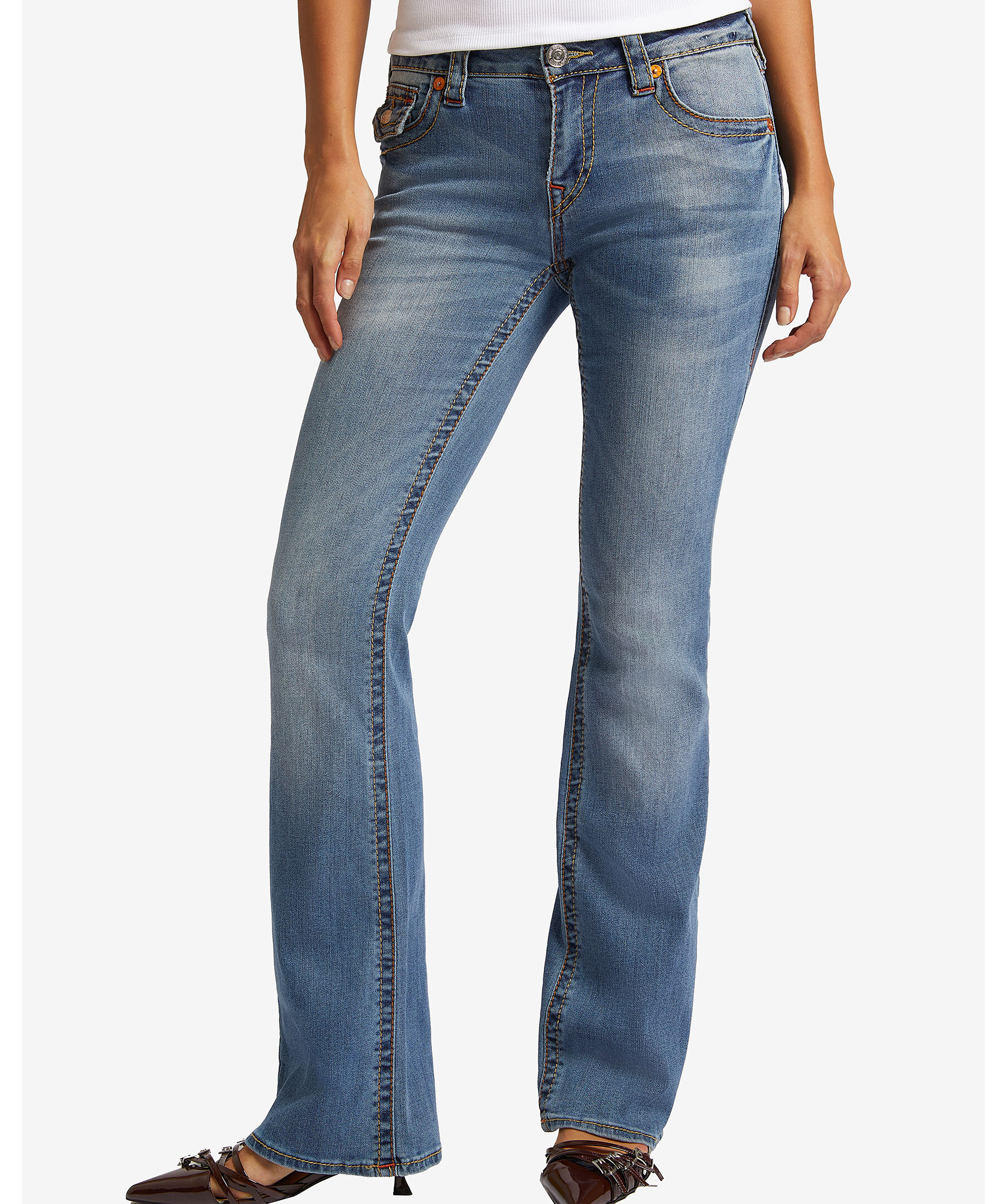Jeans i färgen medium wash från True Religion i bootcut modell. Mellanhög midja med bälteshällor. Två framfickor och en liten myntficka med knapp samt två bakfickor med lock och knapp. Subtil blekning och flerfärgade sömmar. Hästsko formade sömmar på bakfickorna. Tillverkade i en bomullsblandning.