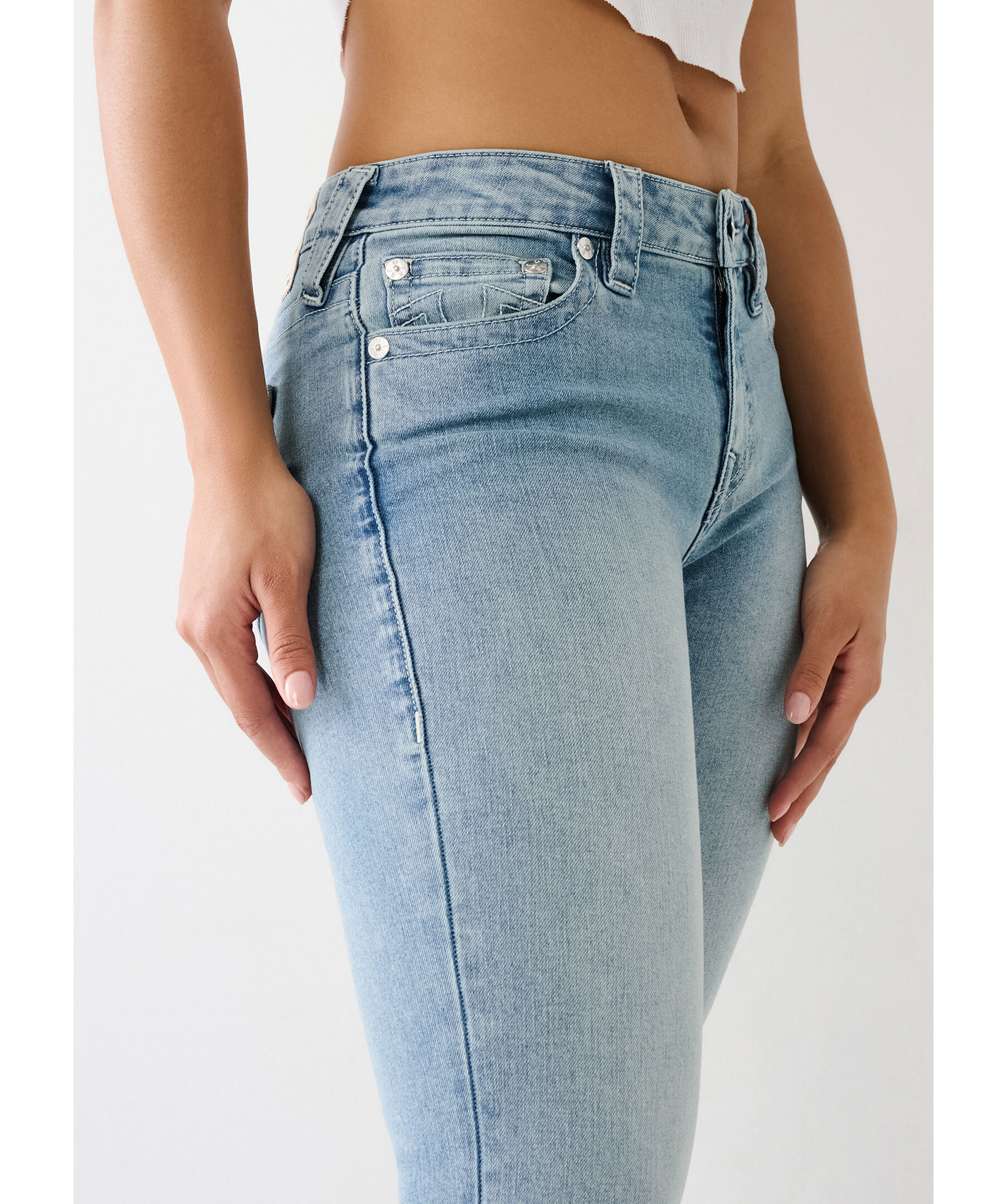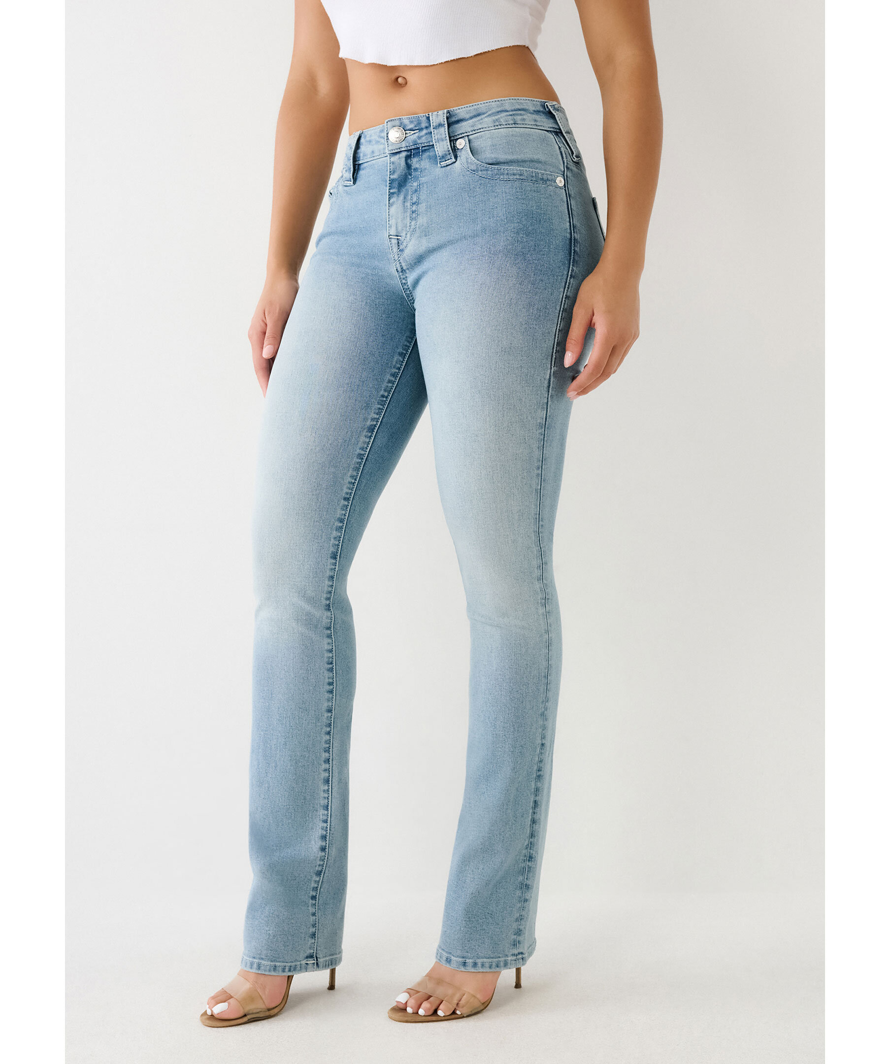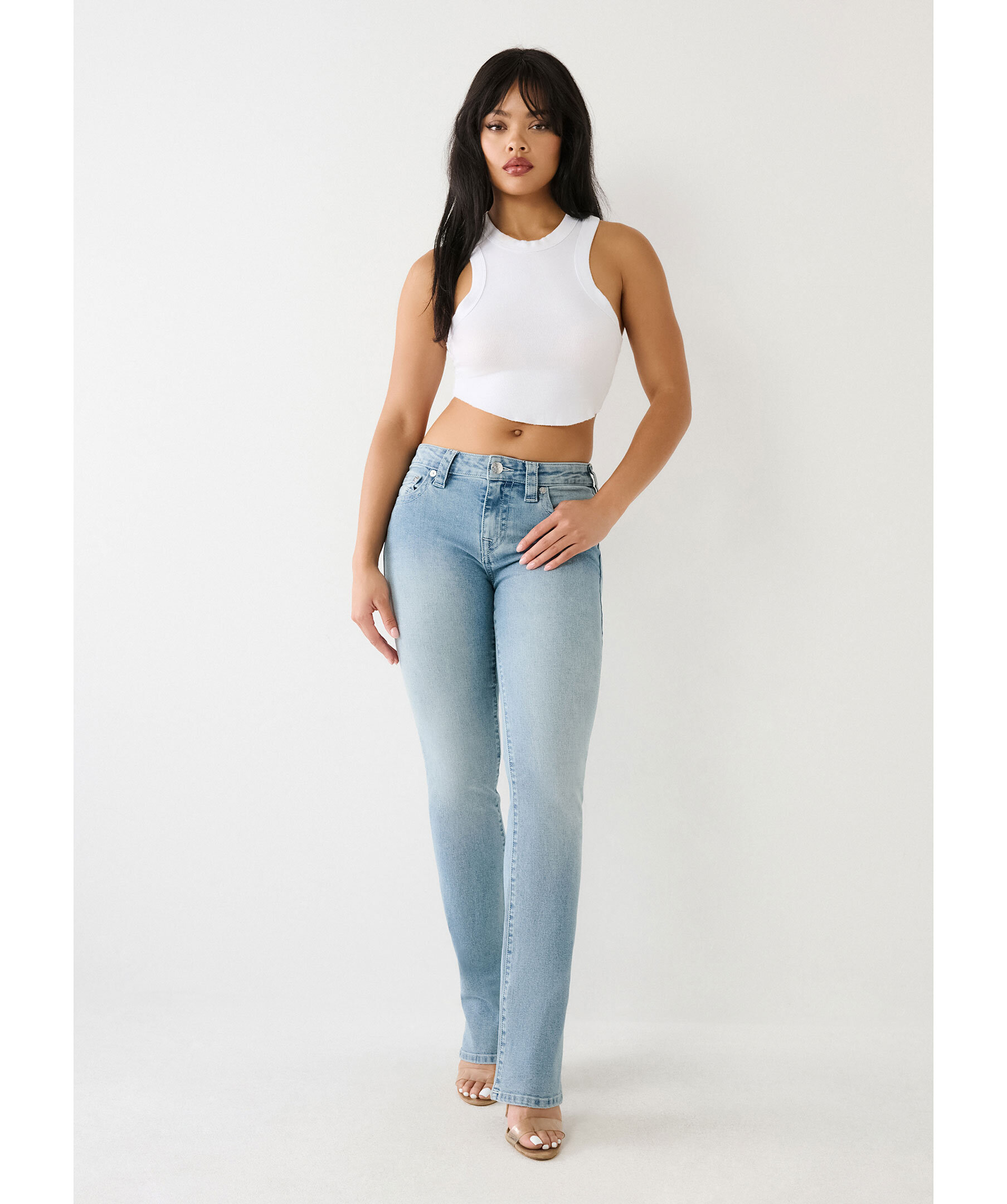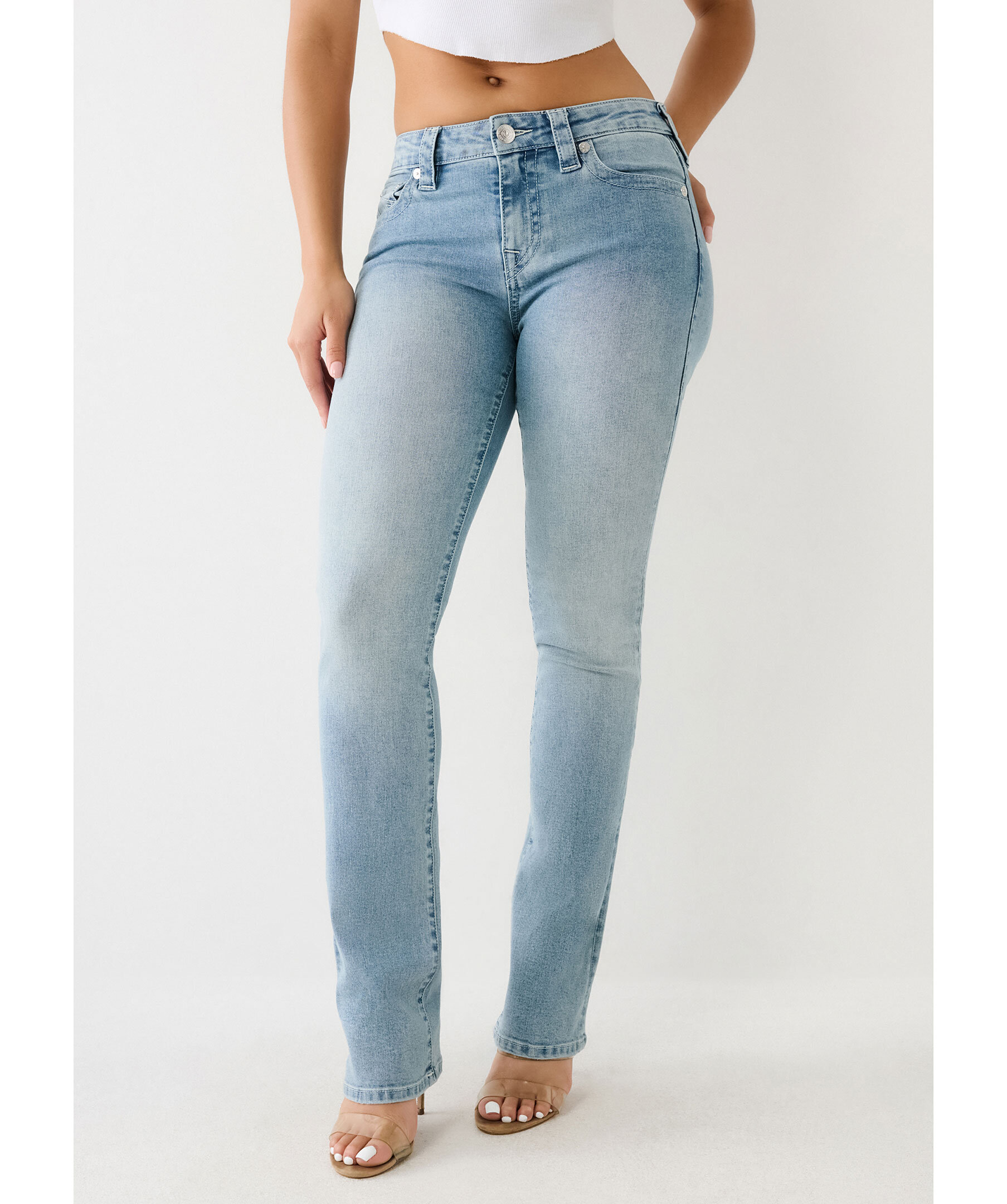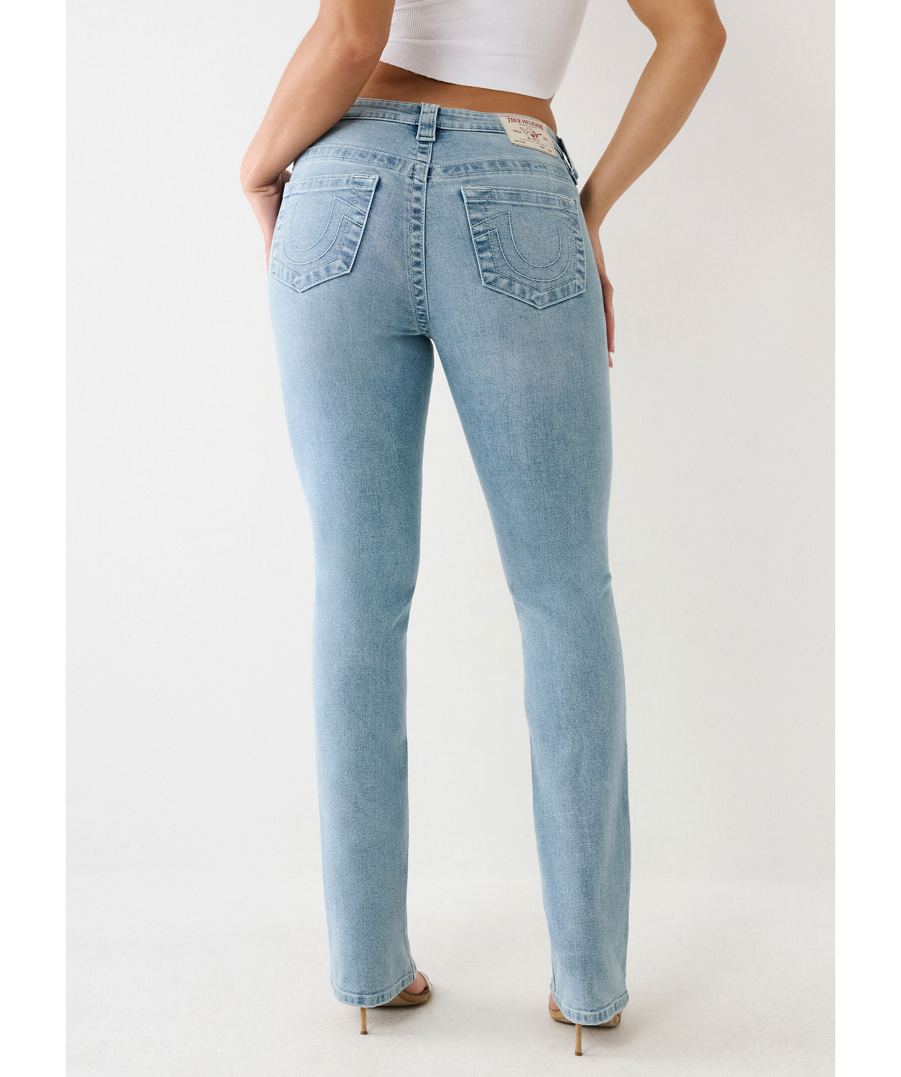 Ljusblå jeans i rak modell från True Religion. Fem fickor varav tre har broderade detaljer. Hällor för bälte. Patch i läder med tryckt logotyp baktill på höger sida.
