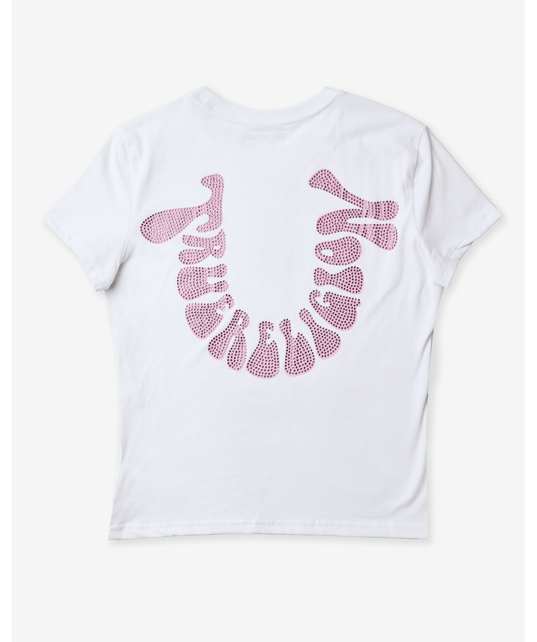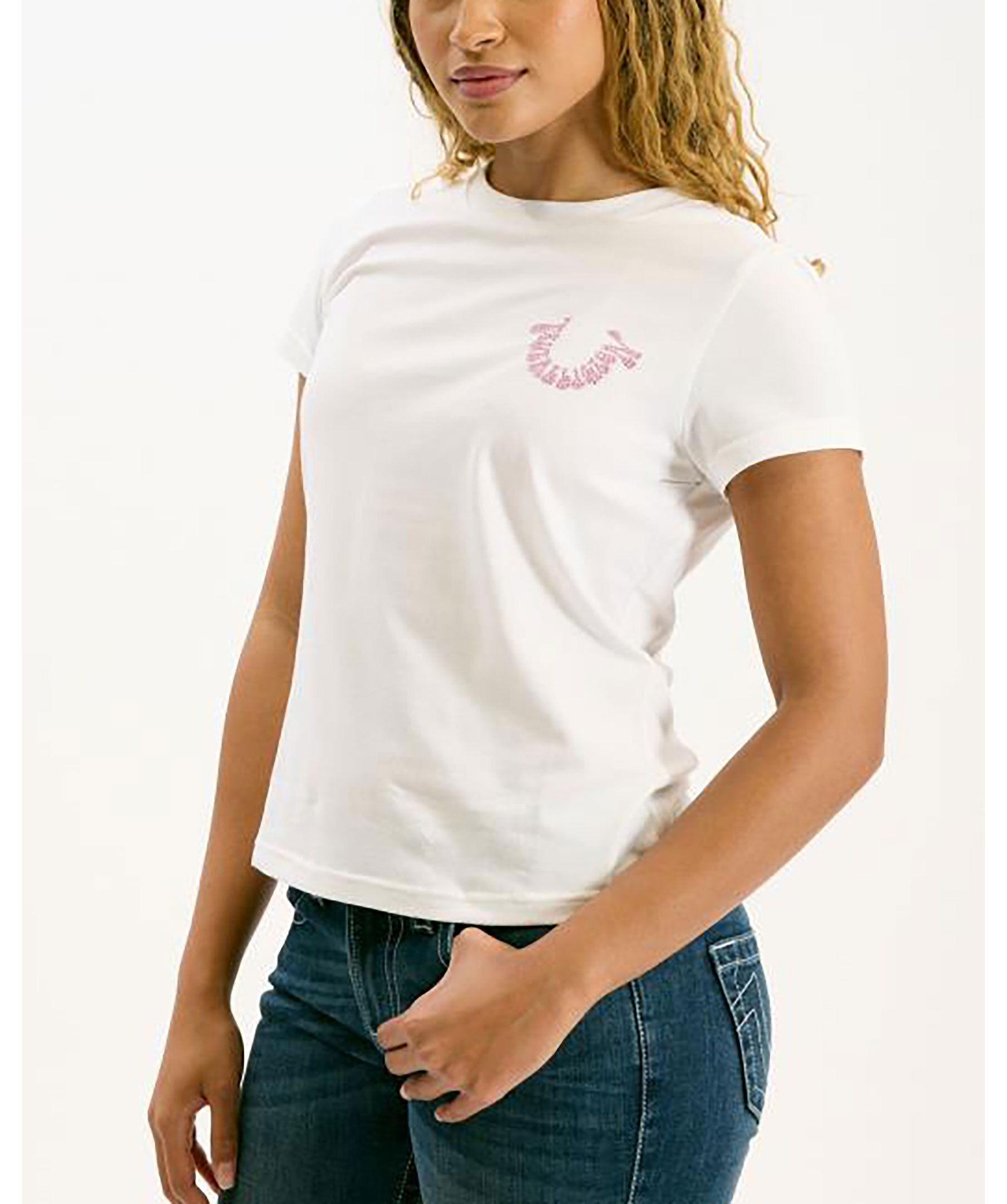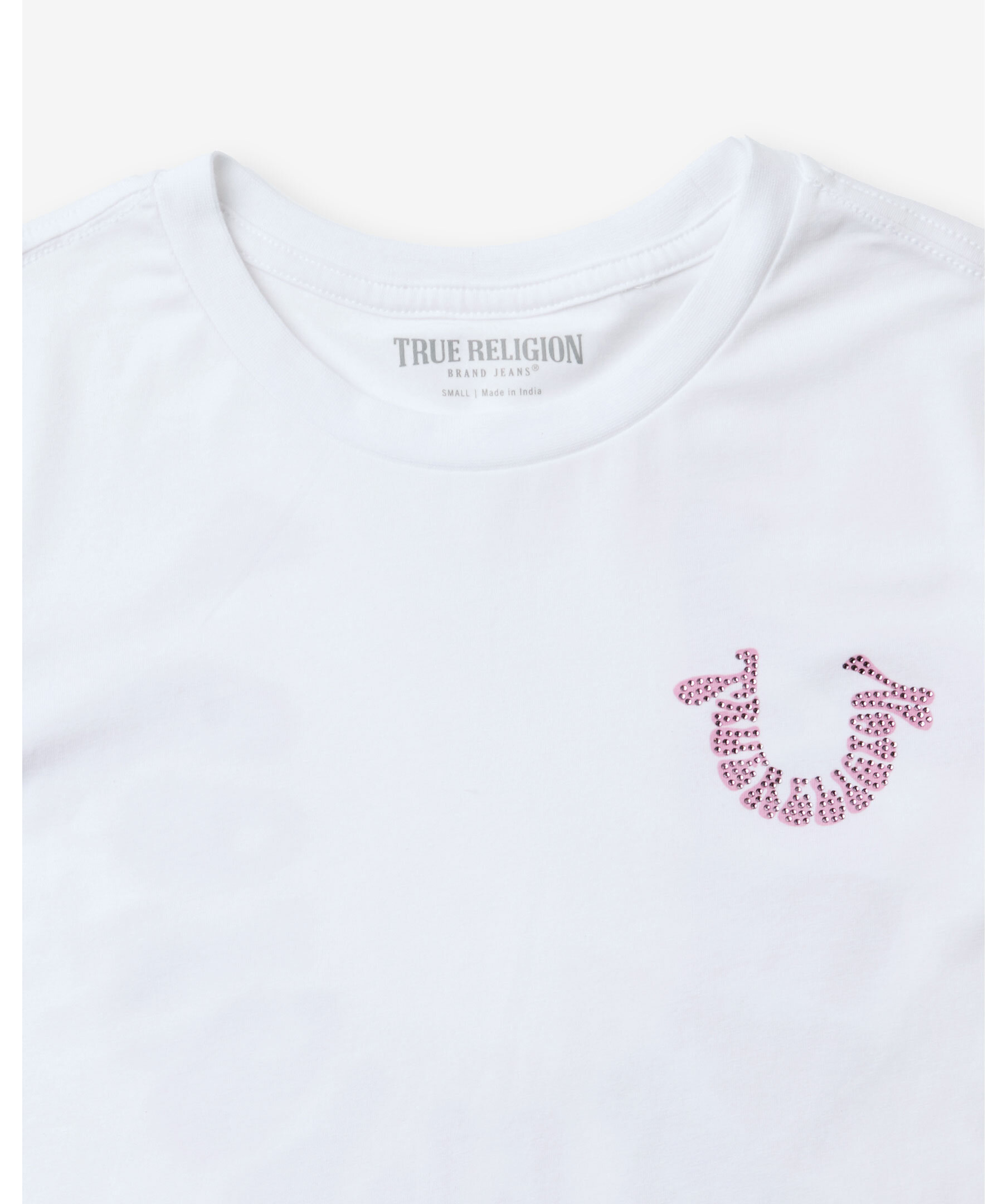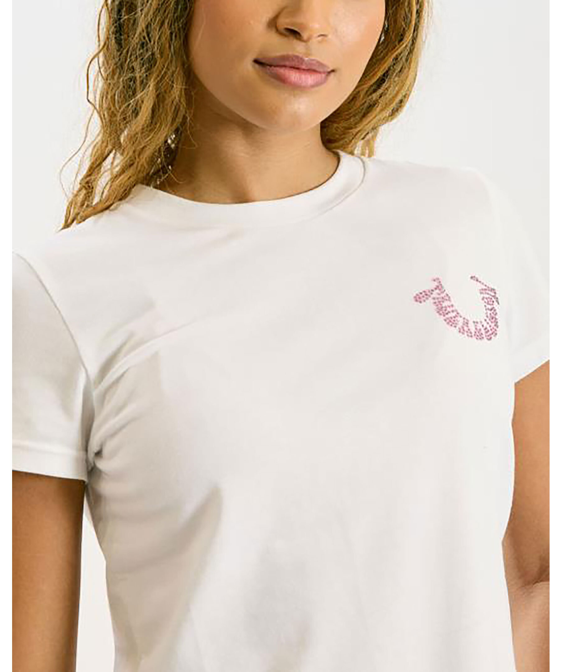 Vit t-shirt från True Religion. T-shirten har rundad halsringning och en rosa hästsko-logotyp med strasstenar på bröstet. Tillverkad i en bomullsblandning.