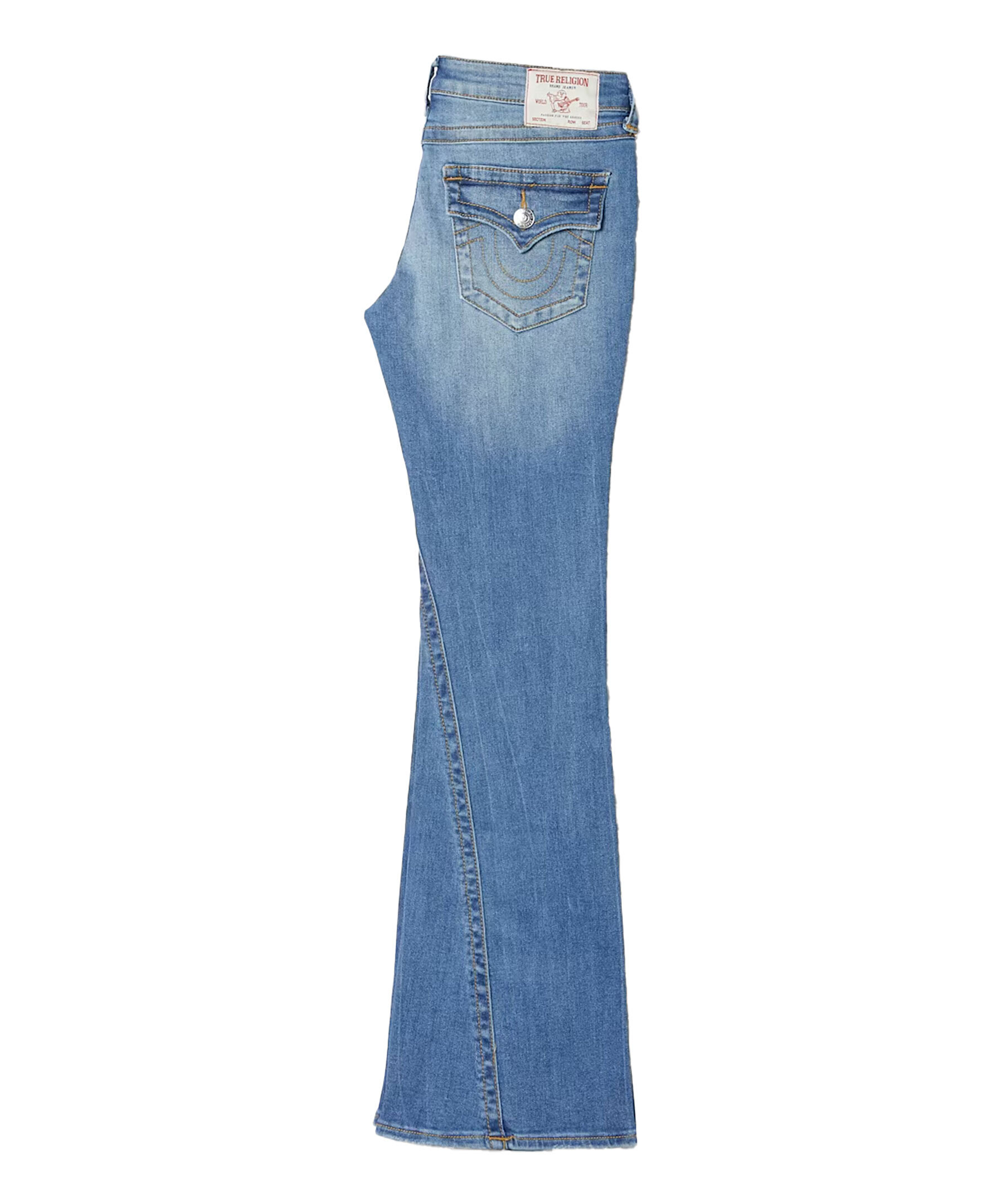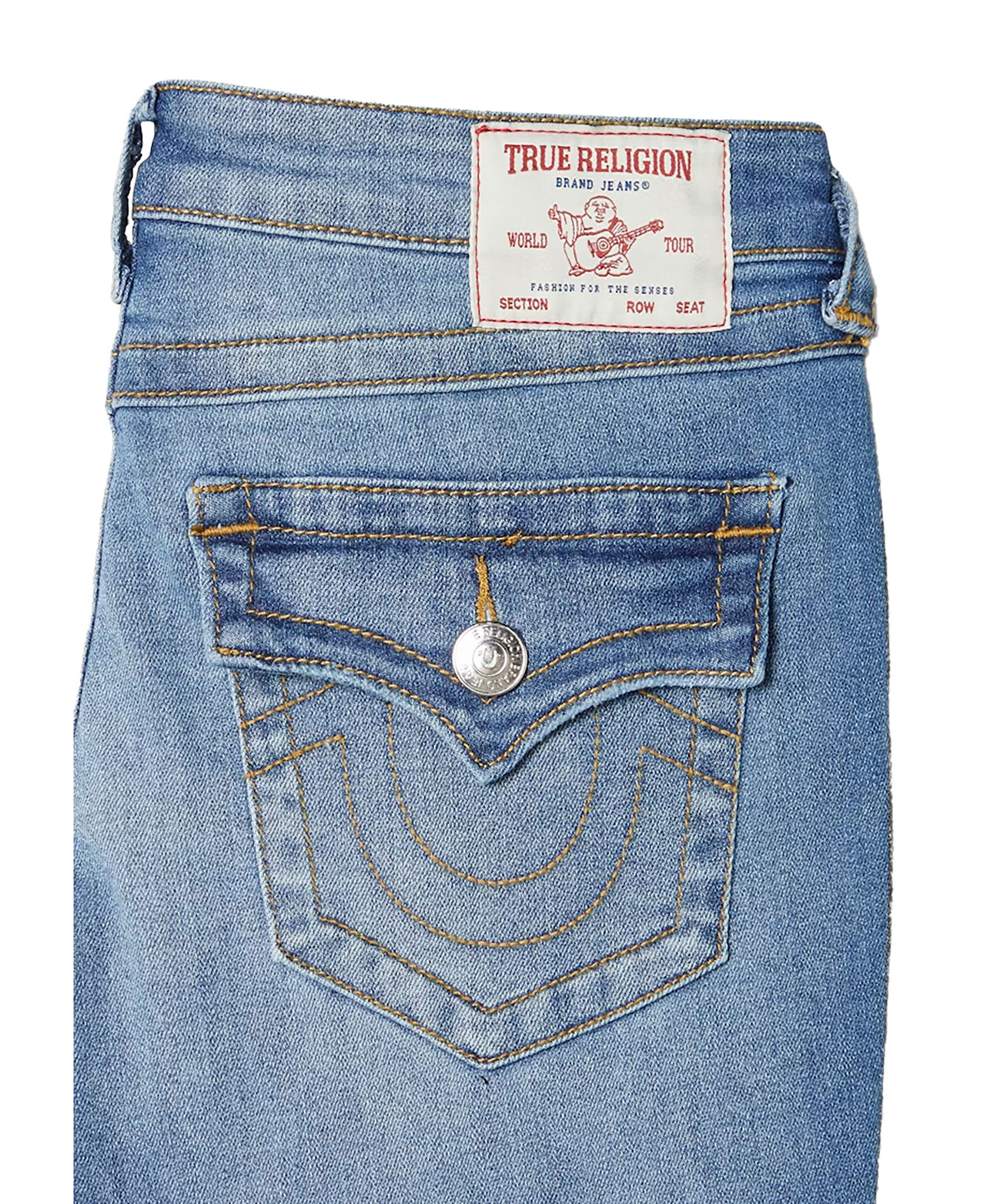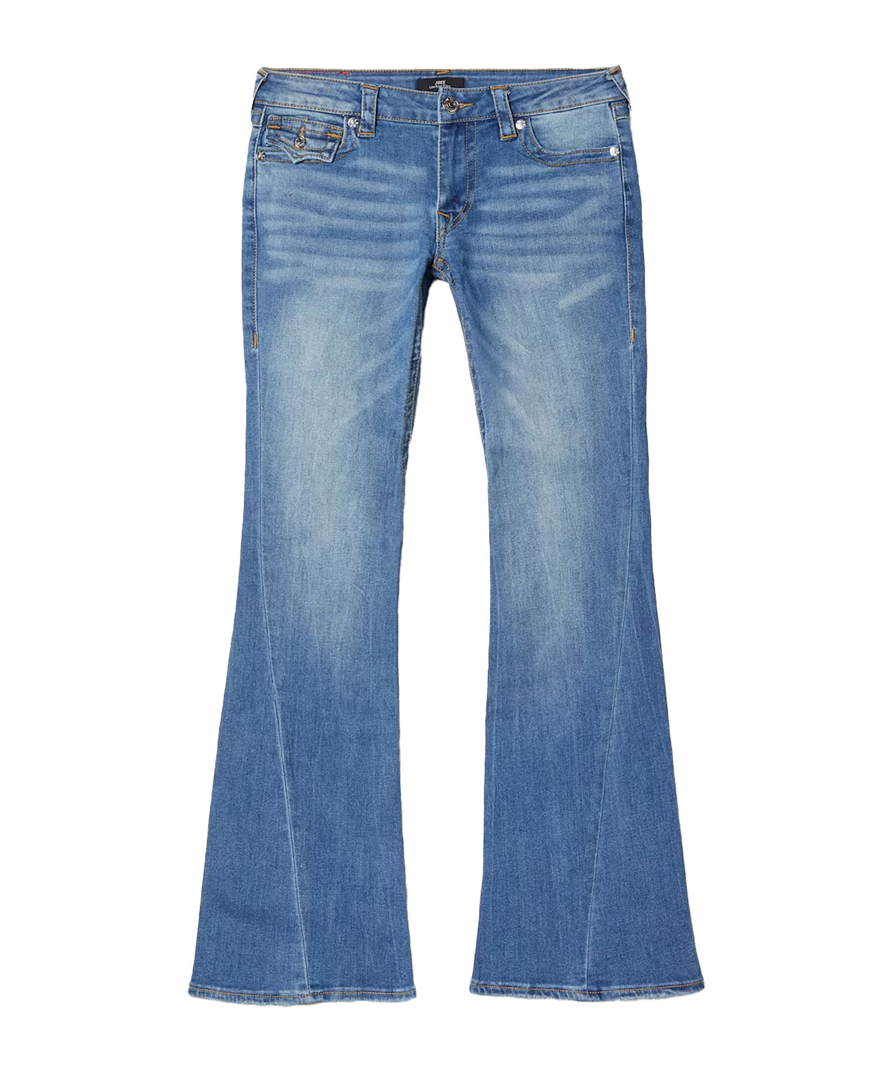 Blåa jeans från True Religion. Jeansen har låg midja med bälteshällor, fem fickor, myntficka och bakfickor med lock samt utsvängda ben. Tillverkade i en bomullsblandning.