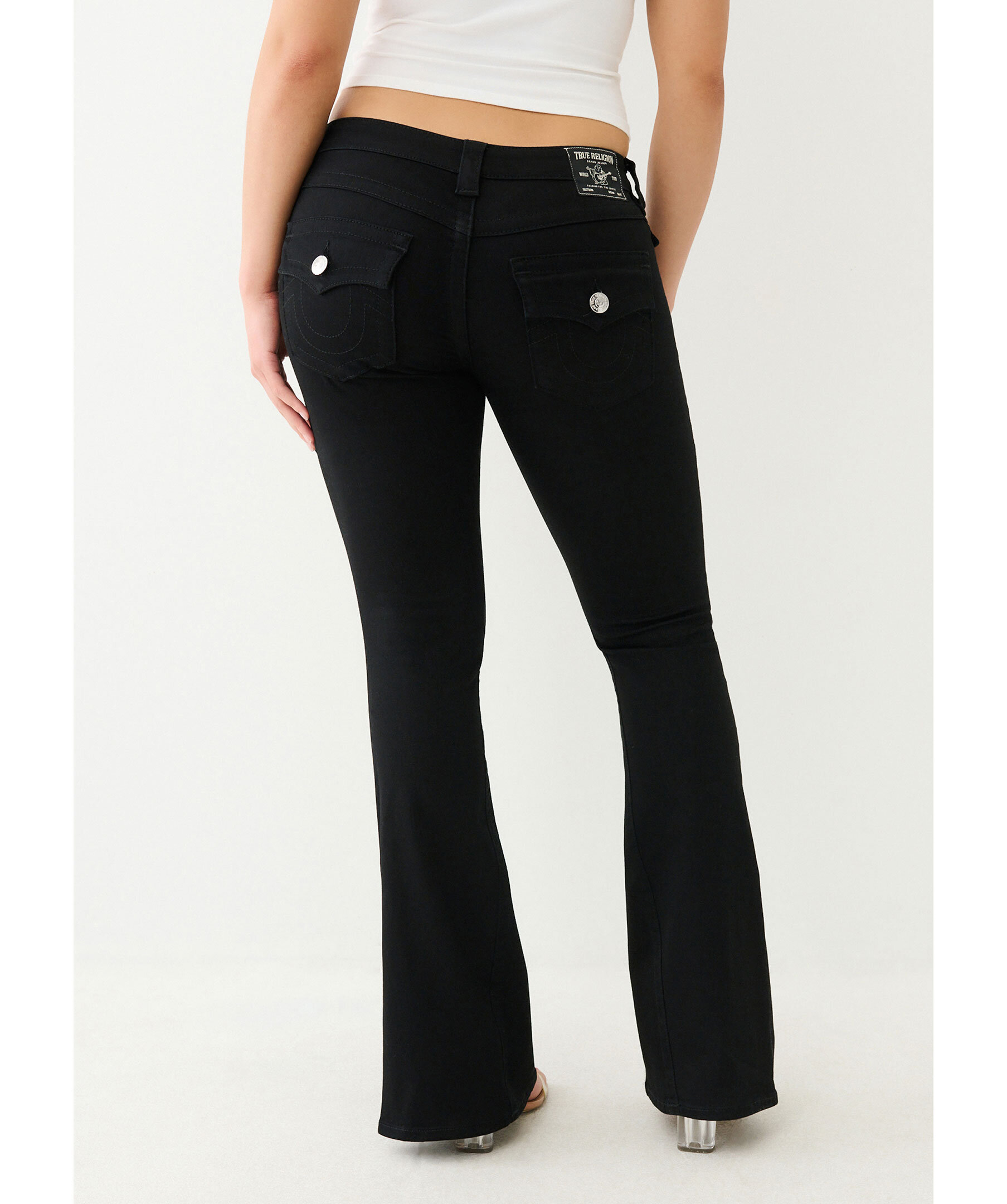 Jeans i färgen BlackBodyRinse från True Religion med utsvängda ben. Låg midja med bälteshällor. Två framfickor och en liten myntficka med knapp samt två bakfickor med lock och knapp. Hästsko formade sömmar på bakfickorna. Tillverkade i en bomullsblandning.