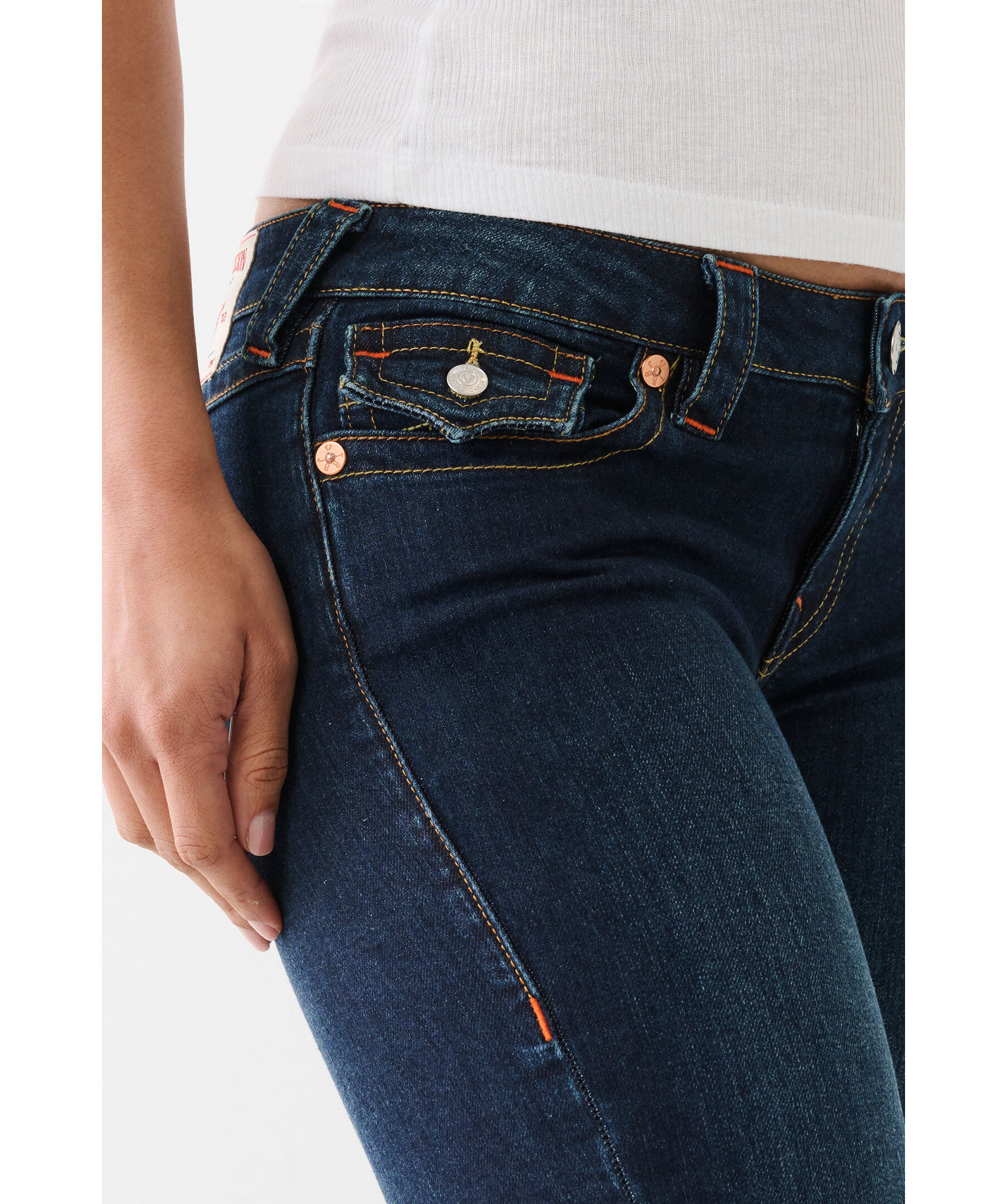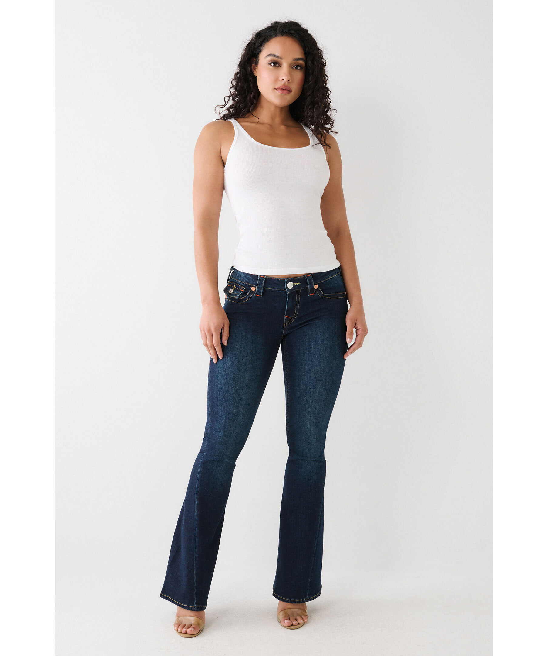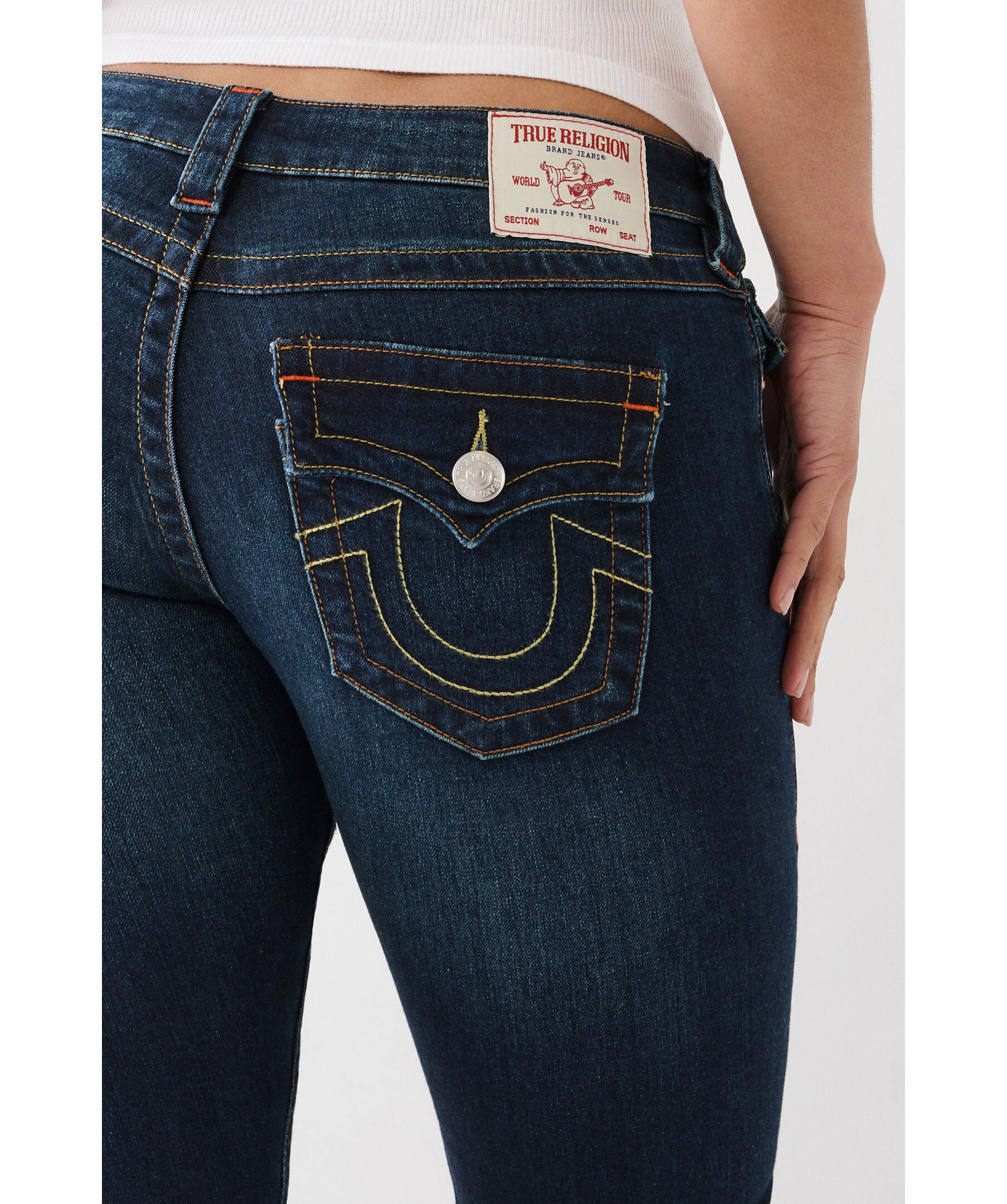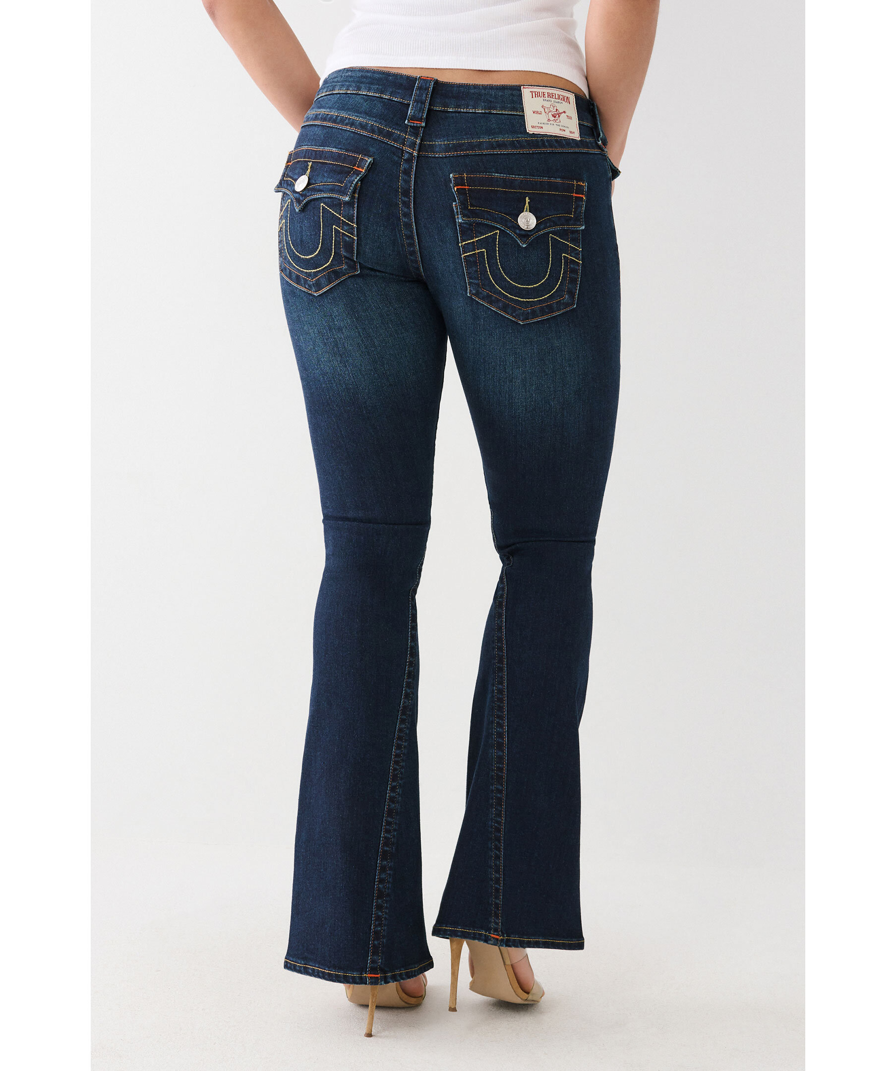 Jeans i färgen Muddy Waters från True Religion med utsvängda ben. Låg midja med bälteshällor. Två framfickor och en liten myntficka med knapp samt två bakfickor med lock och knapp. Subtil blekning och flerfärgade sömmar. Hästsko formade sömmar på bakfickorna samt deras ikoniska vridna innersömmar. Tillverkade i en bomullsblandning.