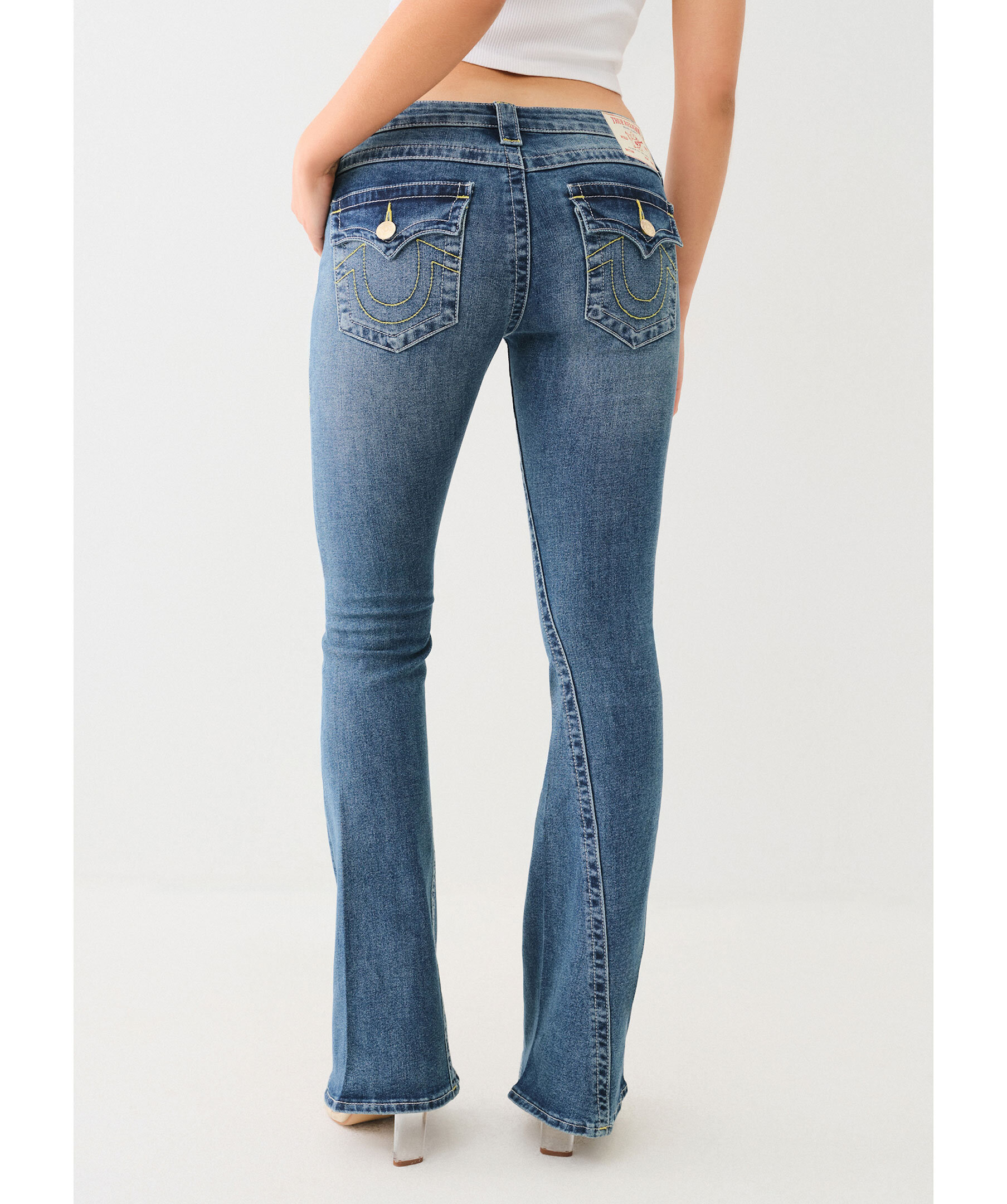 Jeans i färgen Arabella från True Religion med utsvängda ben. Låg midja med bälteshällor. Två framfickor och en liten myntficka med knapp samt två bakfickor med lock och knapp. Subtil blekning och vita sömmar. Hästsko formade sömmar på bakfickorna samt deras ikoniska vridna innersömmar. Tillverkade i en bomullsblandning.