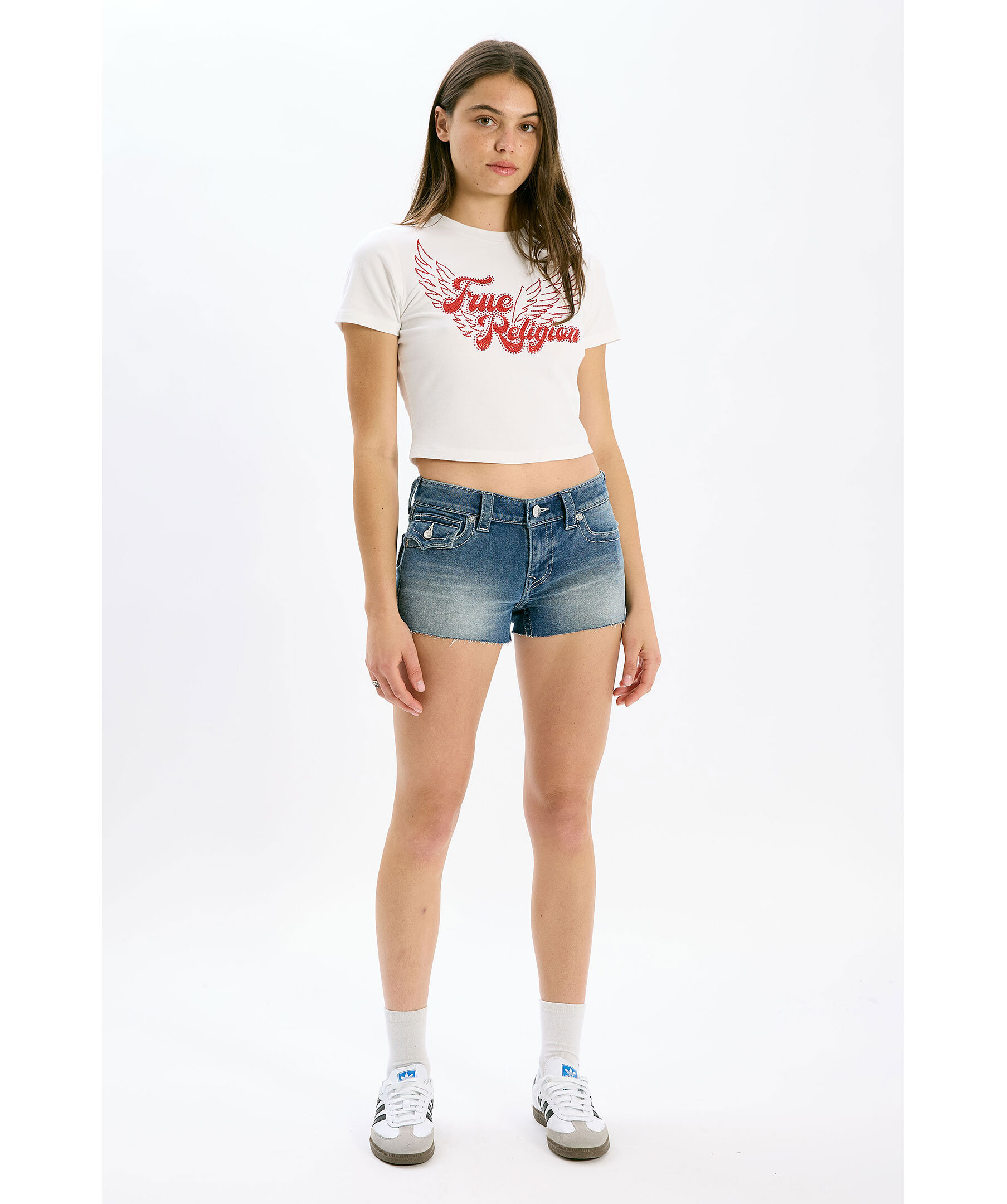 Blåa jeanshorts från True Religion. Shortsen har en låg midja med bälteshällor, fem fickor samt fransar vid benslut. Tillverkade i en bomullsblandning.