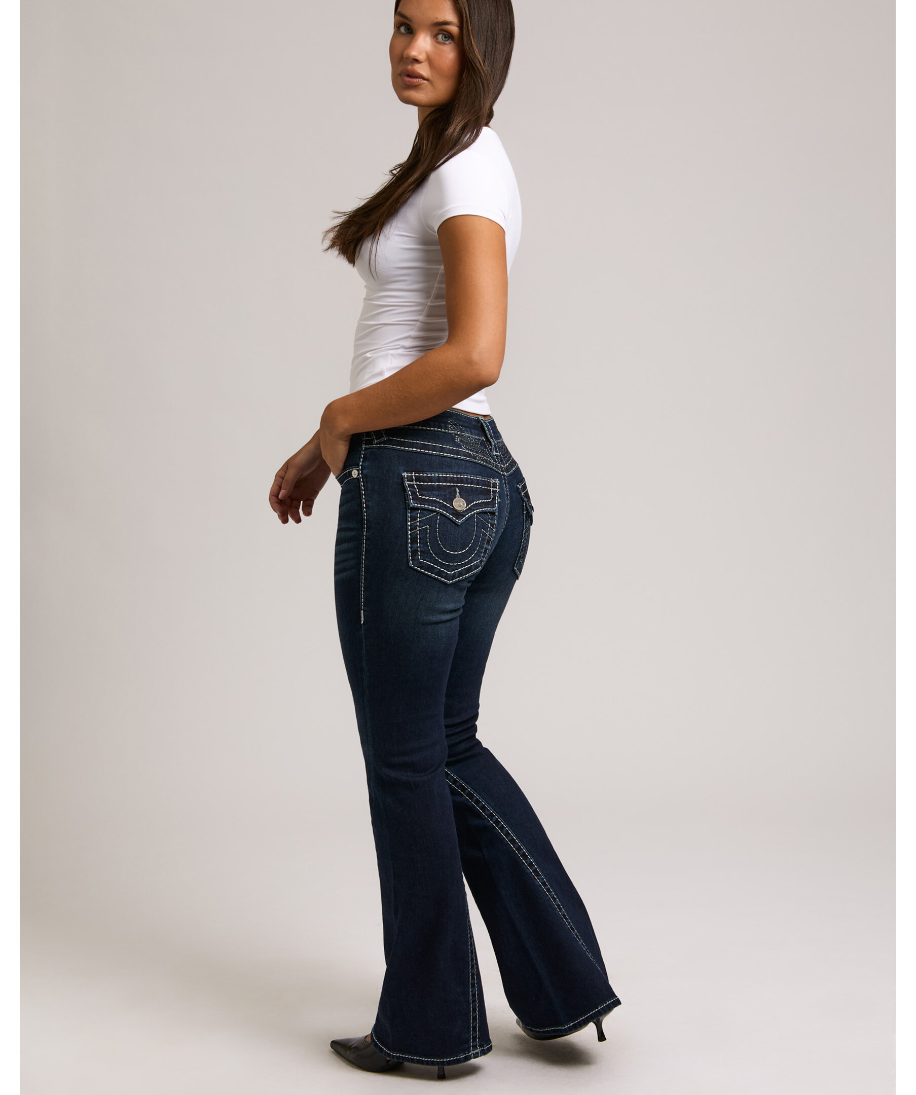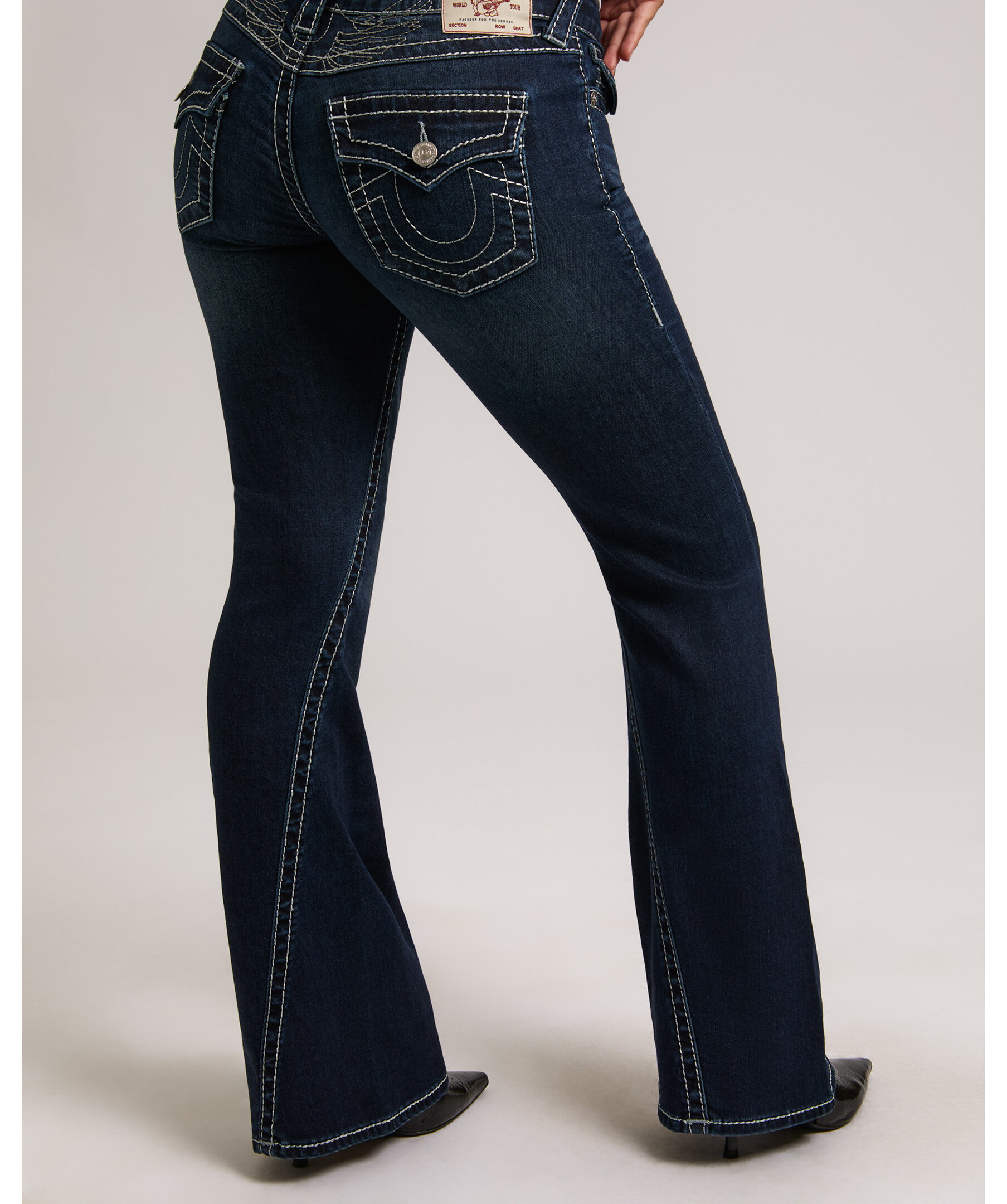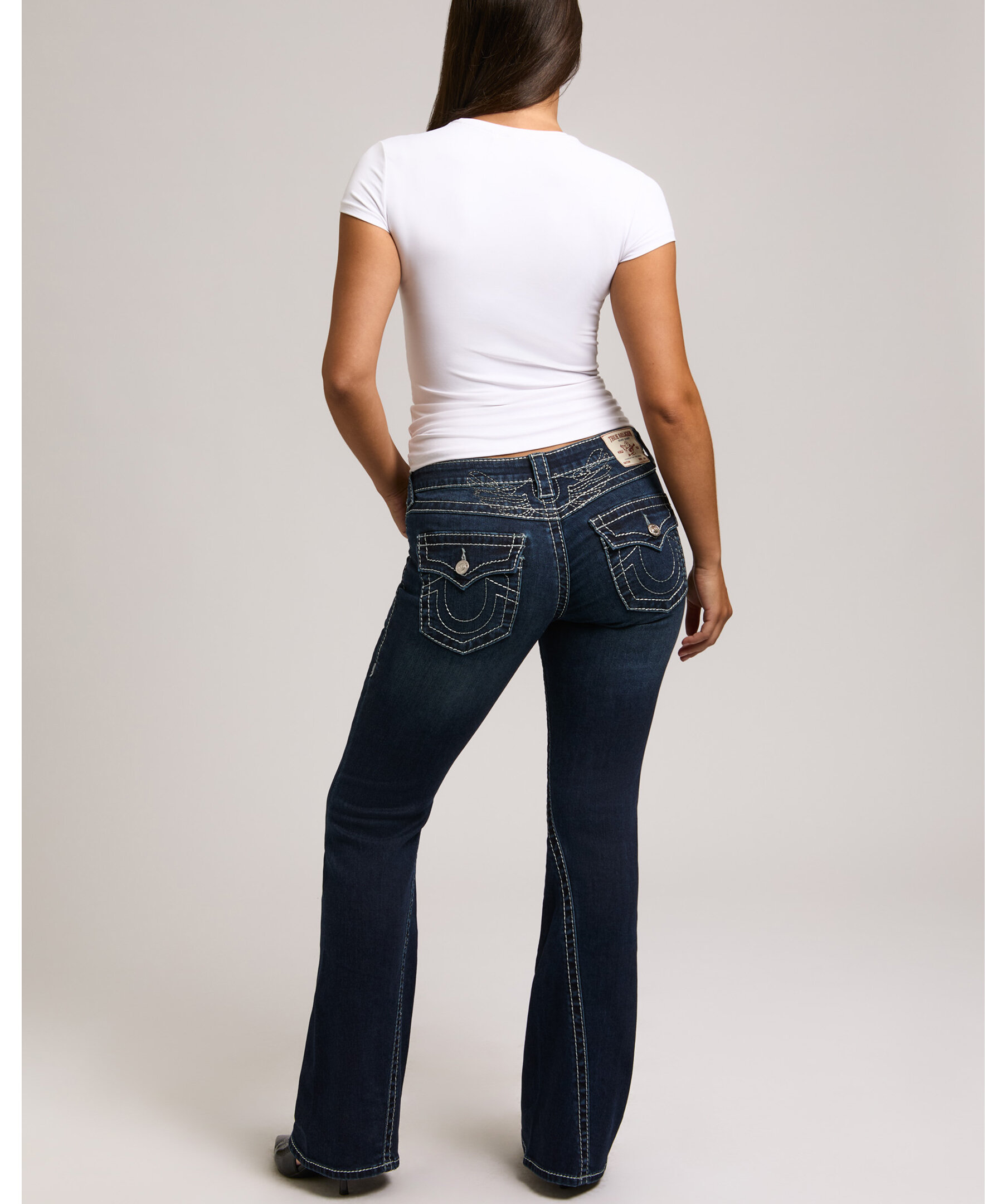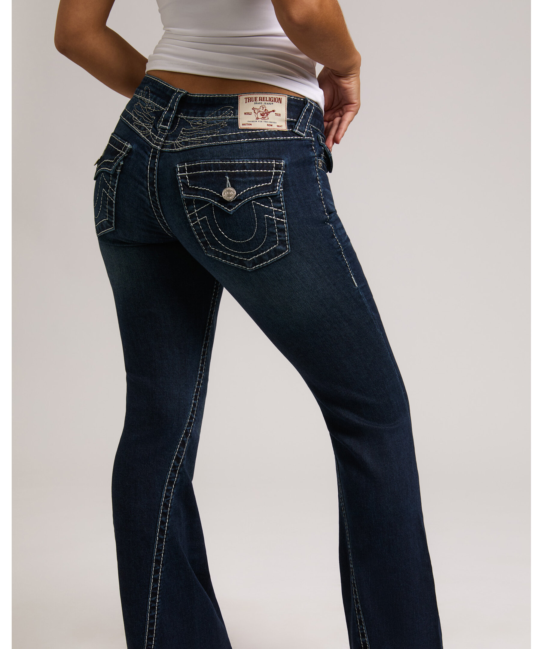 Joey Flare från True Religion är jeans med låg midja och utsvängda ben, dekorerade med subtil lurextråd som ger en diskret lyster. De ikoniska Big T-sömmarna och flap-bakfickorna skapar ett uttryck med tydlig karaktär.