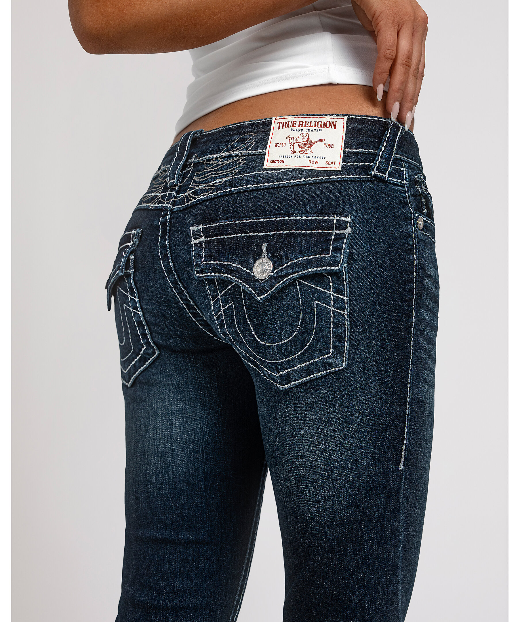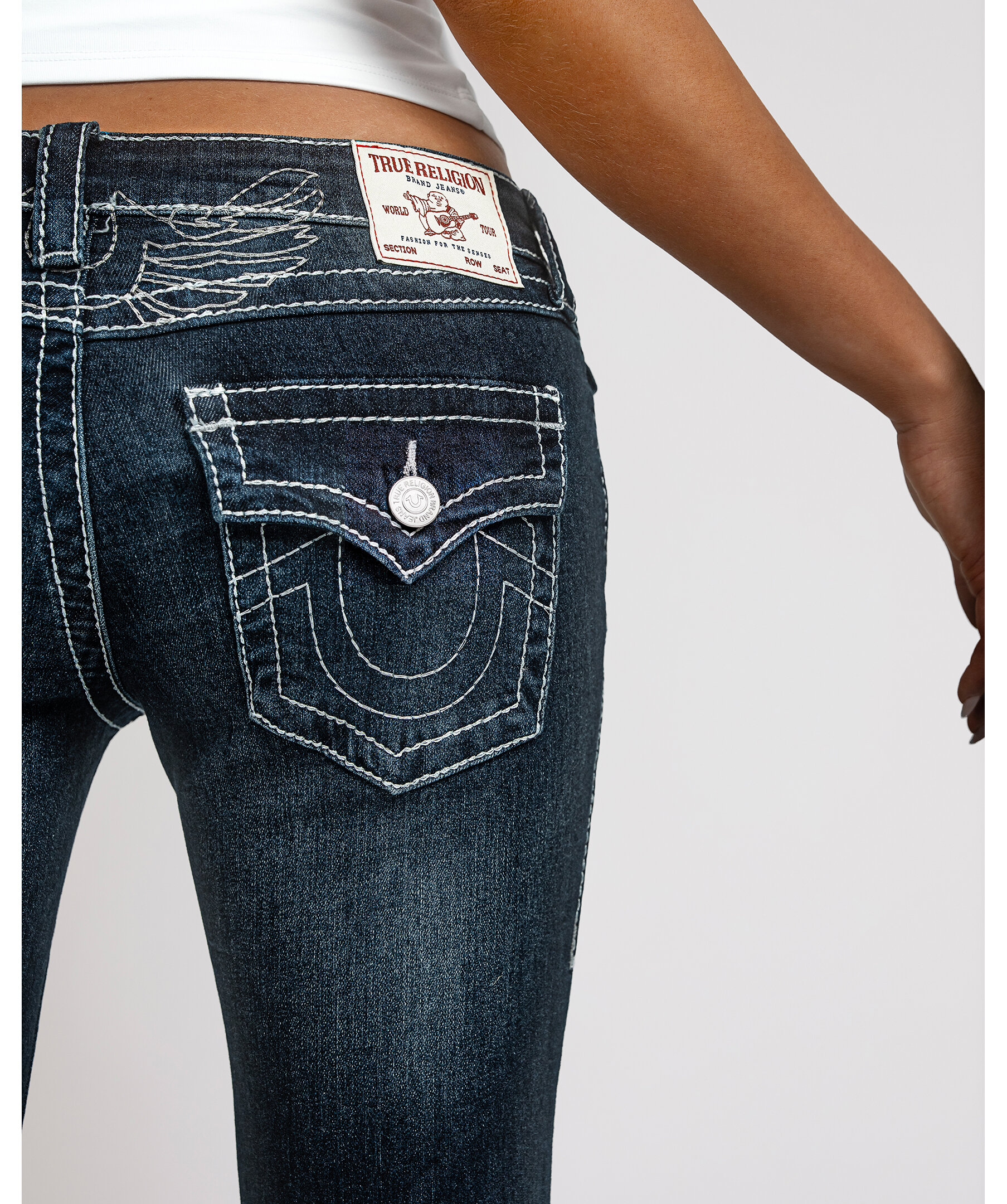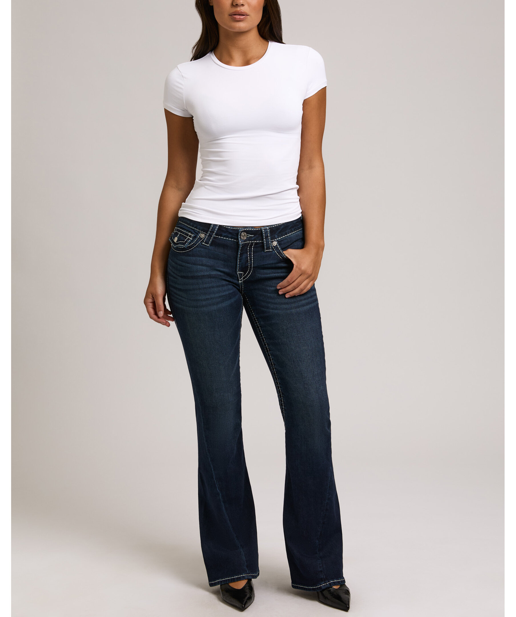Joey Flare från True Religion är jeans med låg midja och utsvängda ben, dekorerade med subtil lurextråd som ger en diskret lyster. De ikoniska Big T-sömmarna och flap-bakfickorna skapar ett uttryck med tydlig karaktär.