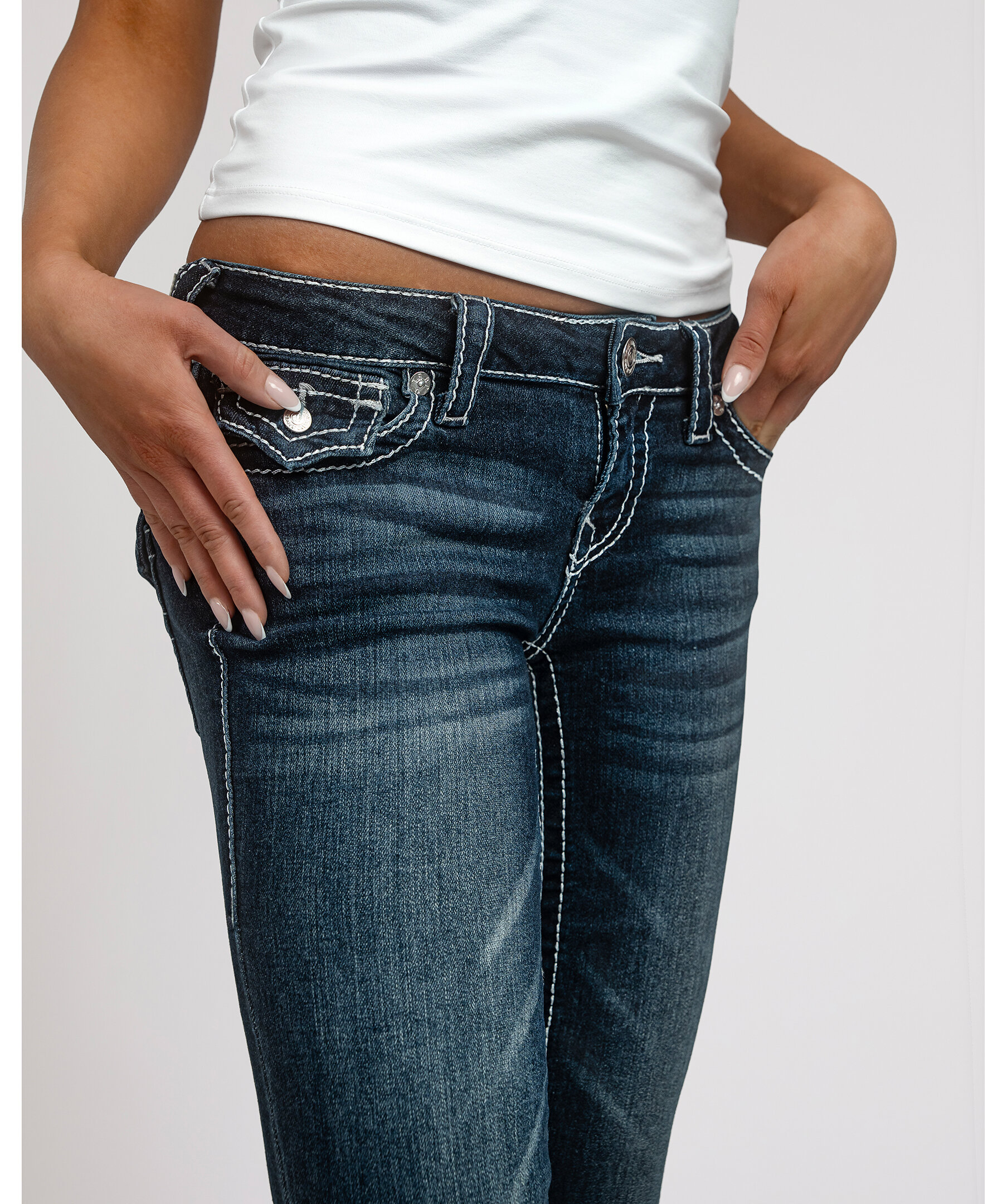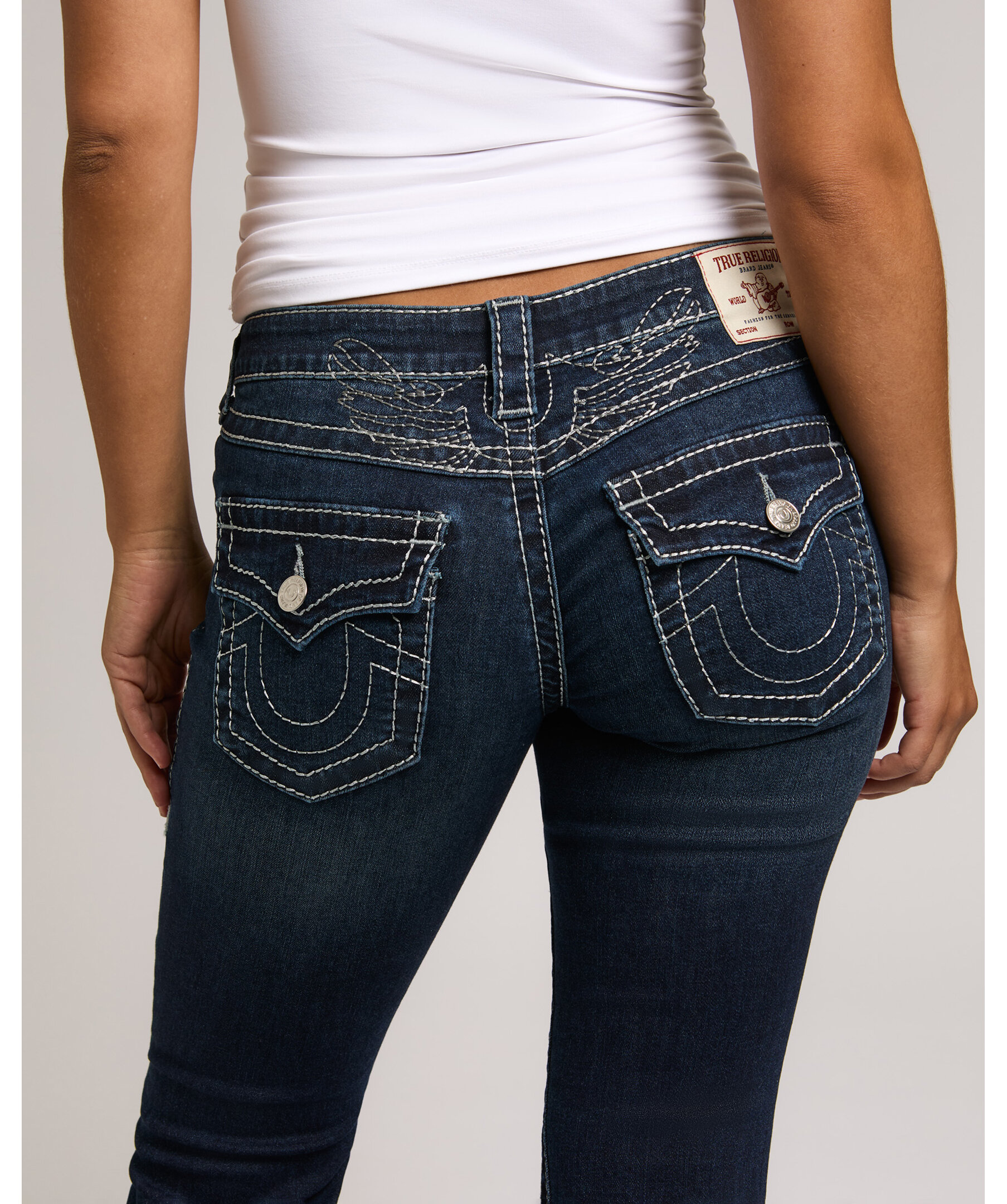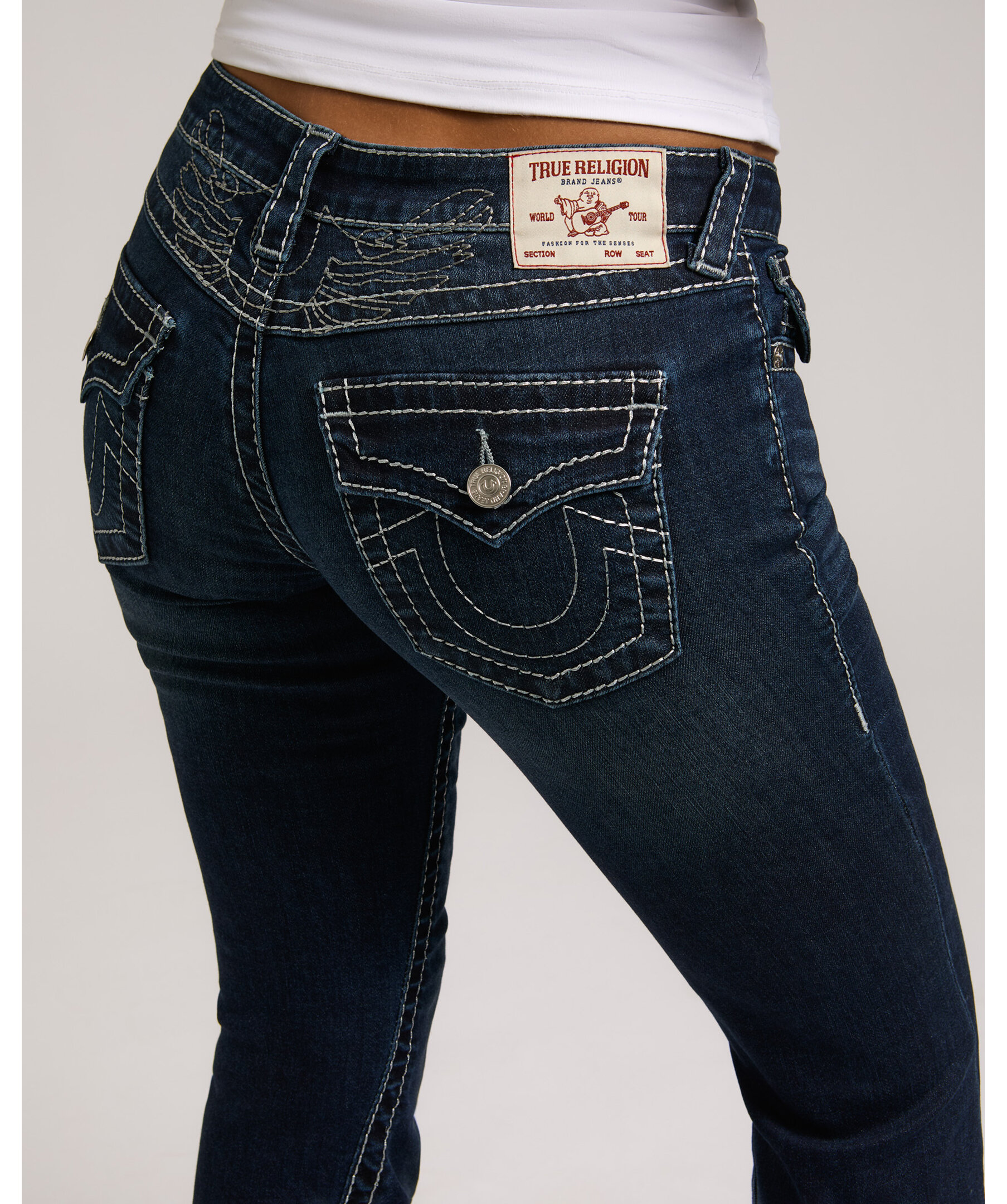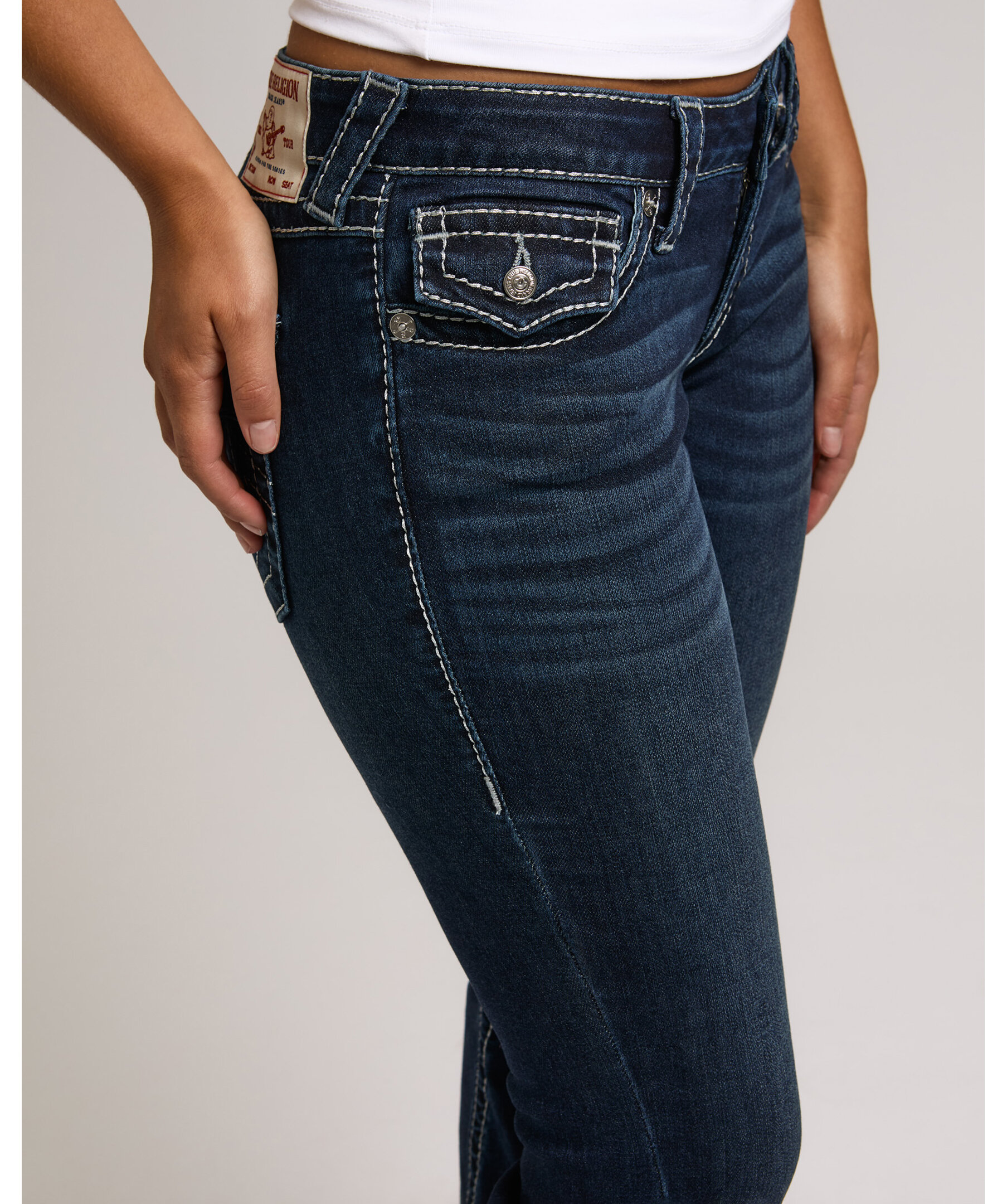 Joey Flare från True Religion är jeans med låg midja och utsvängda ben, dekorerade med subtil lurextråd som ger en diskret lyster. De ikoniska Big T-sömmarna och flap-bakfickorna skapar ett uttryck med tydlig karaktär.