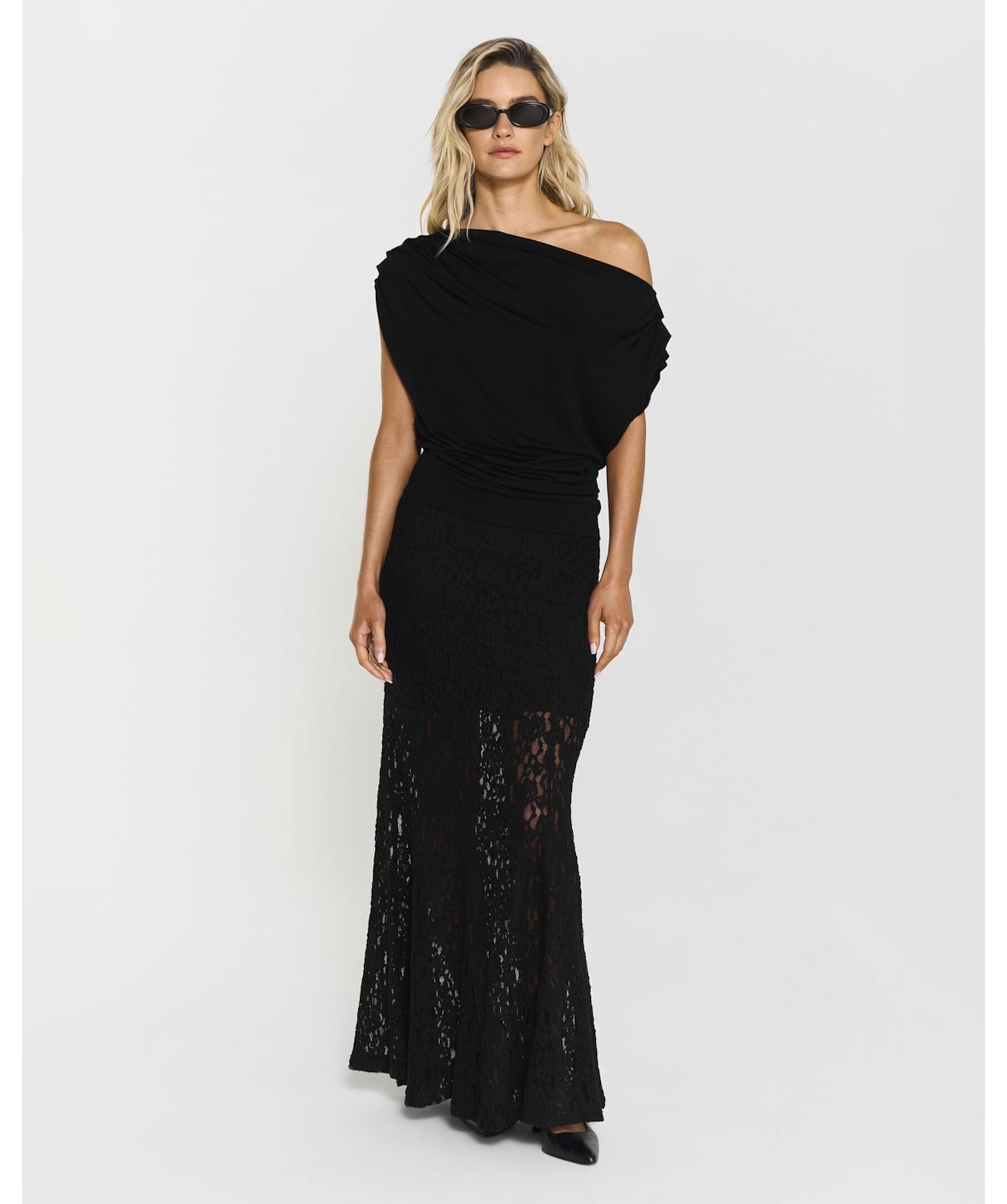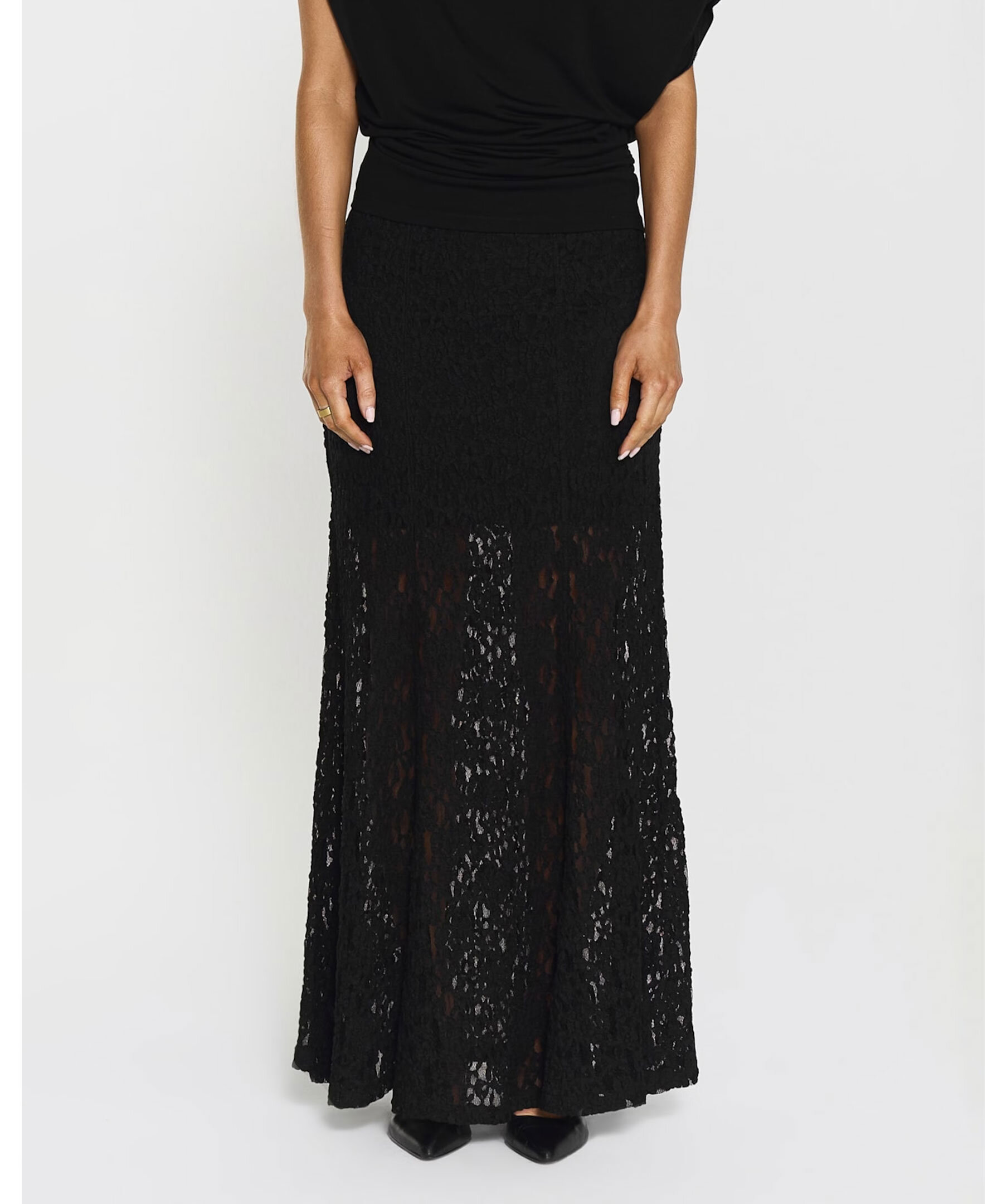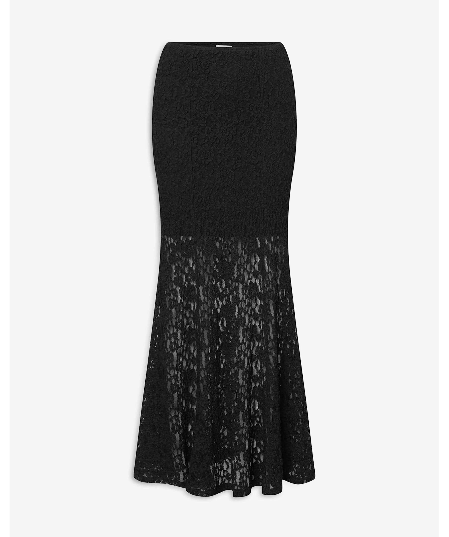 Hellång spetskjol från Twist & Tango. Kjolen har en veckad struktur och en elegant A-linjeformad silhuett. Den avtagbara underkjolen ger mångsidiga stylingmöjligheter och gör plagget lika användbart till vardags som vid mer uppklädda tillfällen.