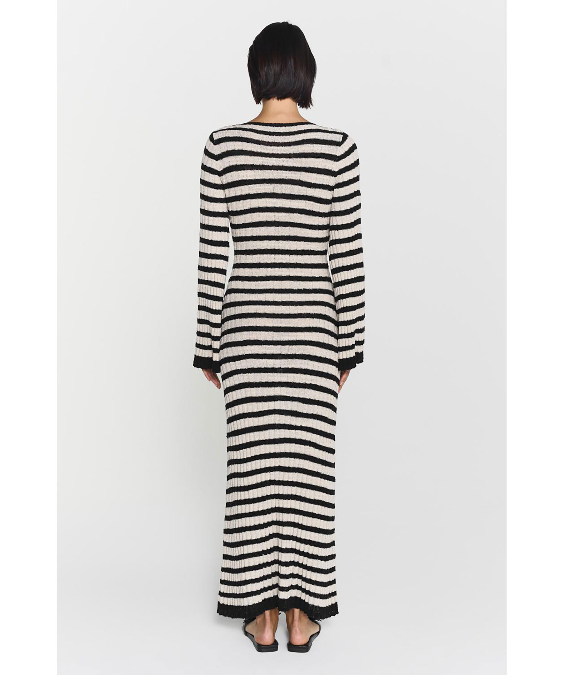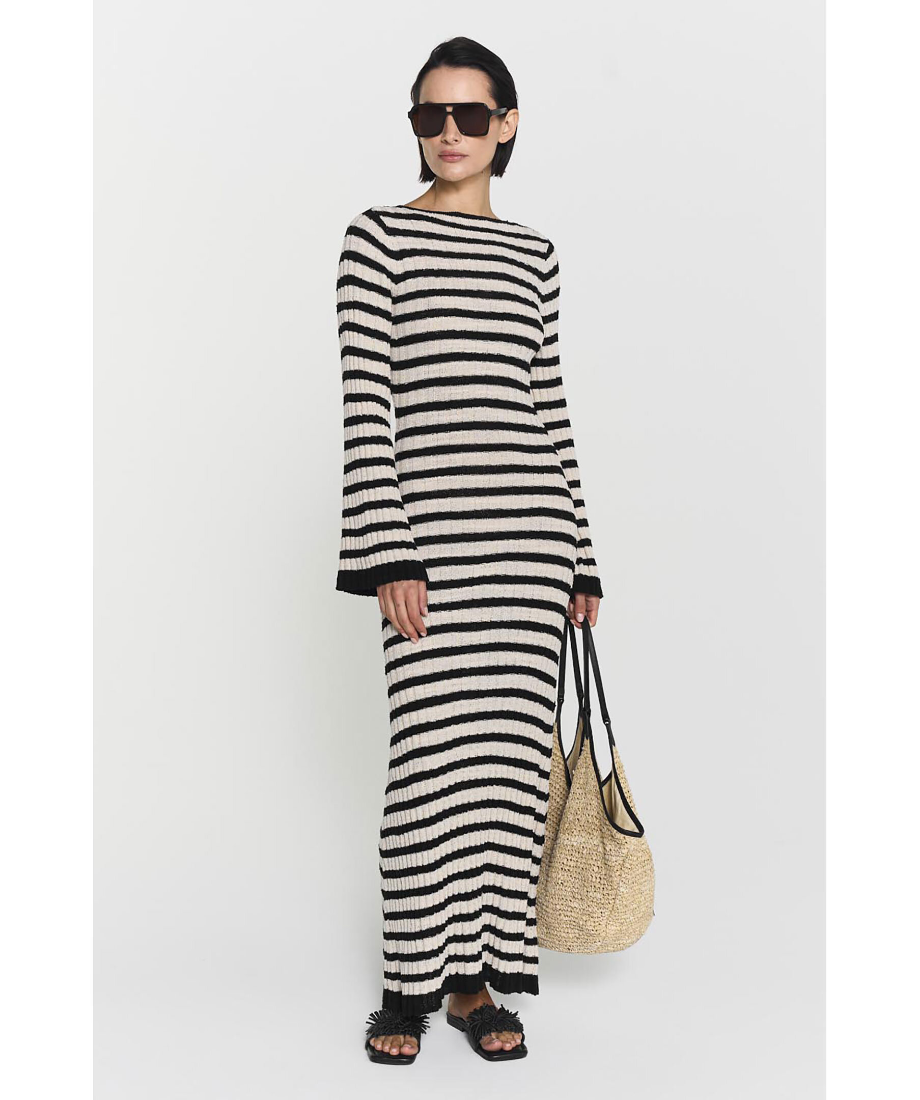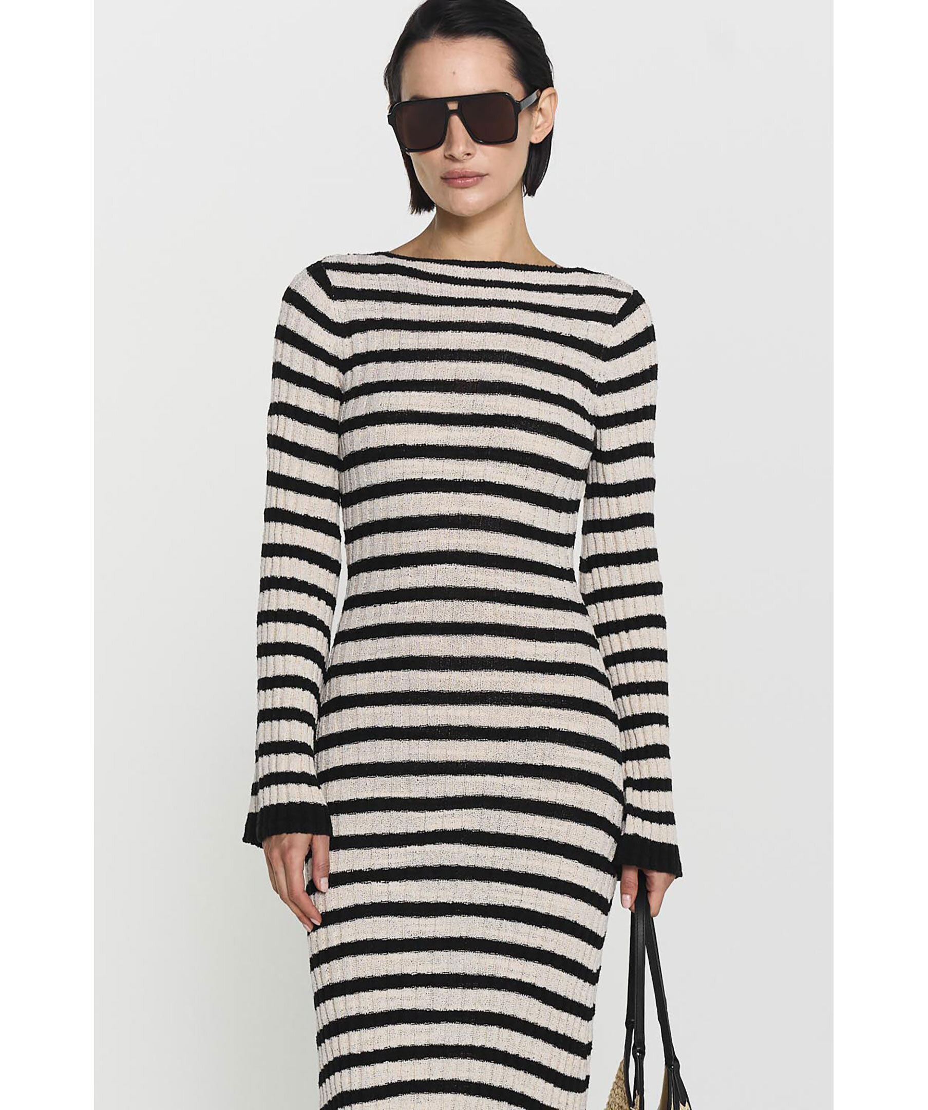 Svart och vitrandig stickad långklänning från Twist&Tango. Klänningen har en klassisk båthalsringning, tillverkad av organisk bouclé bomull. Tygen kan dra ut sig och ge en längre längd medans de bärs, för att få en längre längd rekommenderar vi att steama klänningen medans den händer.