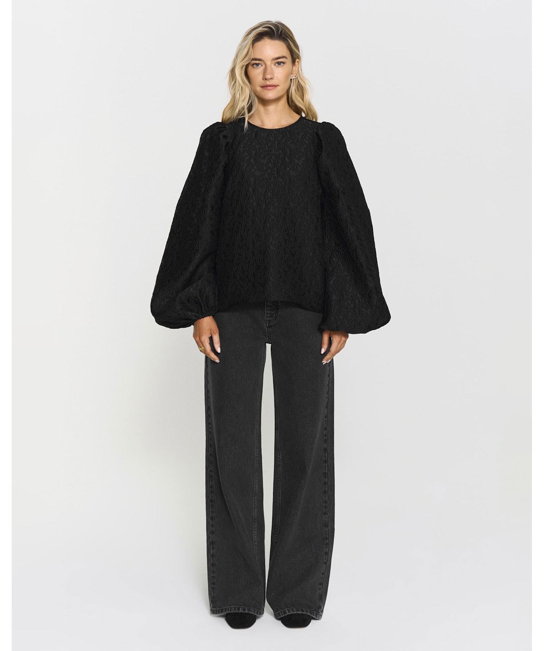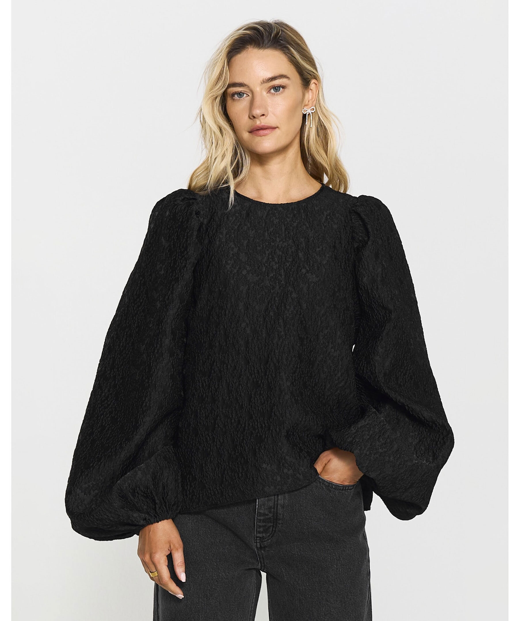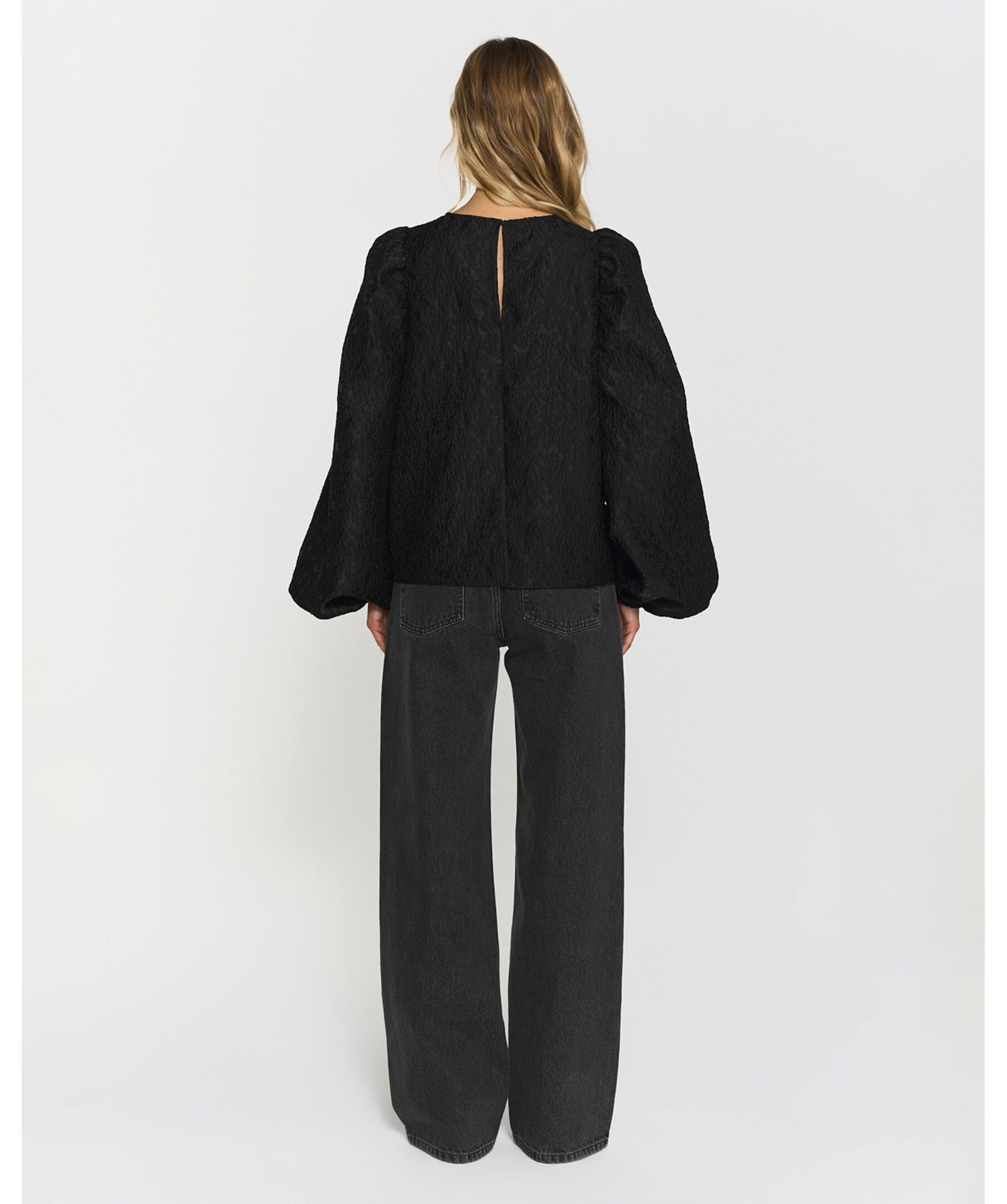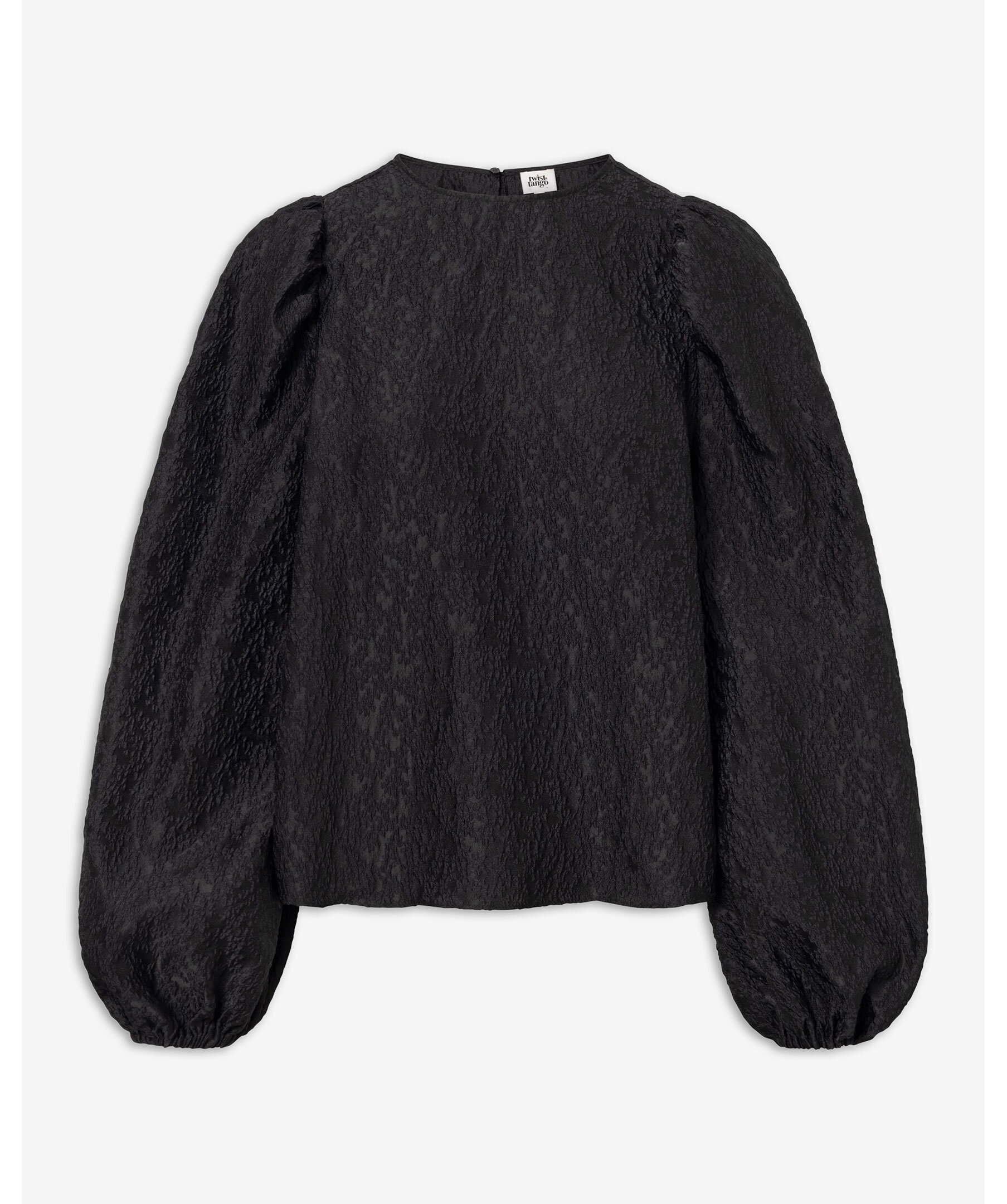Svart blus från twist & tango med voluminösa puffärmar och ett vackert texturerat tyg som skapar en stilfull och feminin silhuett med en touch av elegans.