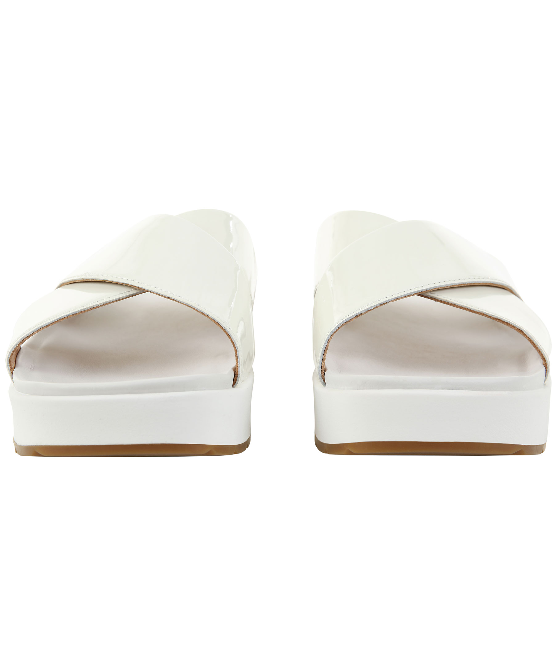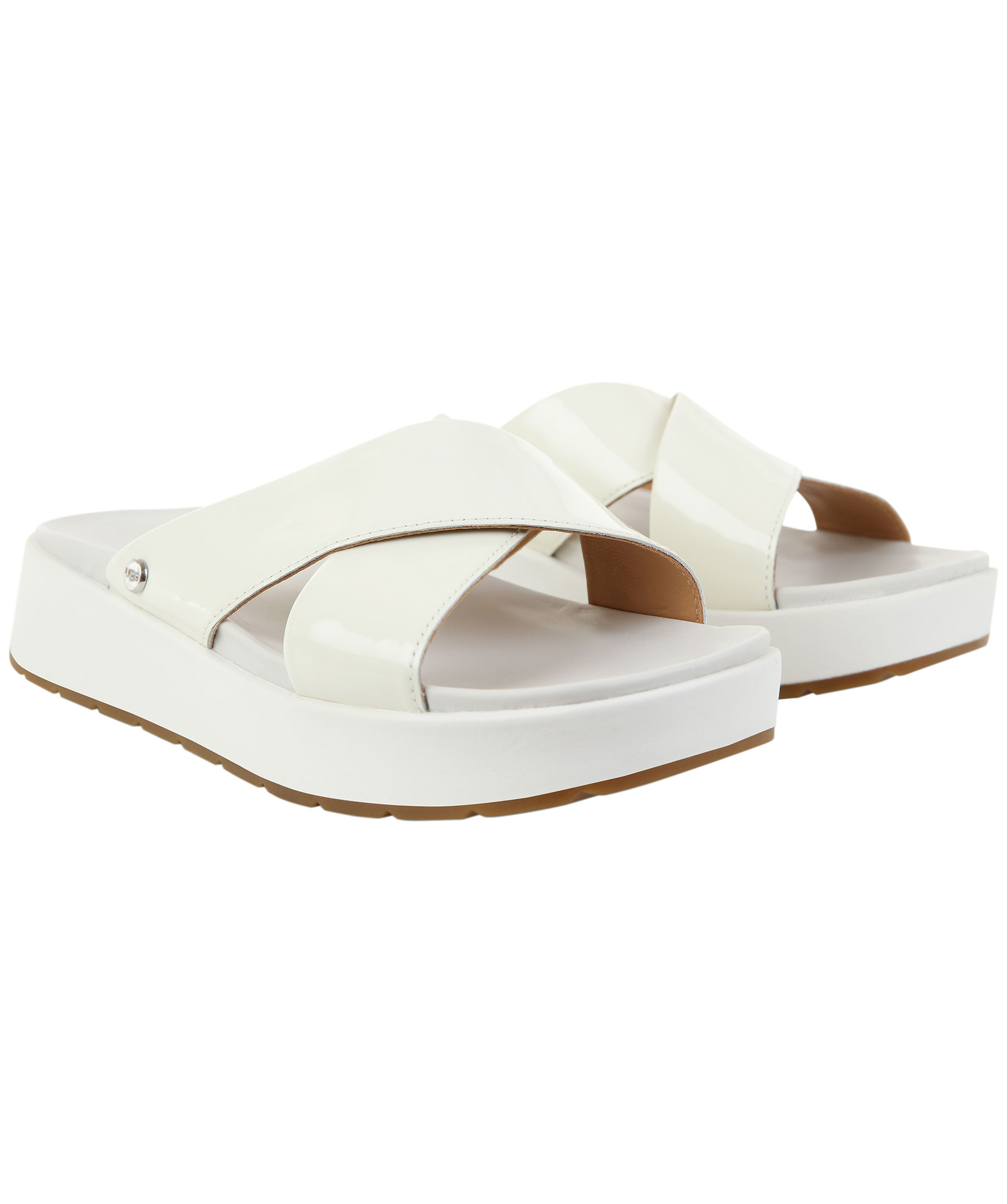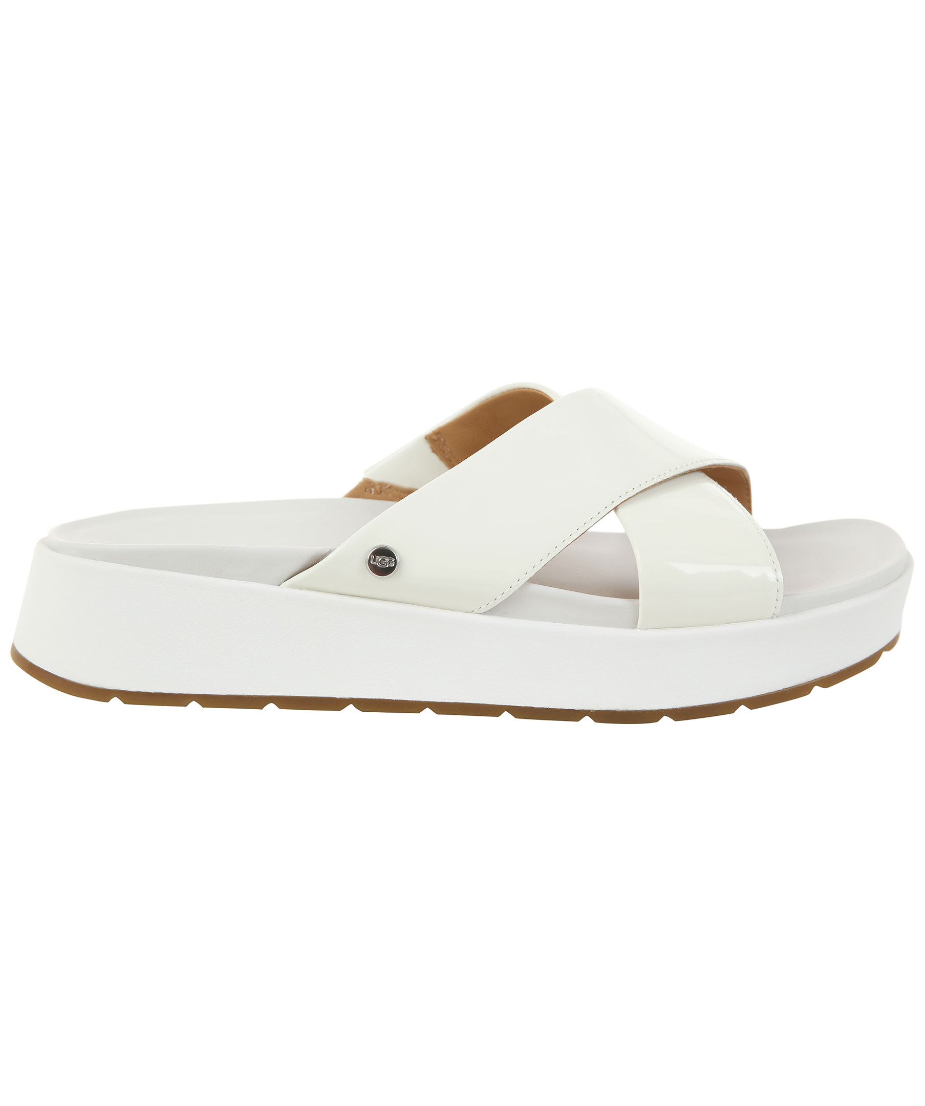 Vita sandaler från Ugg. Tillverkade i läder och gummi. Breda remmar som korsar varanda i glansig lack. Hög sula och logotyp i sulan. Liten, rund silverfärgad metallnit med logotyp på sidan. Liten kil på sidan med resor som gör skon mer töjbar.