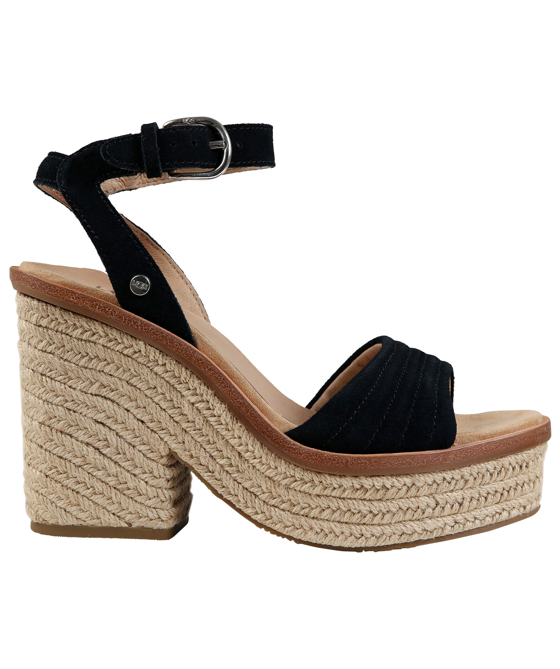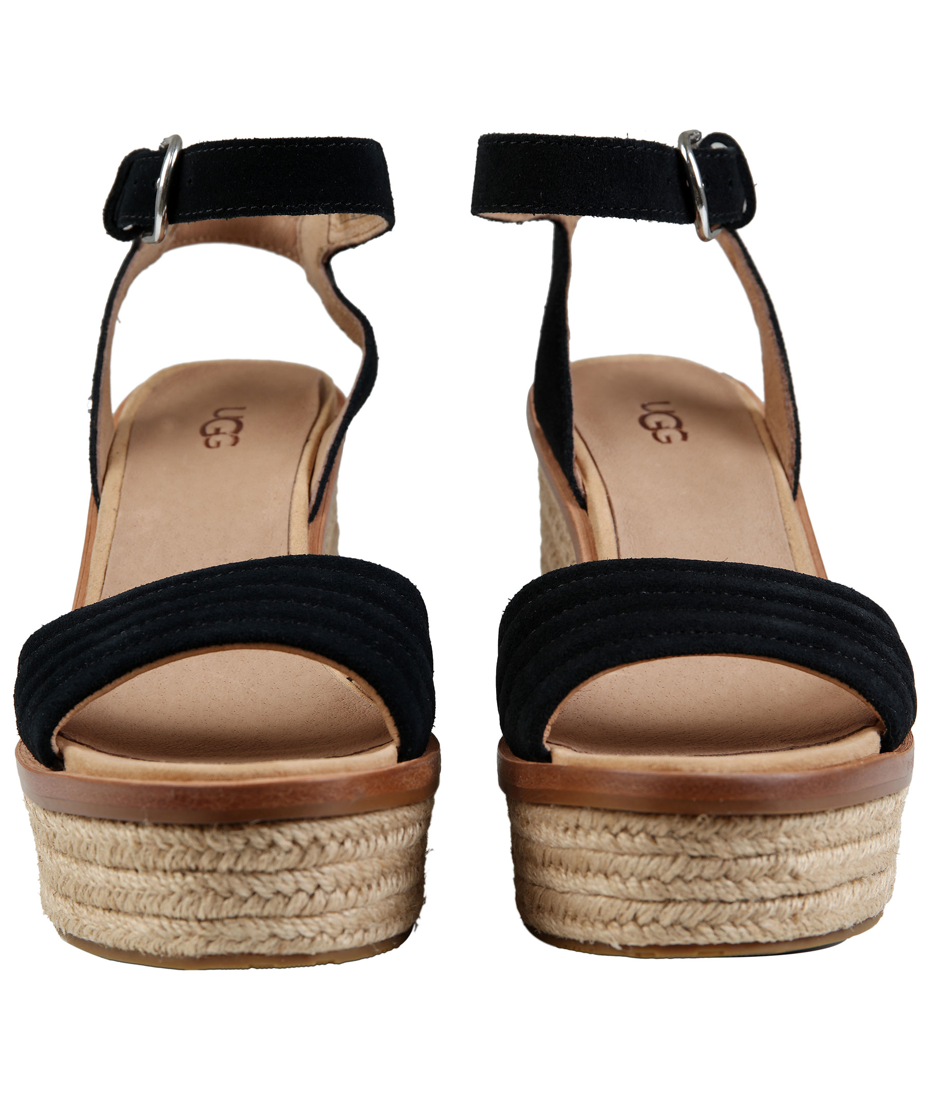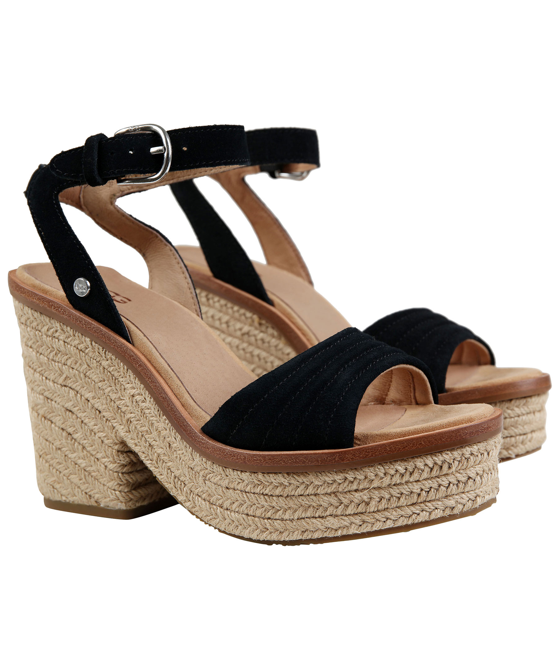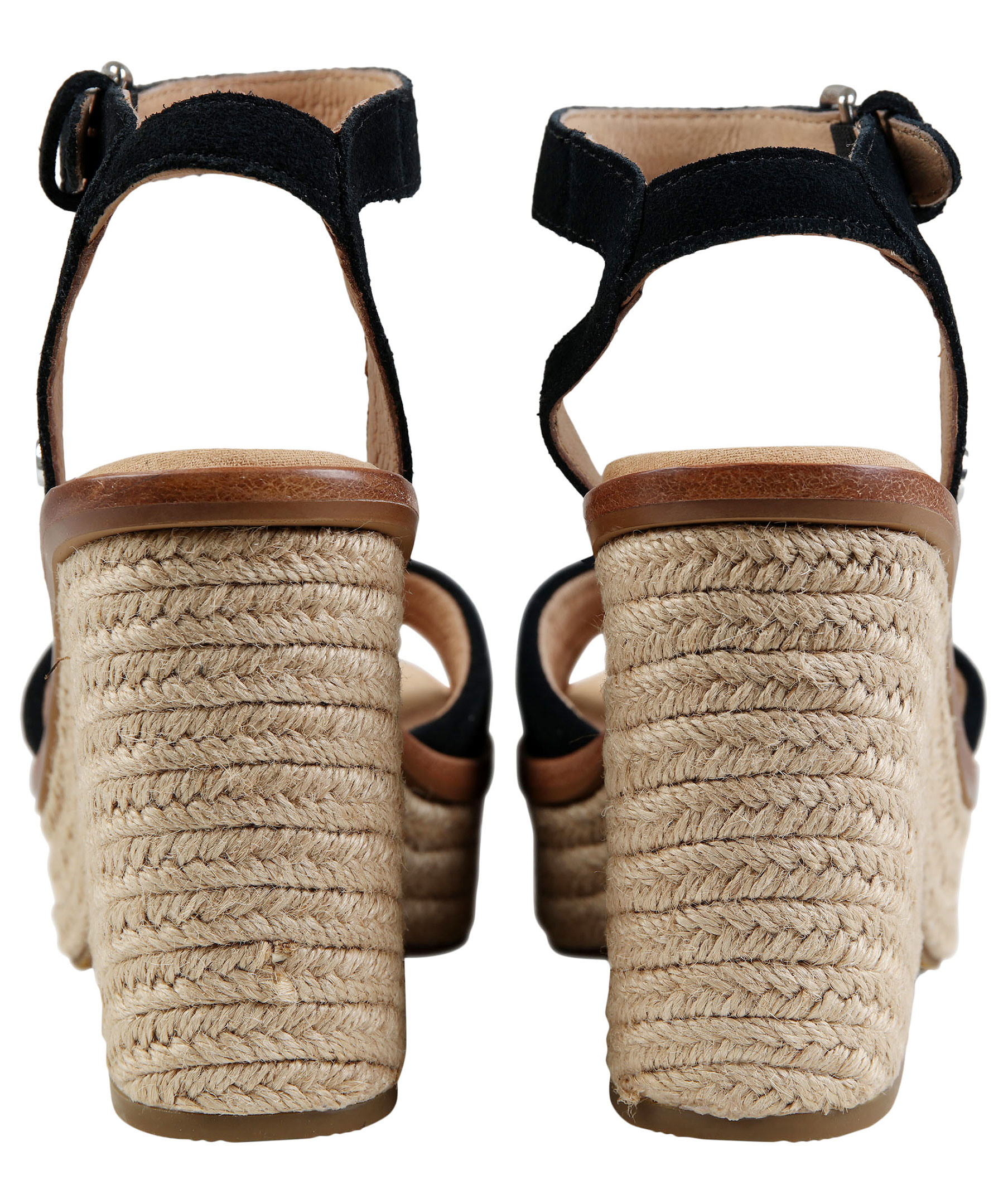 Svarta sandaler med beige, flätad och bred klack med platå från UGG. Ställbart spänne vid vrist och rem över foten fram. Liten silverfärgad logotyp på sidan. Tillverkade i mocka. Klackhöjd: 10 cm