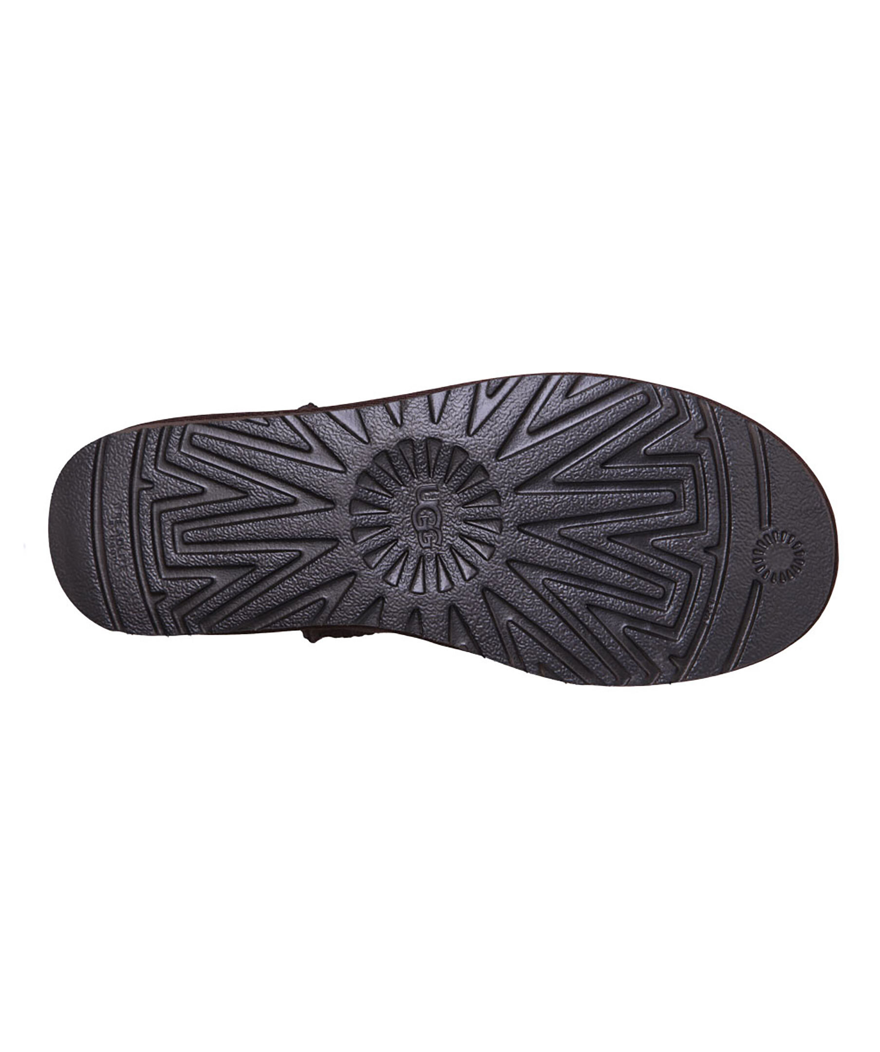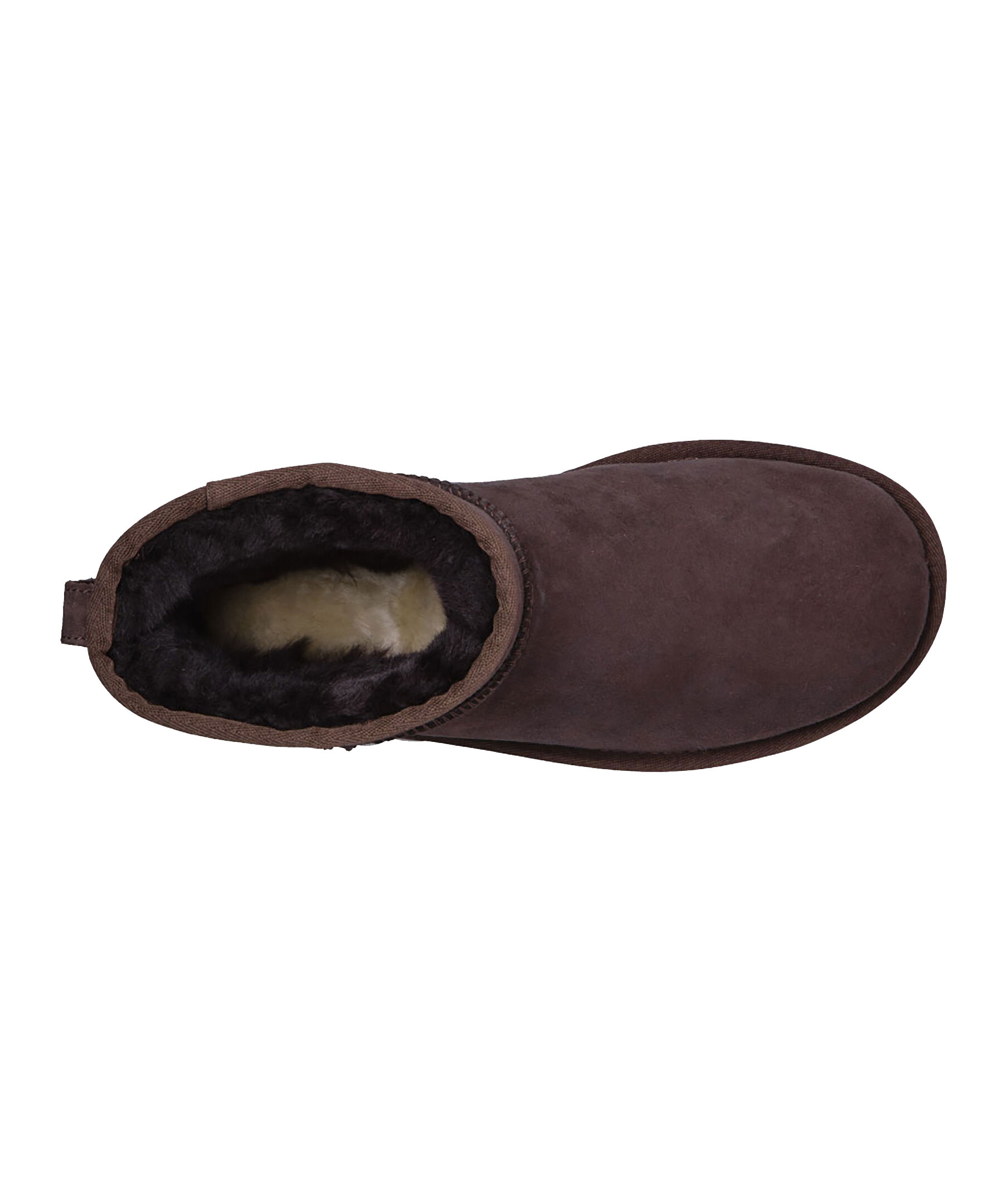 Klassiska boots i mörkbrun mocka från Ugg. Fodrade med fårskinn. Kortare skaft. Behandlad för att stöta bort lätta mängder vatten. Påsydd lapp med logotyp bak. Skorna är behandlade för att klara lätta mängder vatten. De är inte tillverkade för slaskigt och blött klimat och rekommenderas att inte användas när det är blött ute. Man behöver behandla skorna med skoimpregnering regelbundet för att skorna ska hålla längre och stå emot väta bättre.