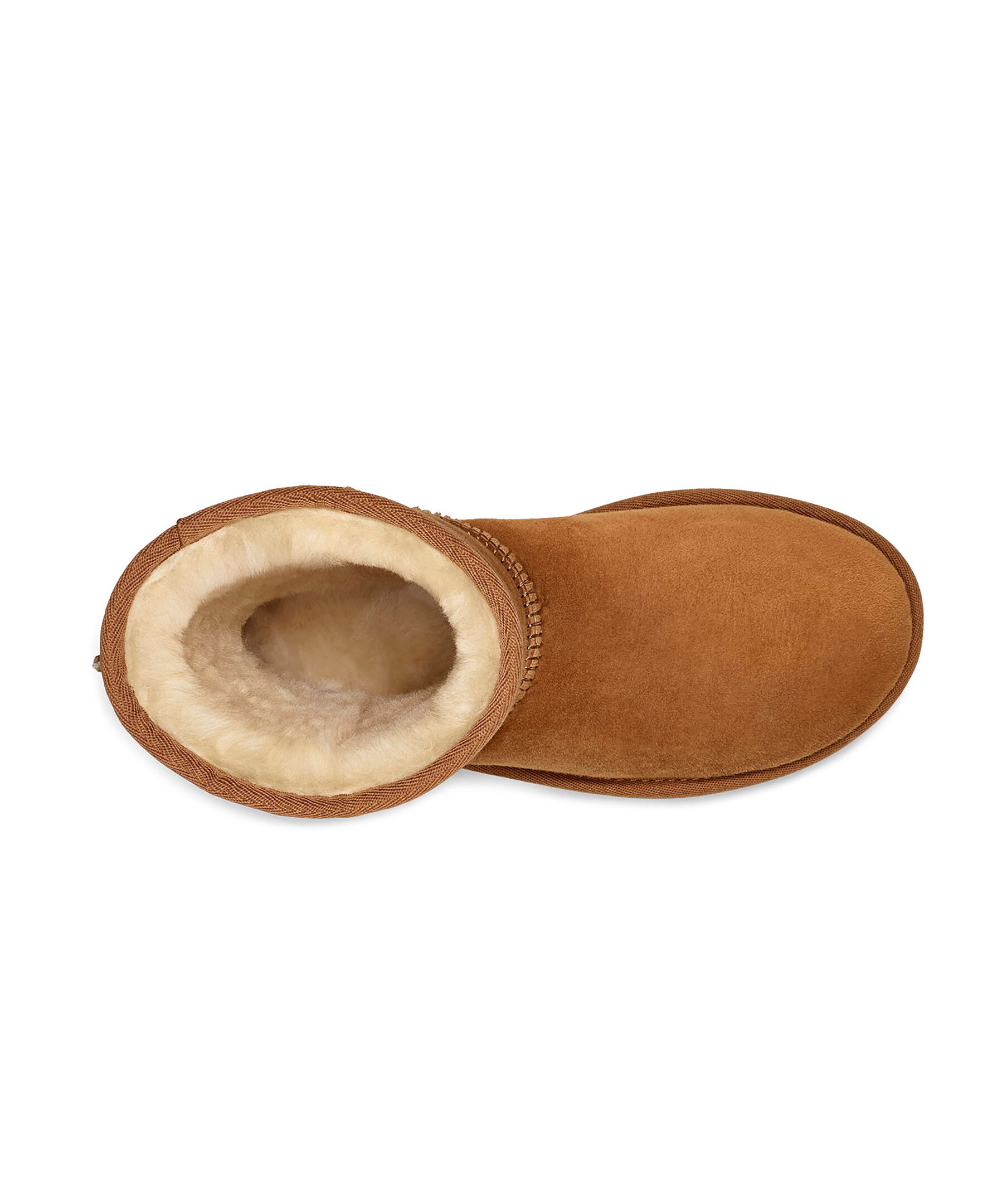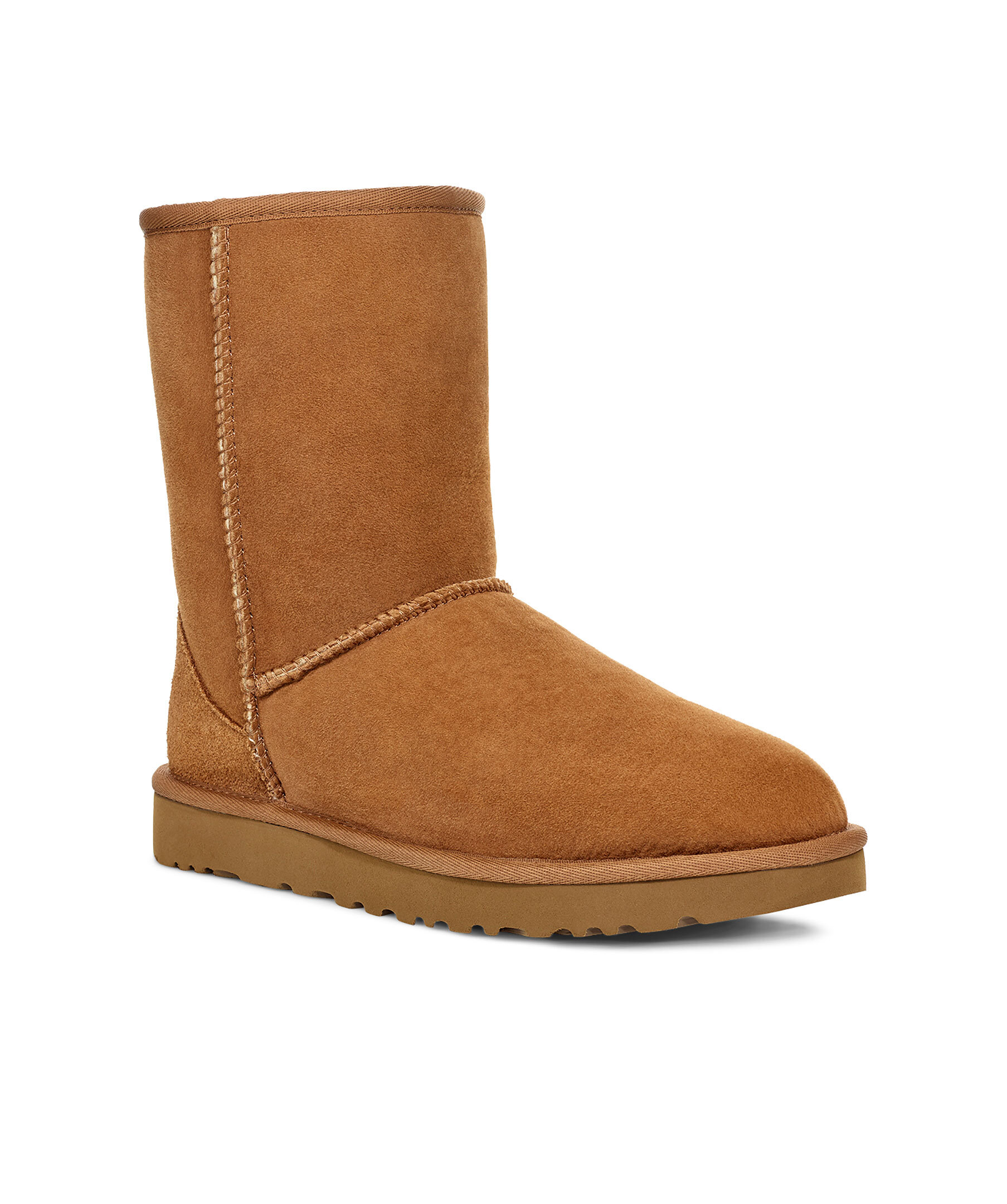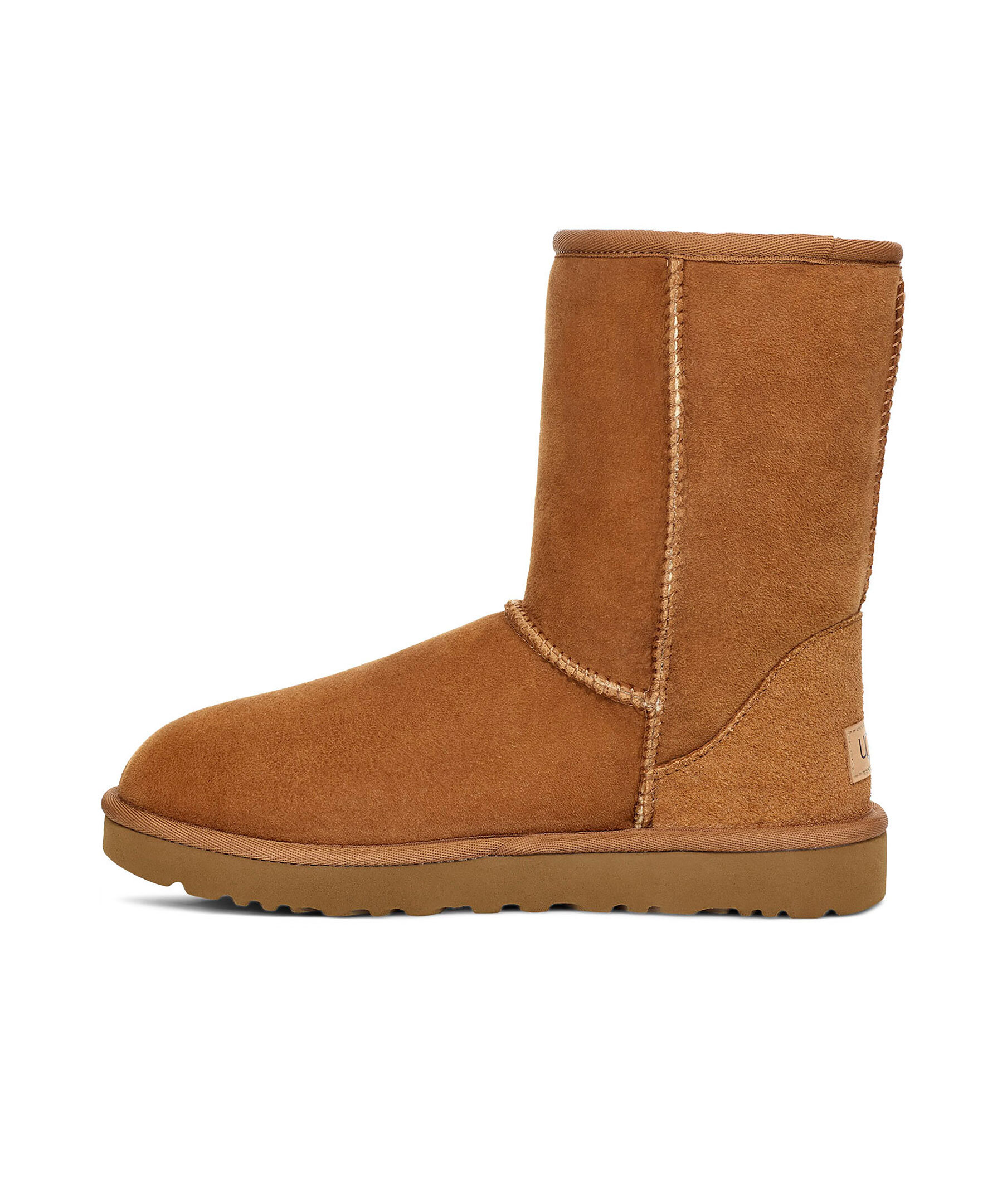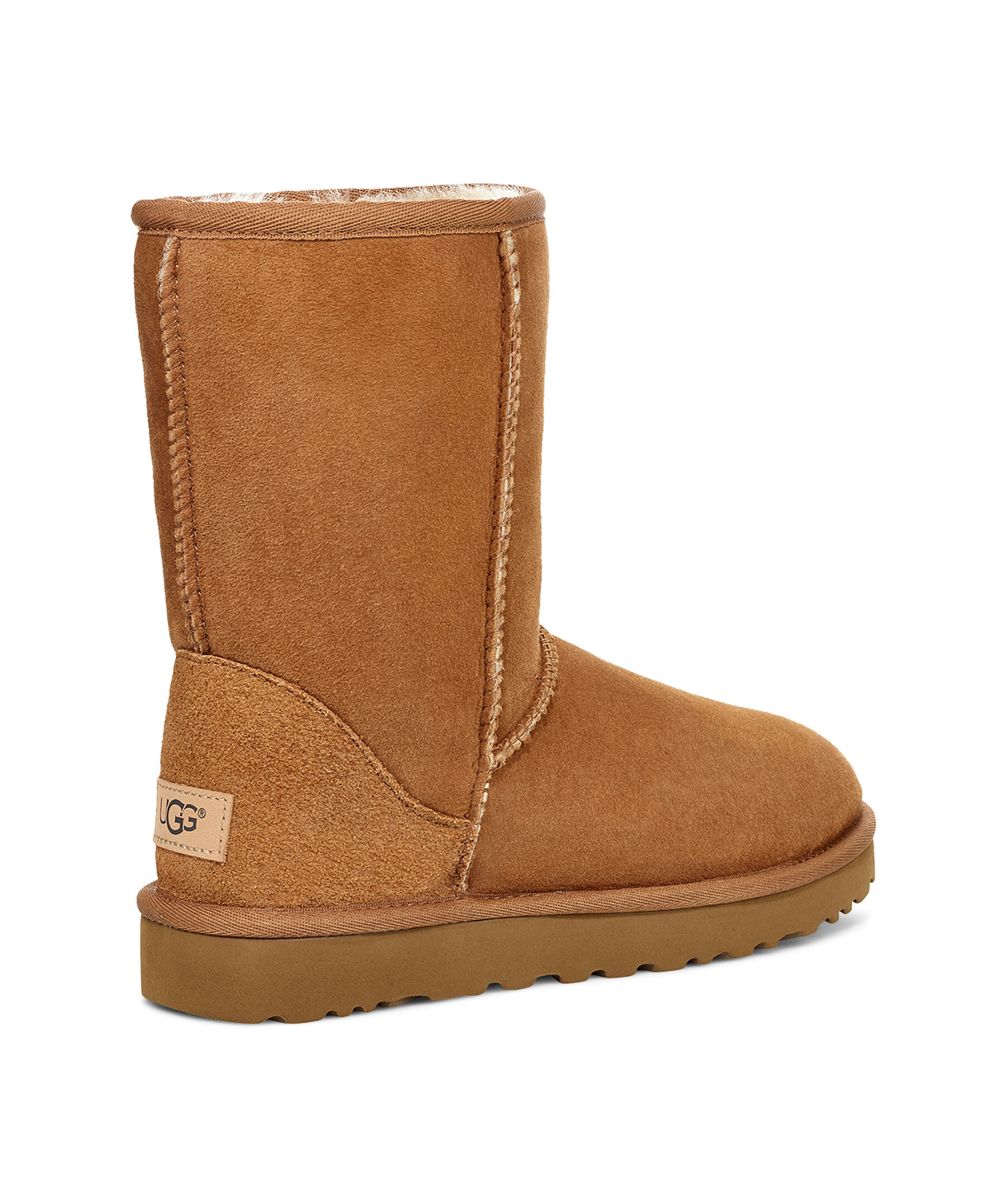 Beiga, klassiska UGGS i medellång modell, gjord i äkta skinn med värmande insida av ull. Skon är lätt vattenavstötande och har tjock sula som skyddar mot kalla underlag. Logotyp baktill, från UGG. De är inte tillverkade för slaskigt och blött klimat och rekommenderas att inte användas när det är blött ute. Man behöver behandla skorna med skoimpregnering regelbundet för att skorna ska hålla längre och stå emot väta bättre.