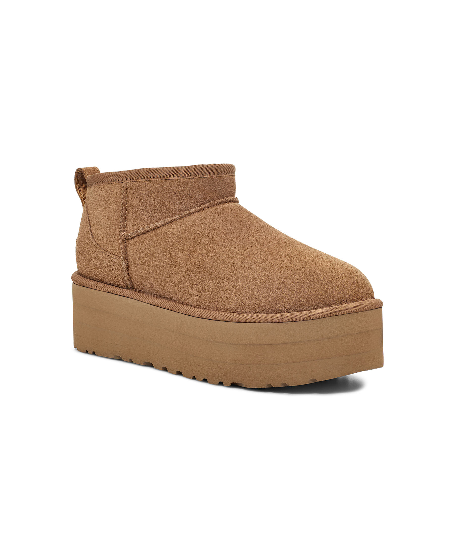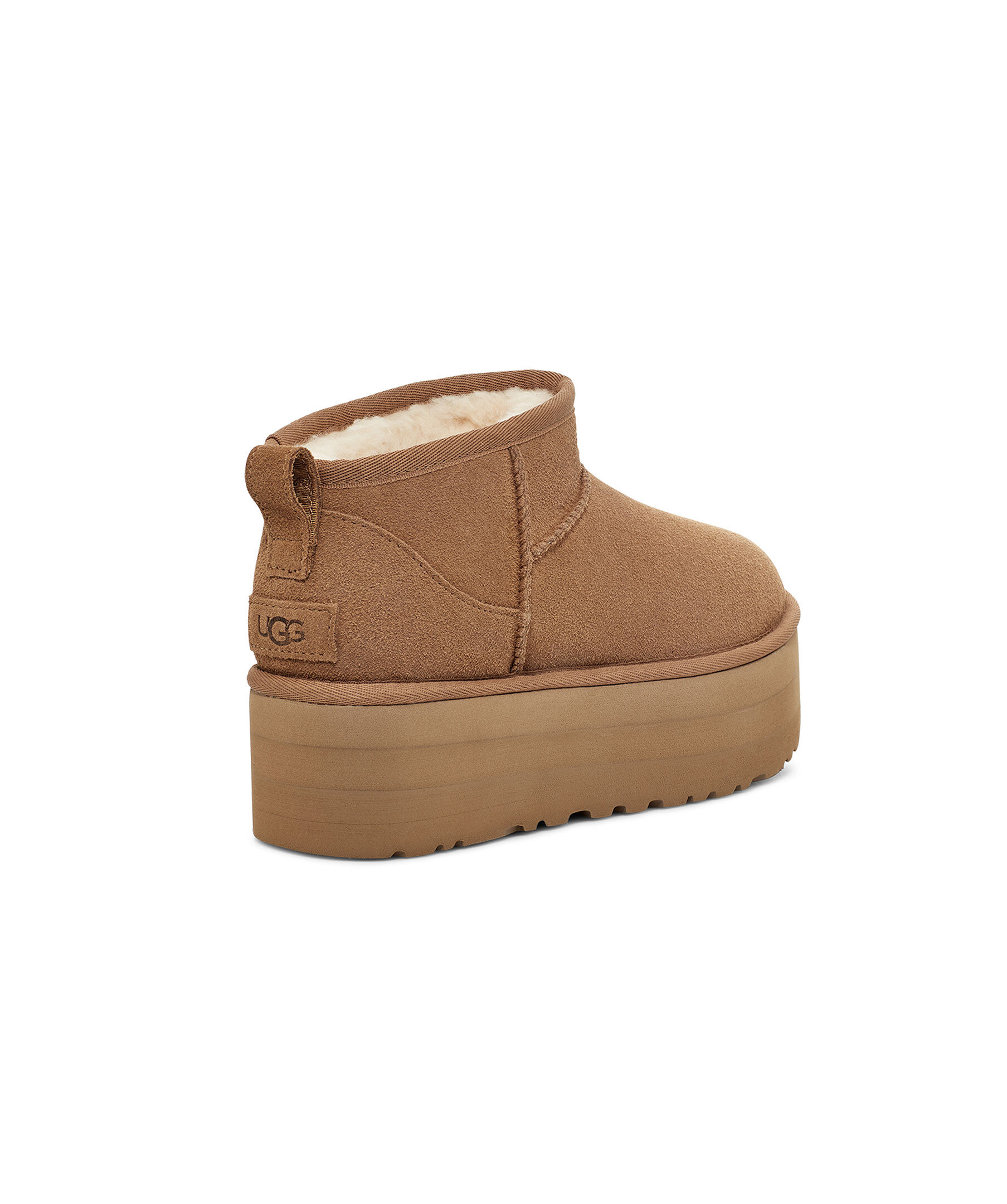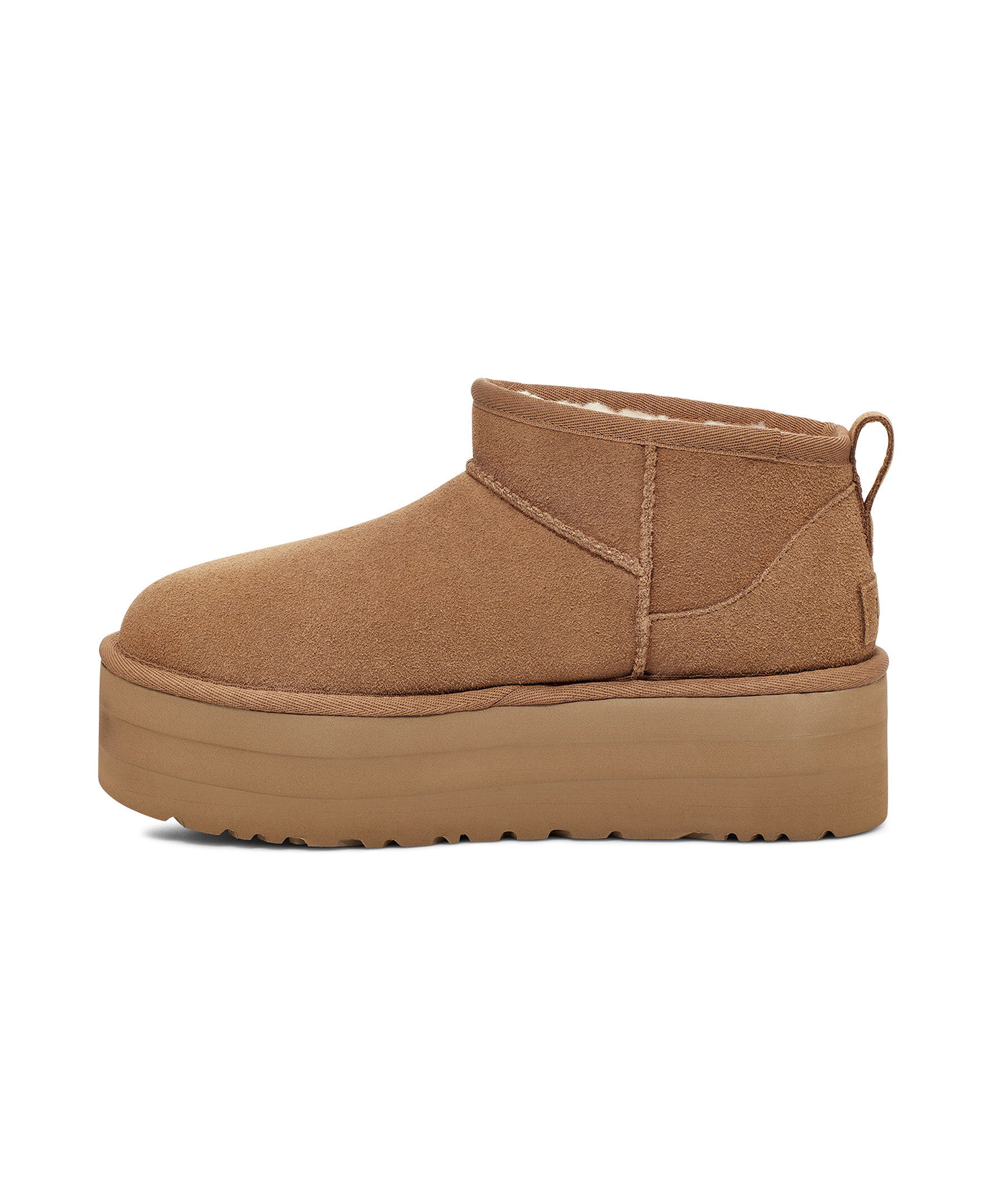 Beige, fodrade boot från UGG. En uppdaterad variant av UGGs mest ikoniska siluett med en lägre skafthöjd och högre sula. Förbehandlad med vattenavstötande behandling för att den ska se bättre ut längre. Tillverkad i fårskinn, ultramjukt UGGplush™-foder och har en flexibel, lätt sula i gummi. Overlocksömsdetaljer på sömmarna, dragflik bak och läderhäletikett med präglad UGG®-logotyp på hälen. 9cm skafthöjd. Vi rekommenderar att du köper din vanliga storlek för denna stil. Använd öglan på baksidan för att hjälpa dig att få på skon på din fot. De är inte tillverkade för slaskigt och blött klimat och rekommenderas att inte användas när det är blött ute. Man behöver behandla skorna med skoimpregnering regelbundet för att skorna ska hålla längre och stå emot väta bättre.