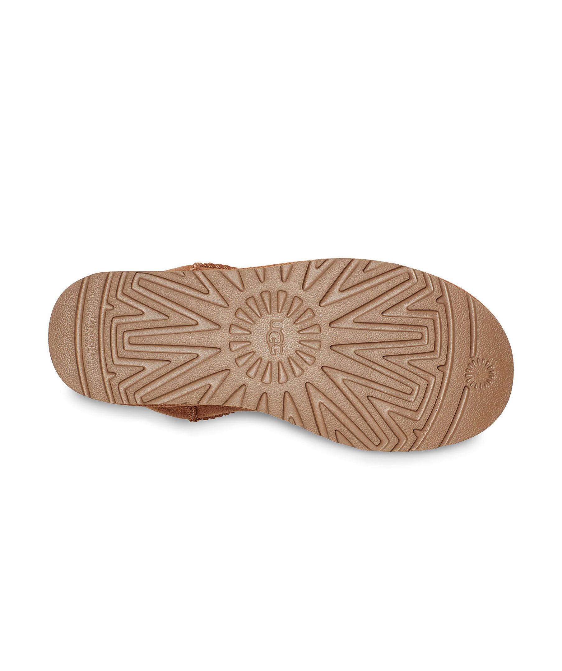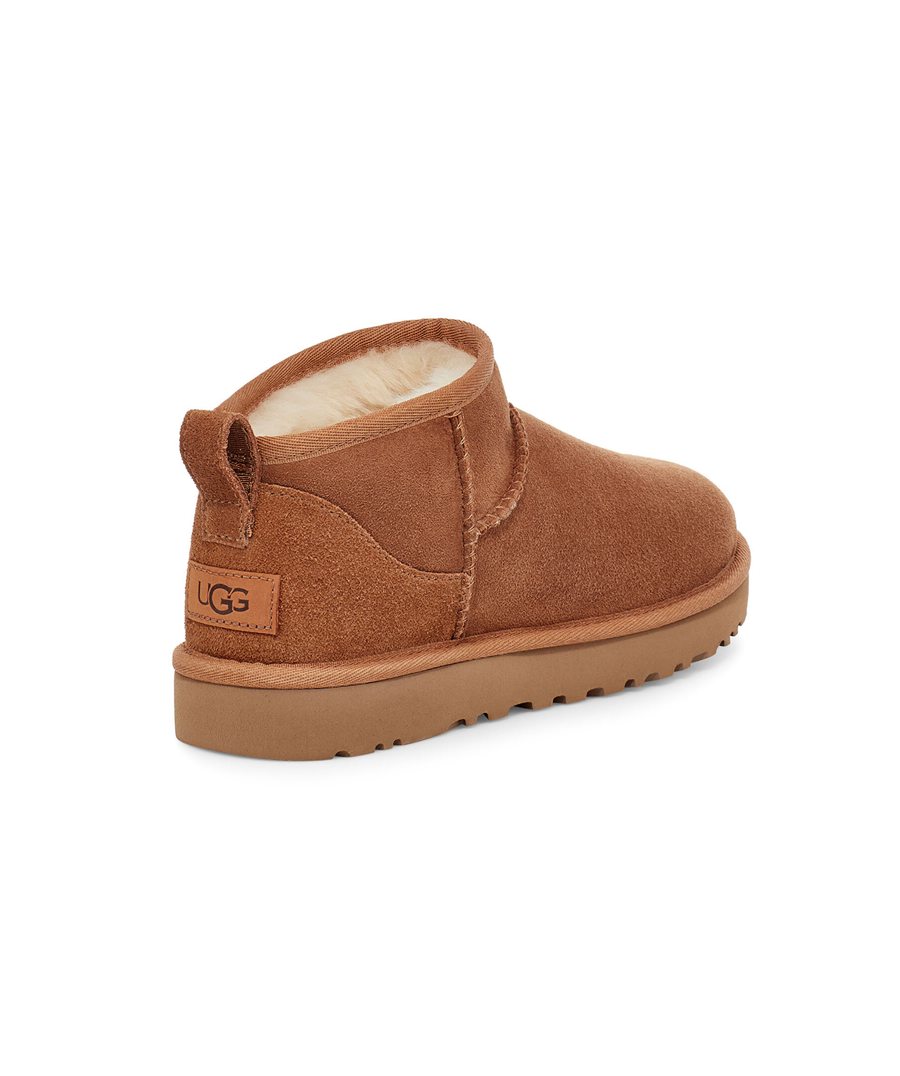 Beige, fodrade boot från UGG. Classic Ultra Mini är en uppdaterad variant av UGGs mest ikoniska siluett med en lägre skafthöjd. Förbehandlad med vattenavstötande behandling för att den ska se bättre ut längre. Tillvekad i fårskinn, ultramjukt UGGplush™-foder och har en flexibel, lätt sula i gummi. Asymmetrisk överlinje, overlocksömsdetaljer på sömmarna, dragflik bak och läderhäletikett med präglad UGG®-logotyp på hälen. 3,5" skafthöjd. De är inte tillverkade för slaskigt och blött klimat och rekommenderas att inte användas när det är blött ute. Man behöver behandla skorna med skoimpregnering regelbundet för att skorna ska hålla längre och stå emot väta bättre.