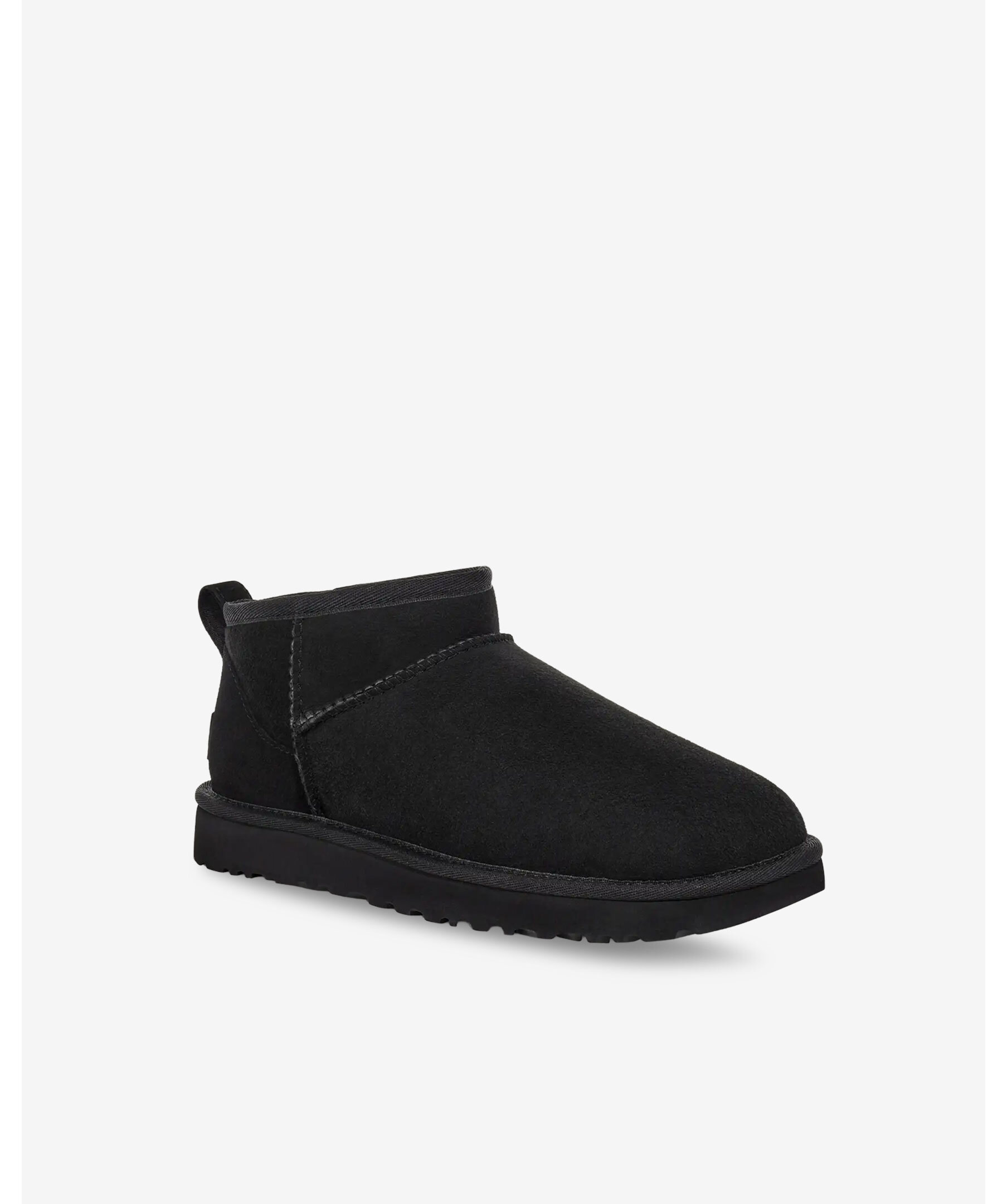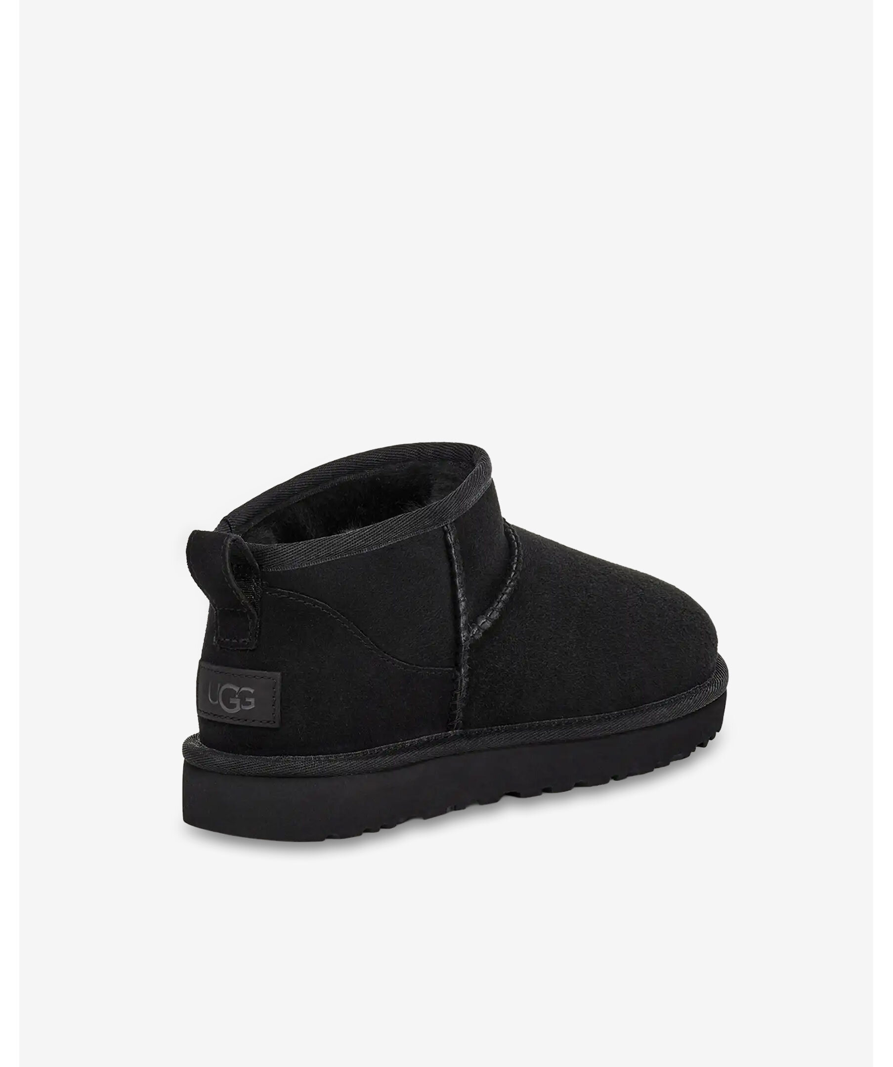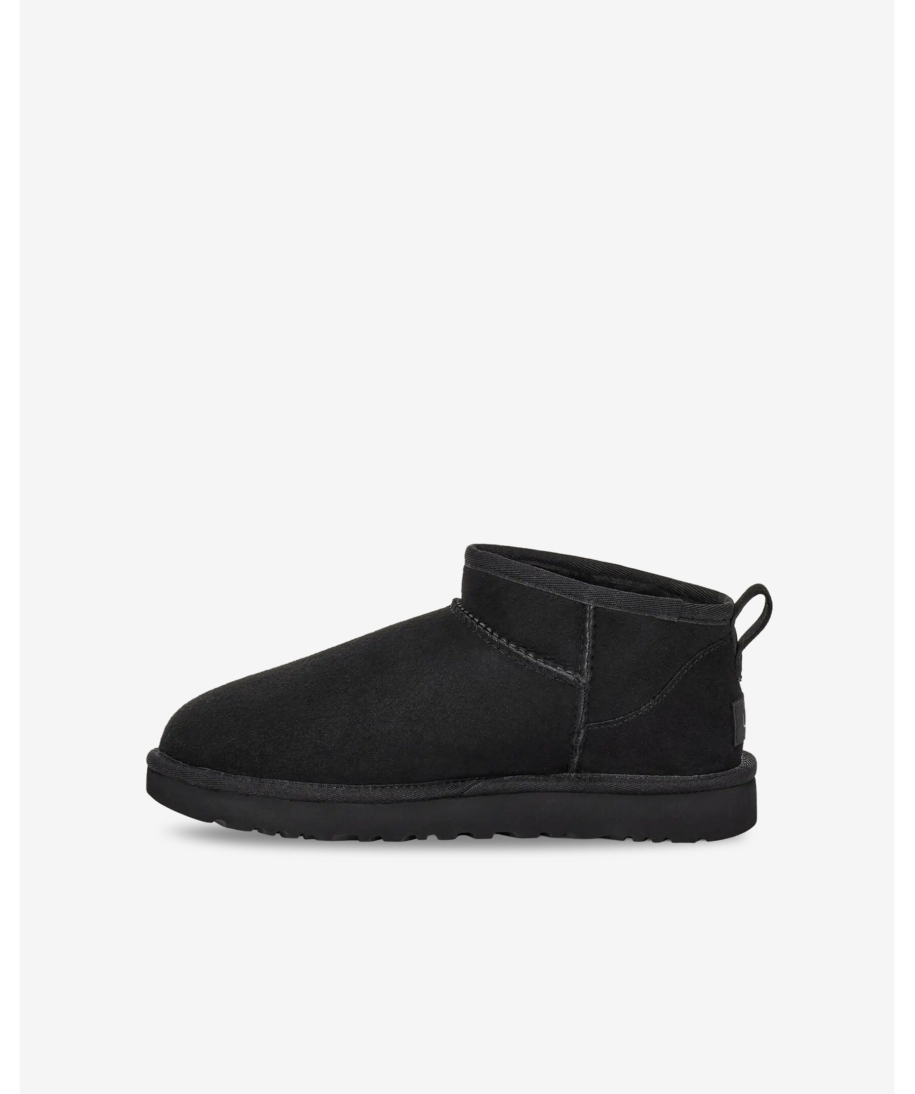 Svart, fodrad boot från UGG. Classic Ultra Mini är en uppdaterad variant av UGGs mest ikoniska siluett med en lägre skafthöjd. Förbehandlad med vattenavstötande behandling för att den ska se bättre ut längre. Tillverkad i fårskinn, ultramjukt UGGplush™-foder och har en flexibel, lätt sula i gummi. Asymmetrisk överlinje, overlocksömsdetaljer på sömmarna, dragflik bak och läderhäletikett med präglad UGG®-logotyp på hälen. 3,5" skafthöjd. De är inte tillverkade för slaskigt och blött klimat och rekommenderas att inte användas när det är blött ute. Man behöver behandla skorna med skoimpregnering regelbundet för att skorna ska hålla längre och stå emot väta bättre.