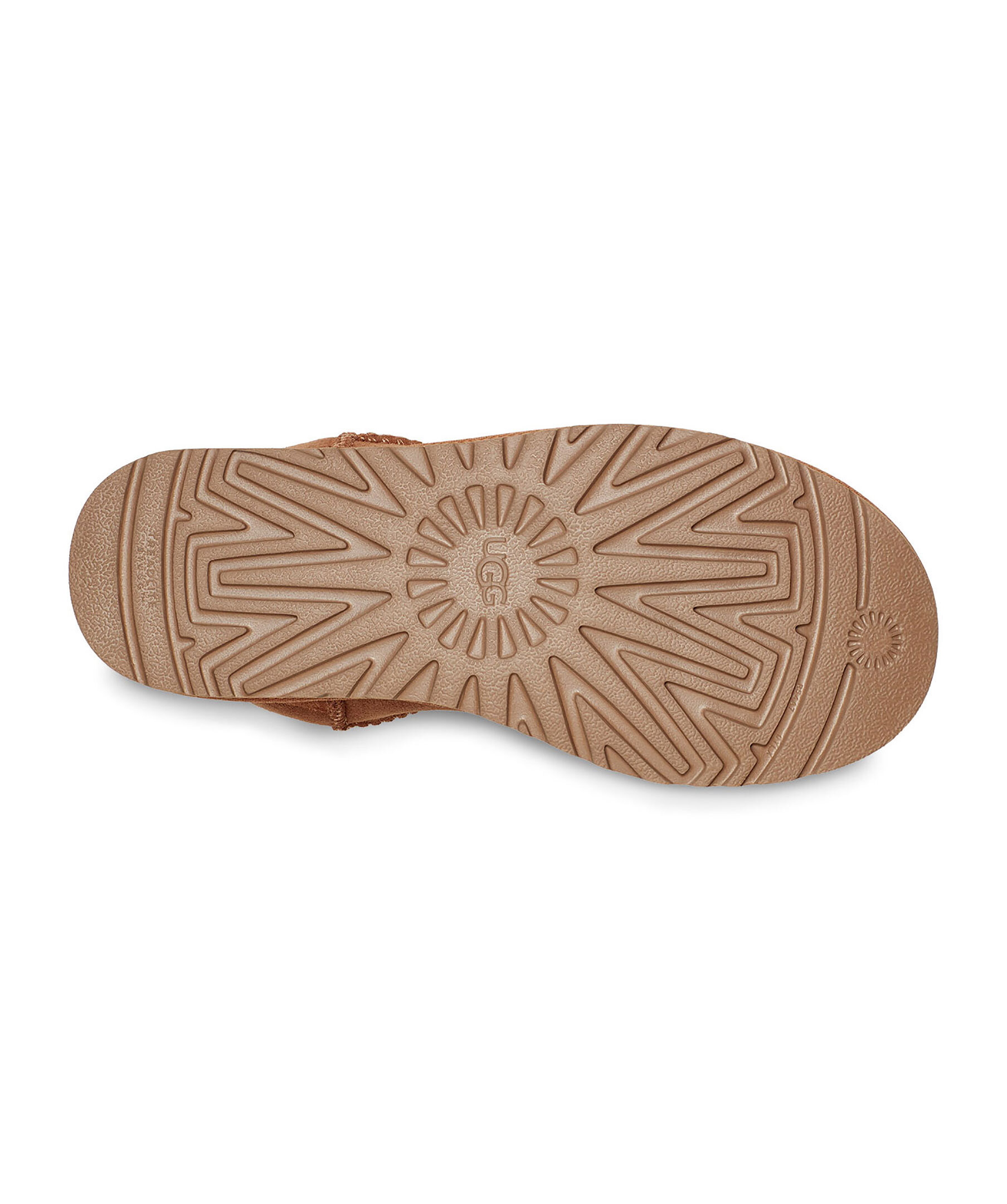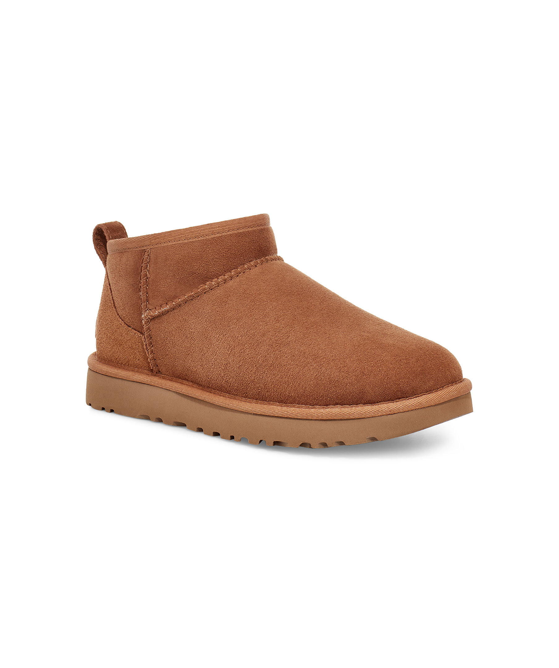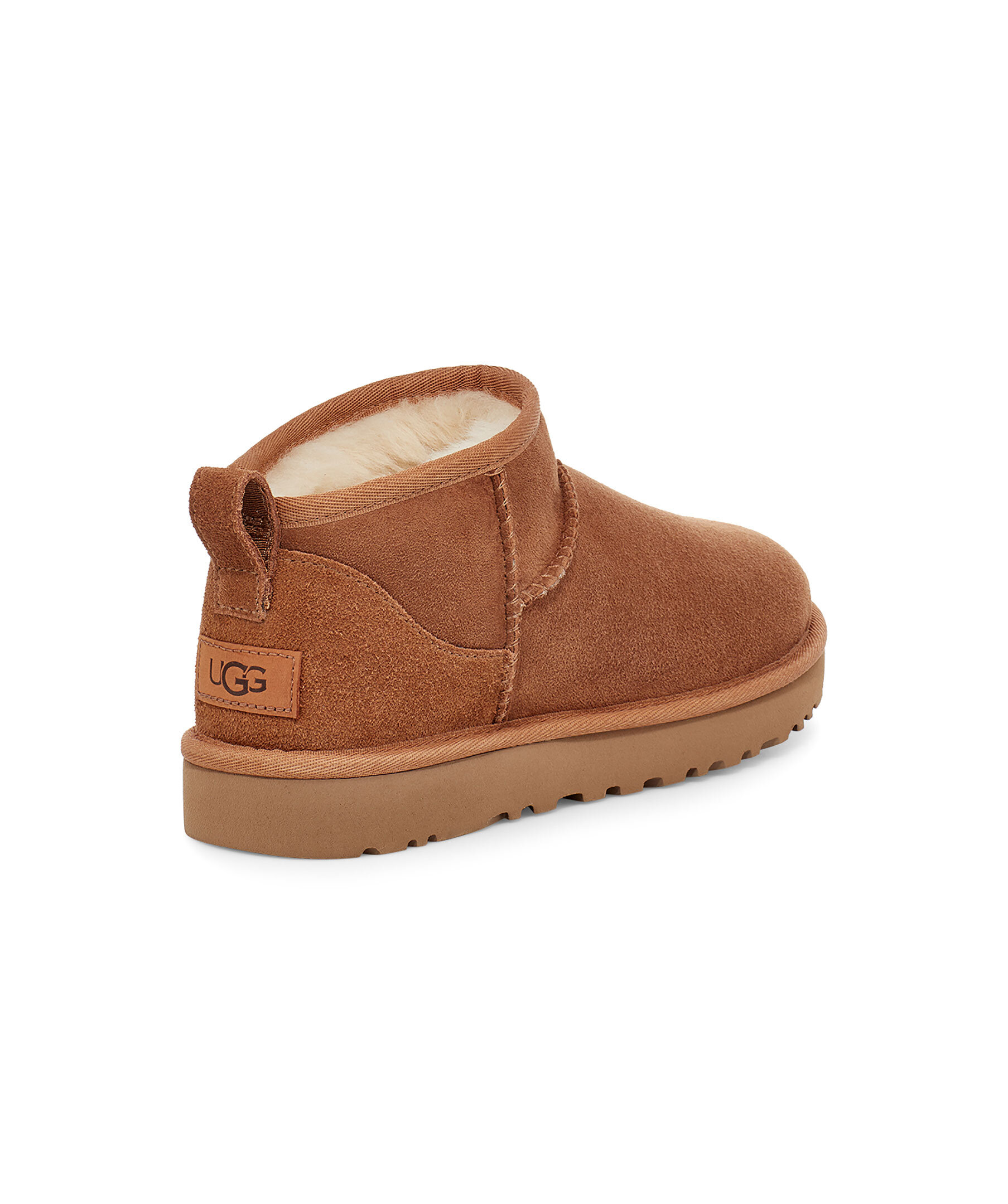 Beigea, fodrad boot från UGG. Classic Ultra Mini är en uppdaterad variant av UGGs mest ikoniska siluett med en lägre skafthöjd. Förbehandlad med vattenavstötande behandling för att den ska se bättre ut längre. Tillverkad i fårskinn, ultramjukt UGGplush™-foder och har en flexibel, lätt sula i gummi. Asymmetrisk överlinje, overlocksömsdetaljer på sömmarna, dragflik bak och läderhäletikett med präglad UGG®-logotyp på hälen. 3,5" skafthöjd. De är inte tillverkade för slaskigt och blött klimat och rekommenderas att inte användas när det är blött ute. Man behöver behandla skorna med skoimpregnering regelbundet för att skorna ska hålla längre och stå emot väta bättre.