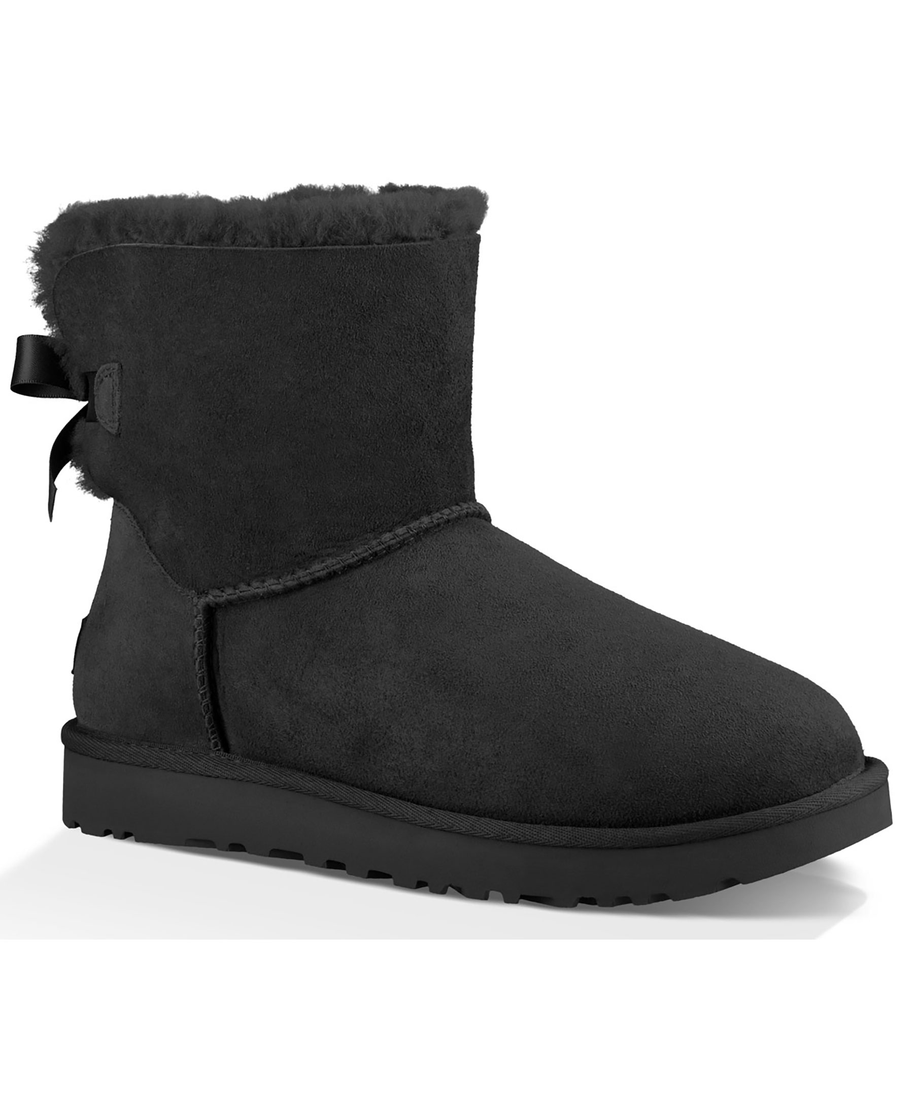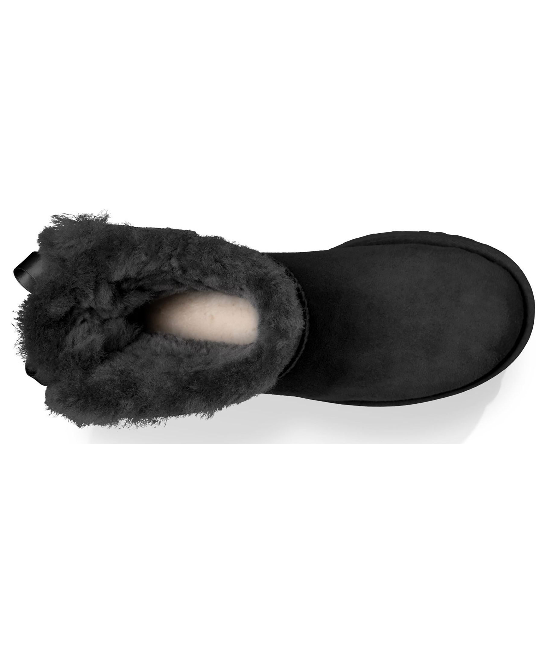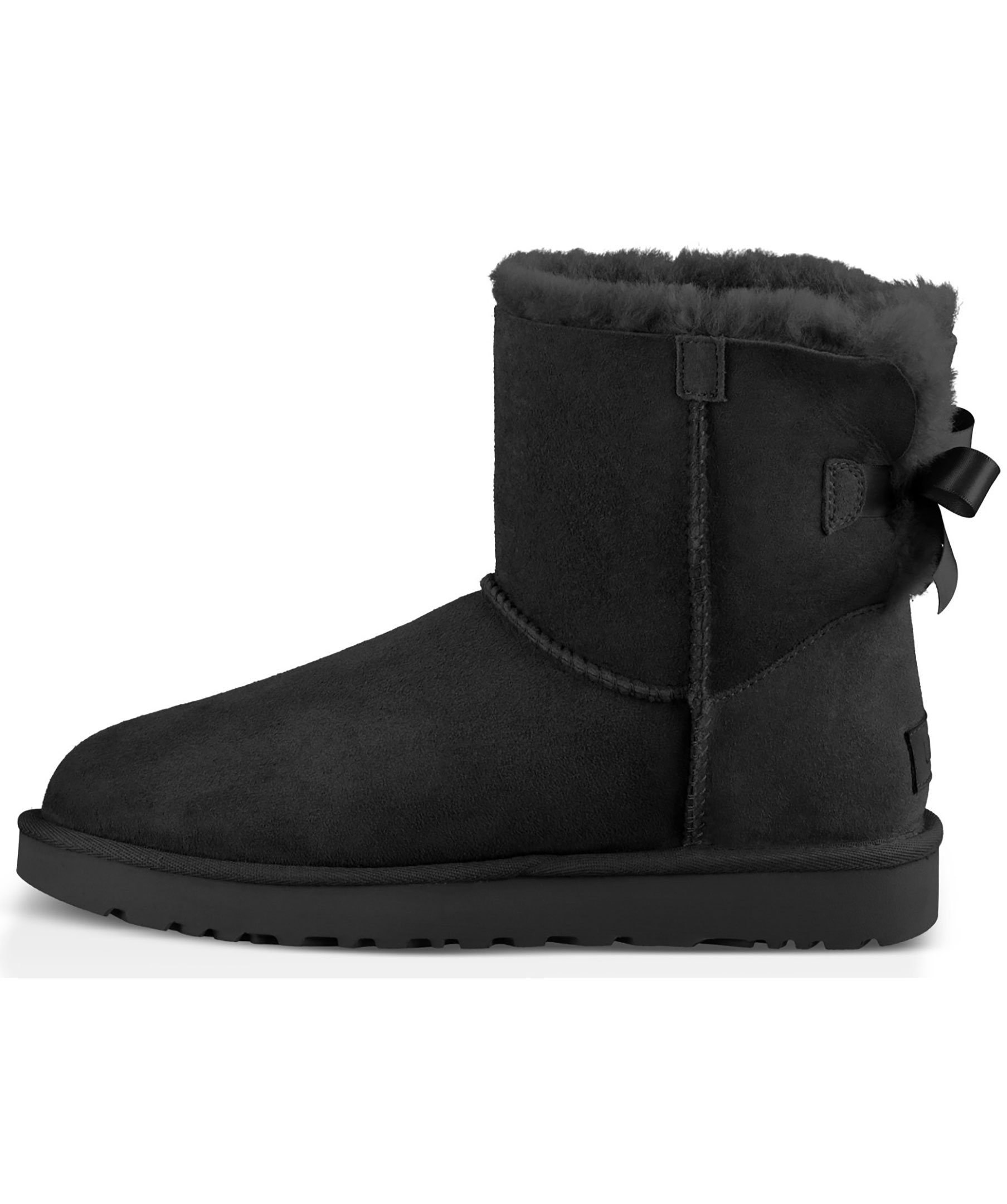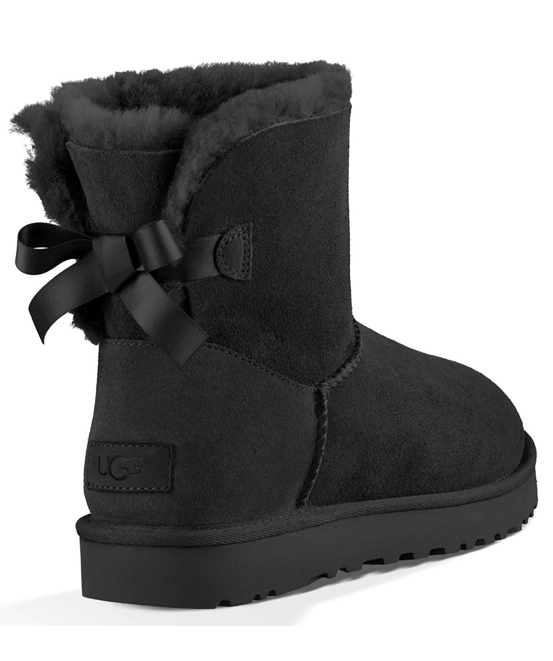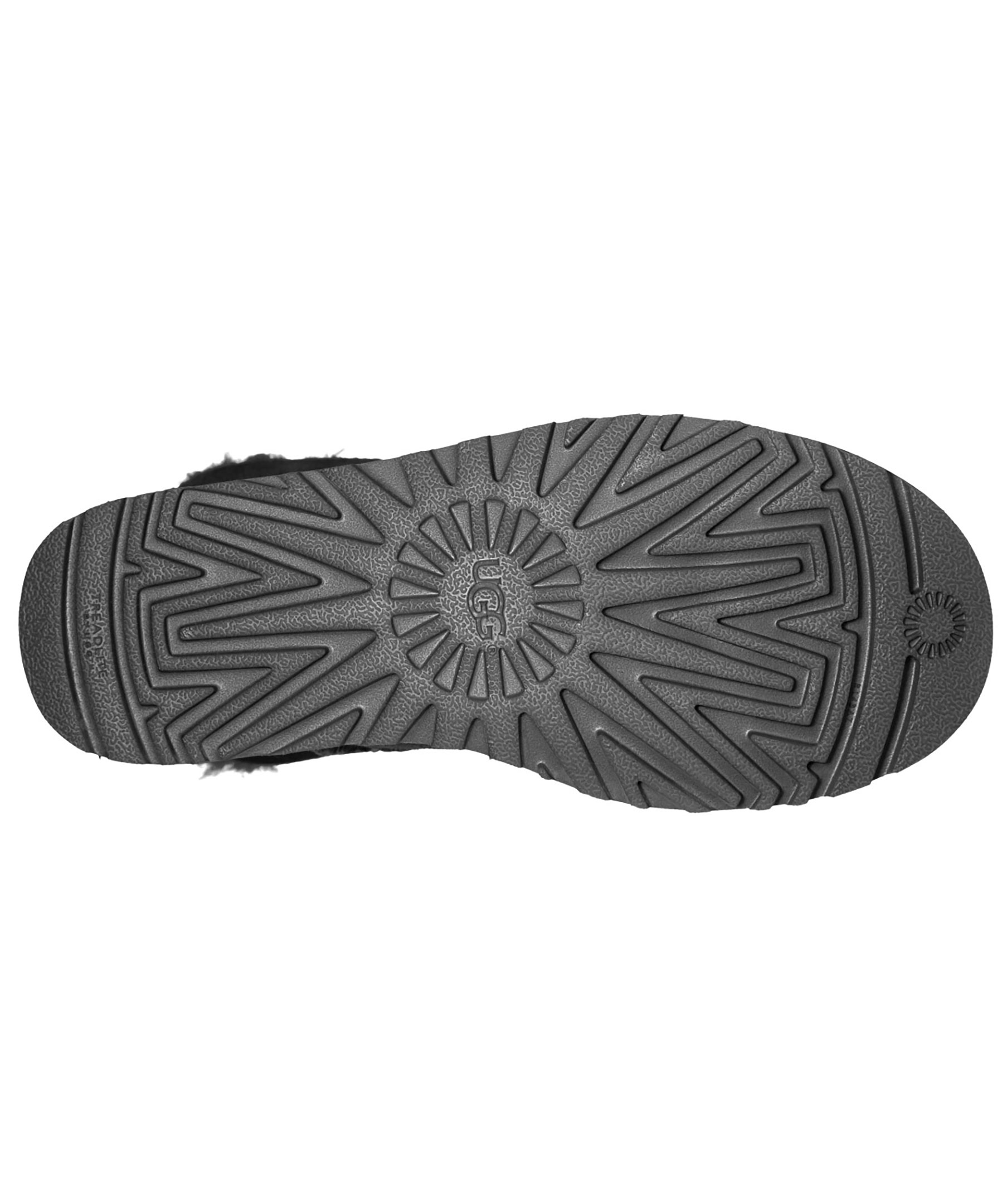 Svarta skor från UGG, gjorda i äkta skinn med värmande insida av ull samt gullig rosett baktill. Skon är lätt vattenavstötande och har tjock sula som skyddar mot kalla underlag. Logotyp baktill. De är inte tillverkade för slaskigt och blött klimat och rekommenderas att inte användas när det är blött ute. Man behöver behandla skorna med skoimpregnering regelbundet för att skorna ska hålla längre och stå emot väta bättre.