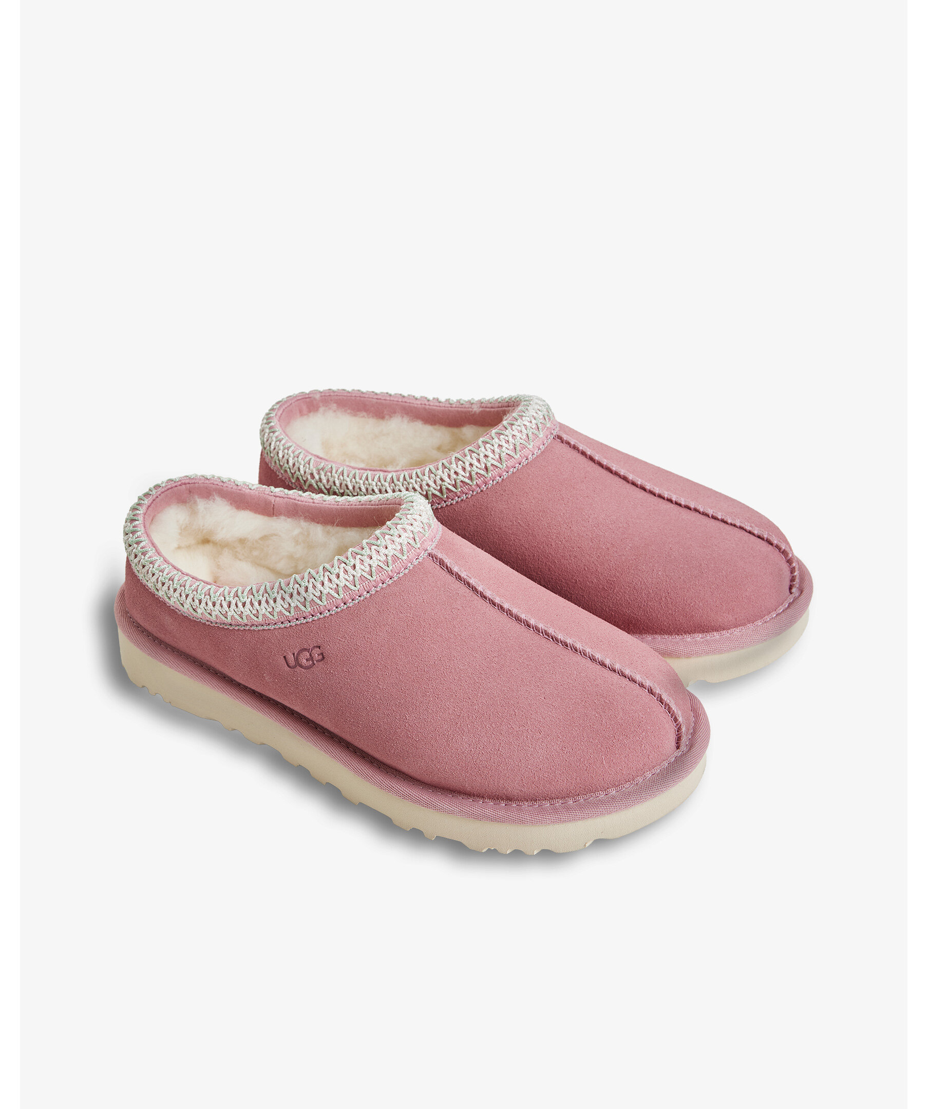 Rosa Tasman tofflor från UGG i mjuk mocka med dekorativ broderad kant. Skorna har ett varmt fårskinnsfoder och en lätt, slitstark sula som gör dem perfekta både inomhus och utomhus för maximal komfort och avslappnad stil.