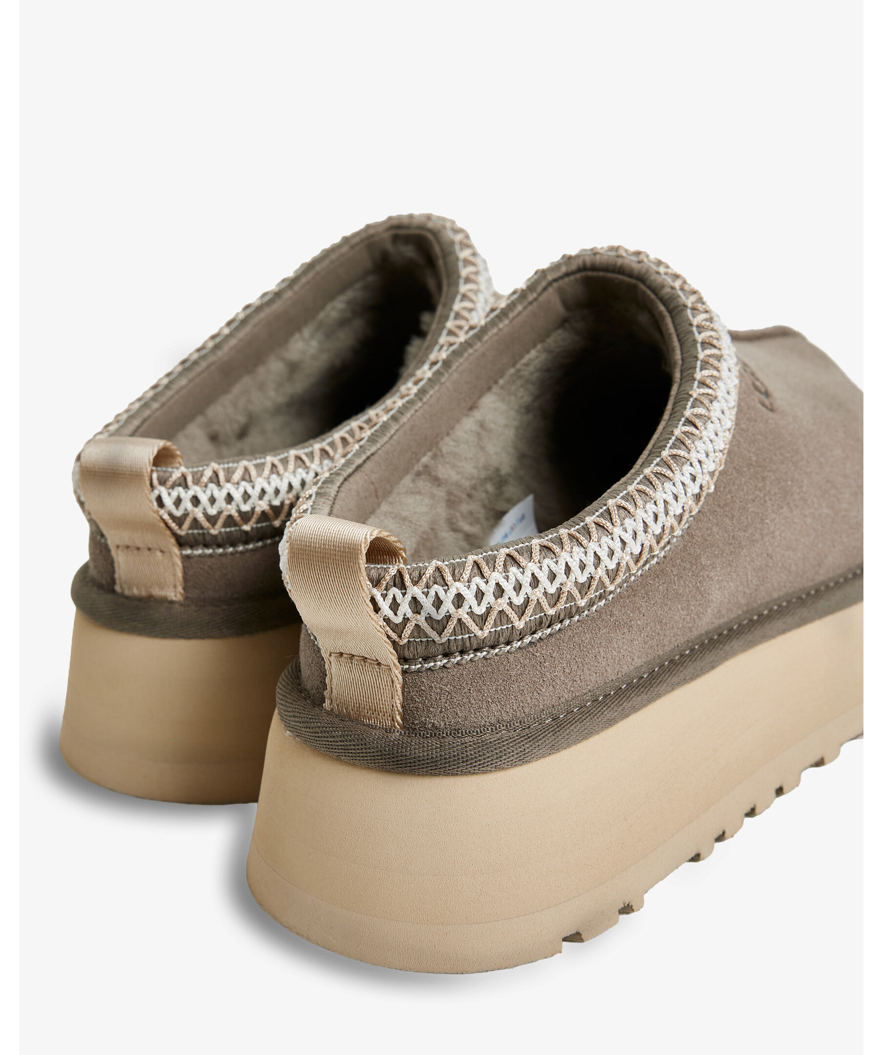 Tazz ii i färgen Dried Oregano från UGG i mjuk mocka med dekorativ flätad kant. Skorna har varmt fårskinnsfoder och en lätt platåsula som gör dem bekväma att bära både inomhus och utomhus.