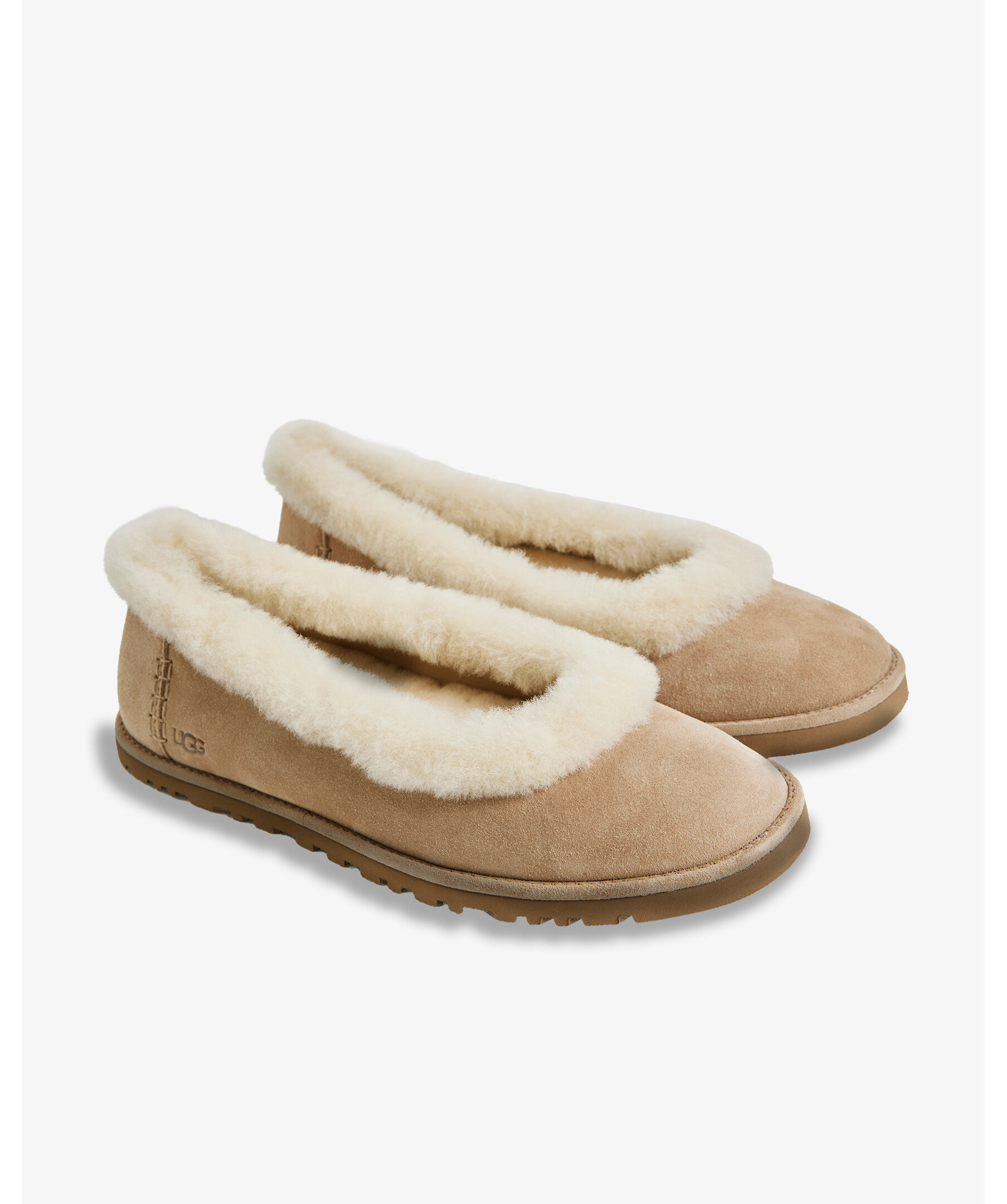 Zora Ballet Flat från UGG i färgen Sand - klassiska ballerinas i mocka med sheepskin‑fodrad innersula och lätt sugarcane EVA‑yttersula som kombinerar elegant silhuett med komfort för vardaglig stil.