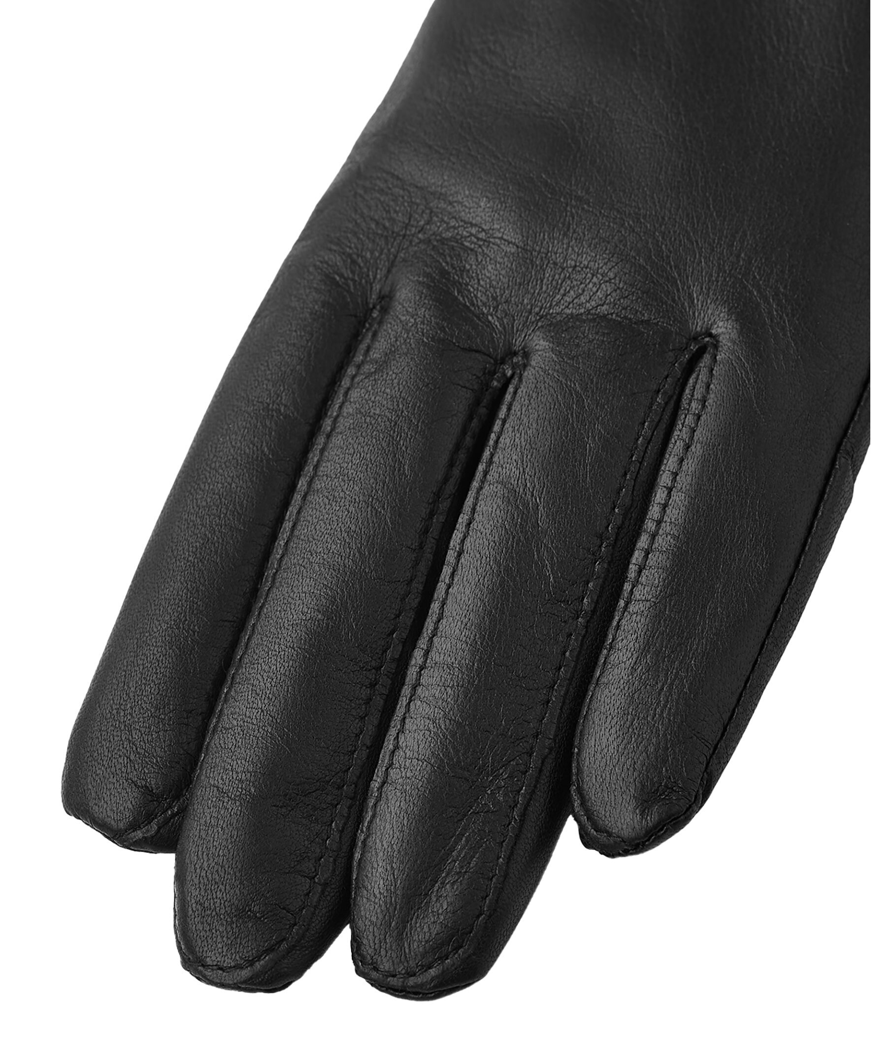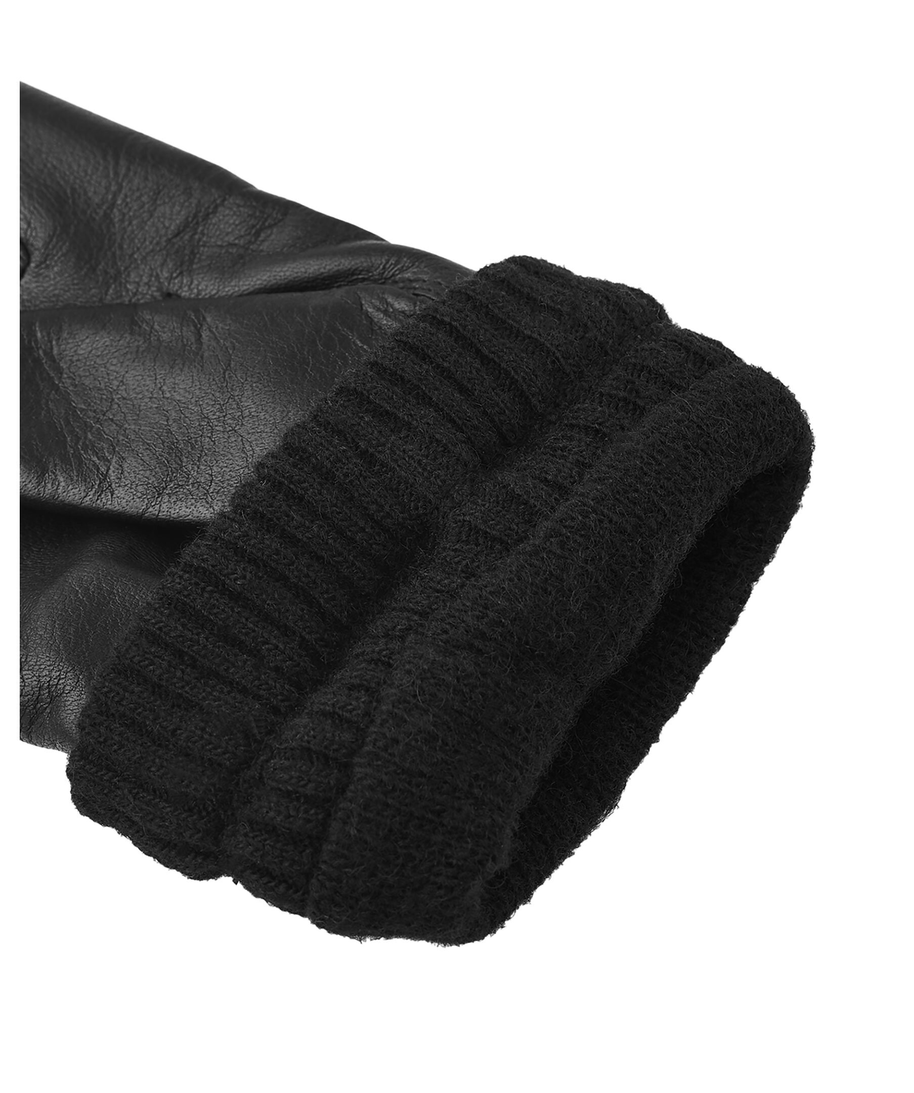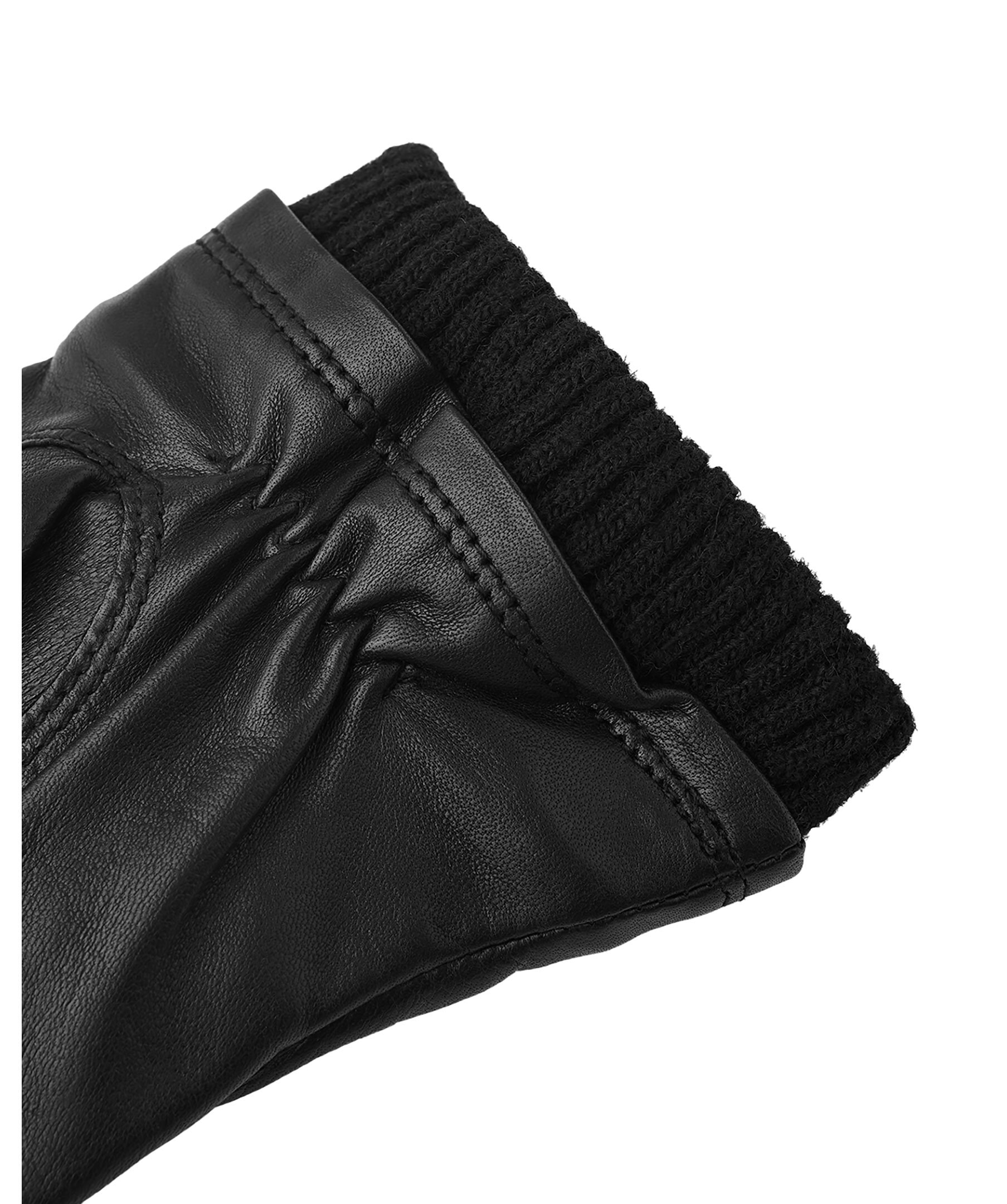 Svarta handskar i skinn med ribbstickad mudd från Viska. Sydd i mjuk, stretchig lammnappa med handnära passform och en liten resår på handledens insida. Ett mjukt stickat foder i ullmix ger lätt värme under småkyliga höst- och vinterdagar.