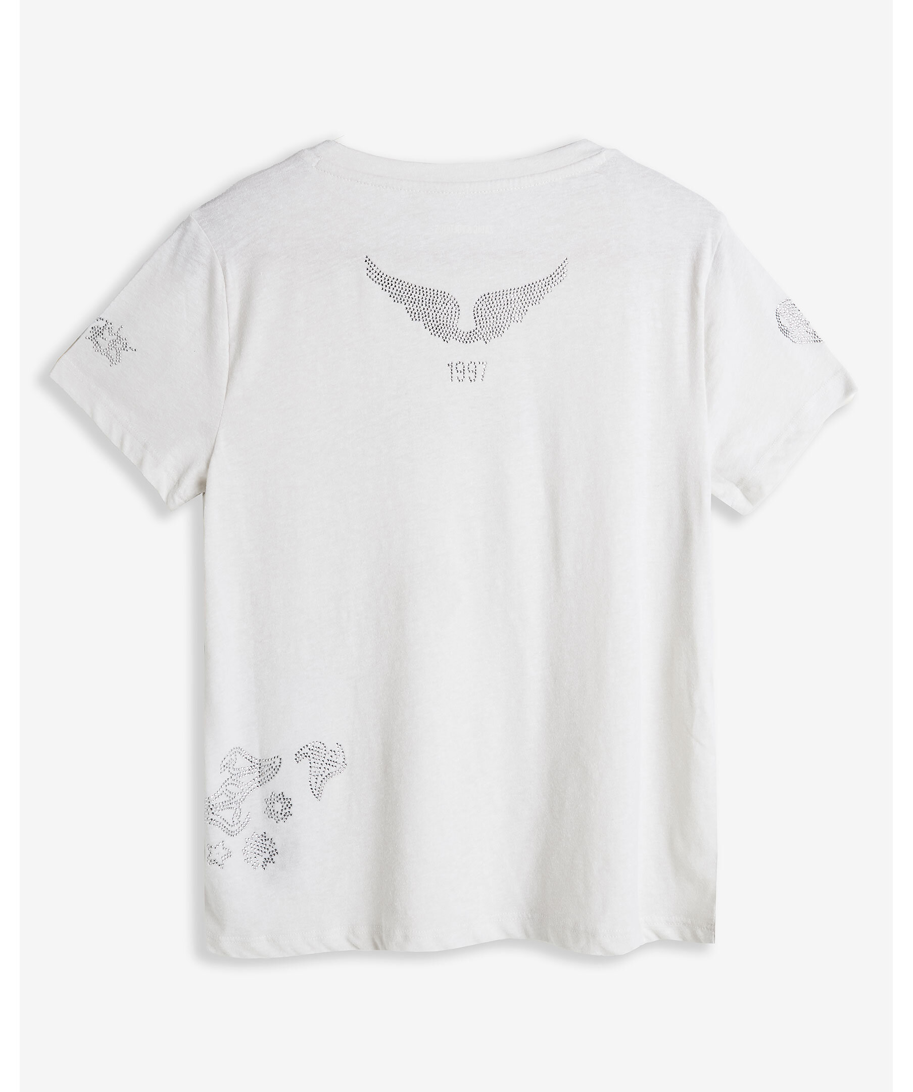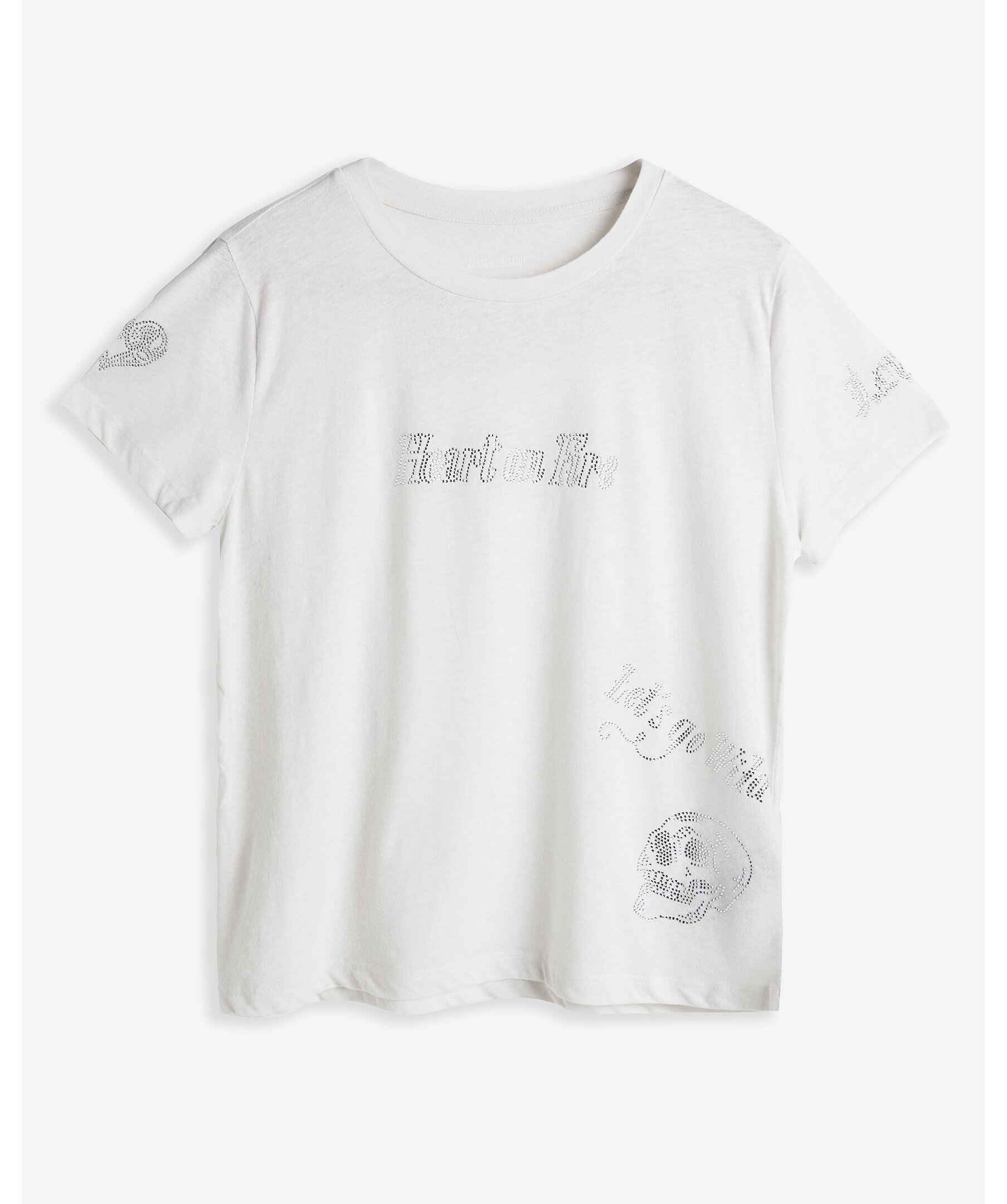 Krämvit, tunn t-shirt med flera specialdesignade strass-inskriptioner från Zadig Voltaire. T-shirten har rundad halsringning och korta ärmar. Tillverkad i en polyester-bomull- och linneblandning.