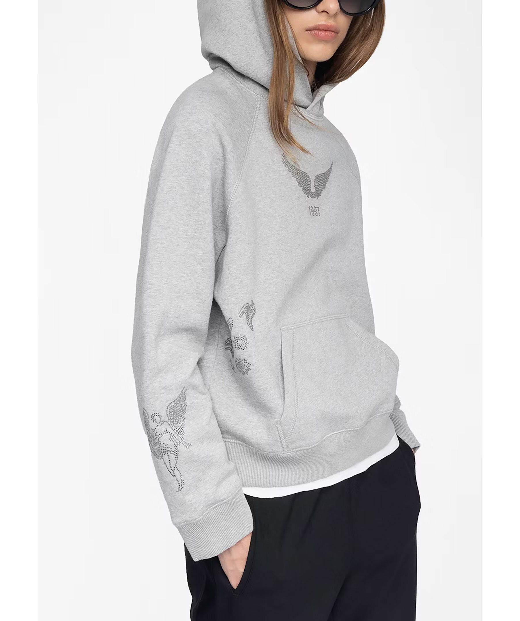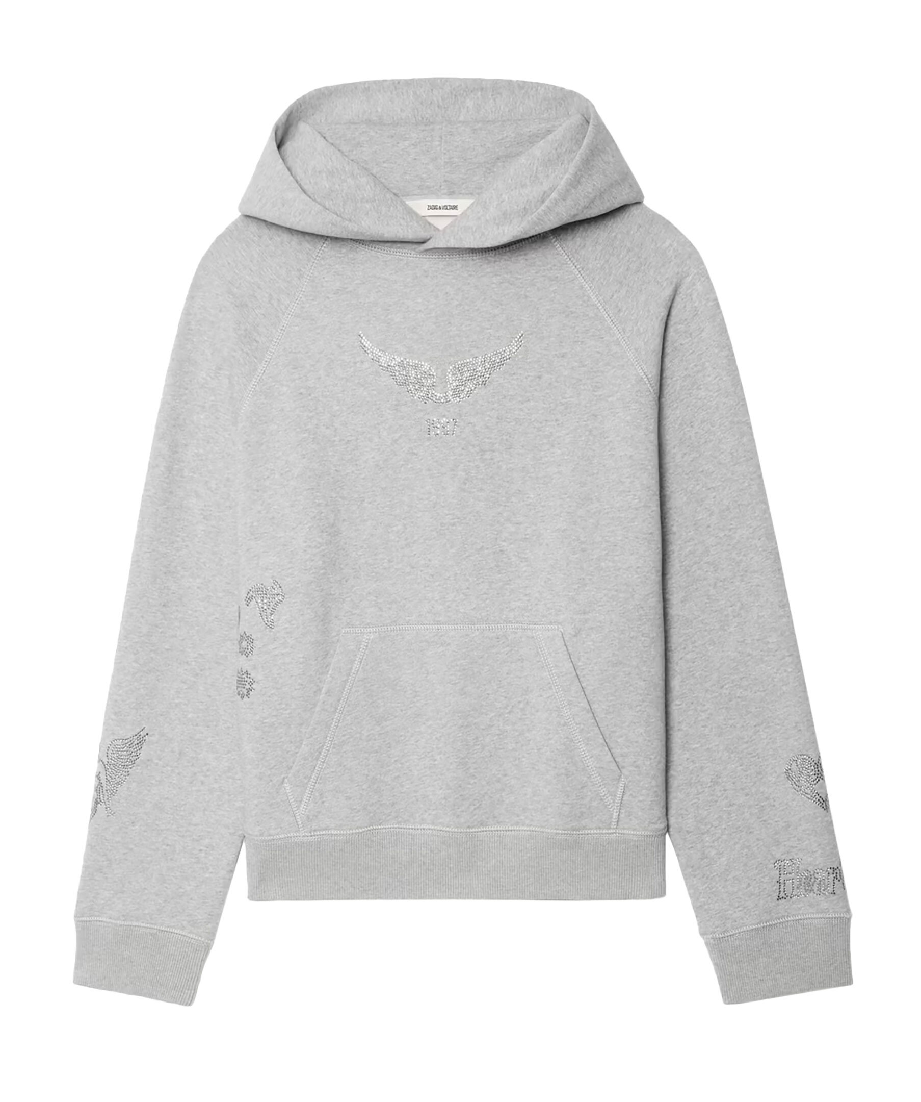 Grå hoodie från Zadig Voltaire. Hoodien har huva, långa ärmar, känguruficka på magen, ribbstickade muddar samt tryck med strasstenar. Tillverkad i bomull.