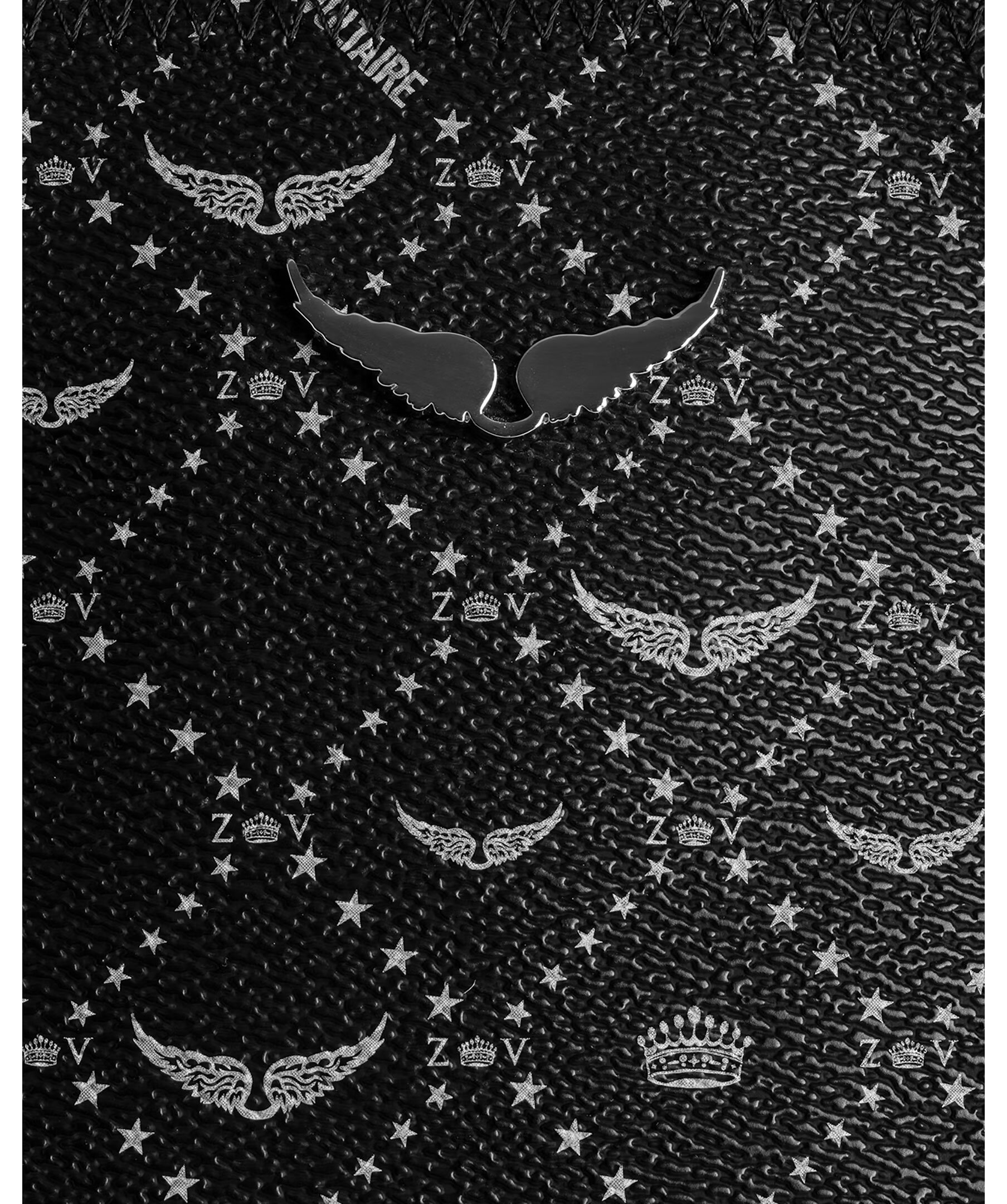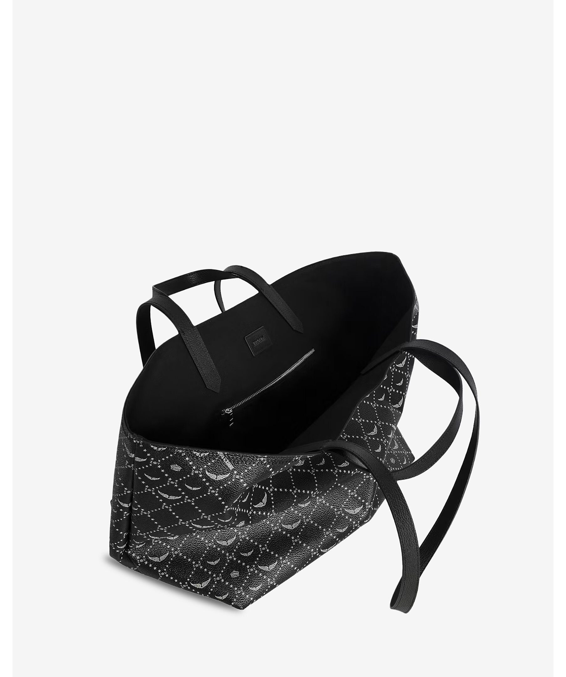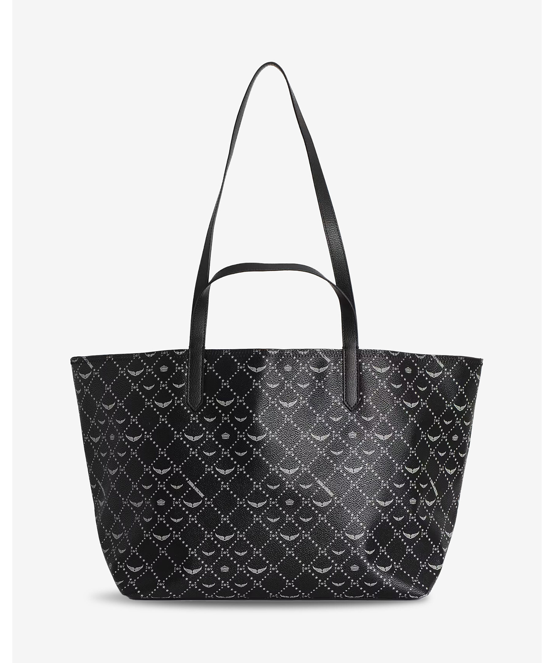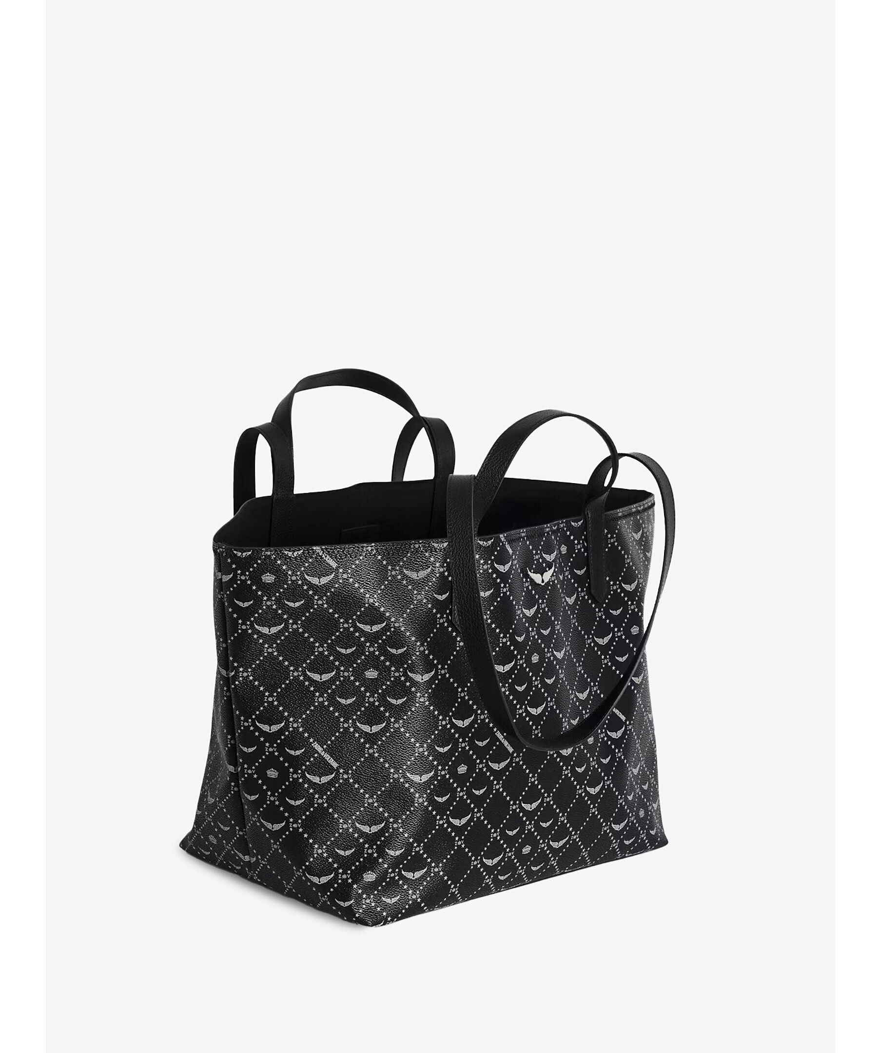 Svart tote bag från Zadig Voltaire. Väskan har genomgående monogramtryck, deras ikoniska metallvingar på framsidan. Tillverkad i konstläder. Mått: 54 x 30 x 23 cm. Handtagshöjd: 12.5 och 35 cm.
