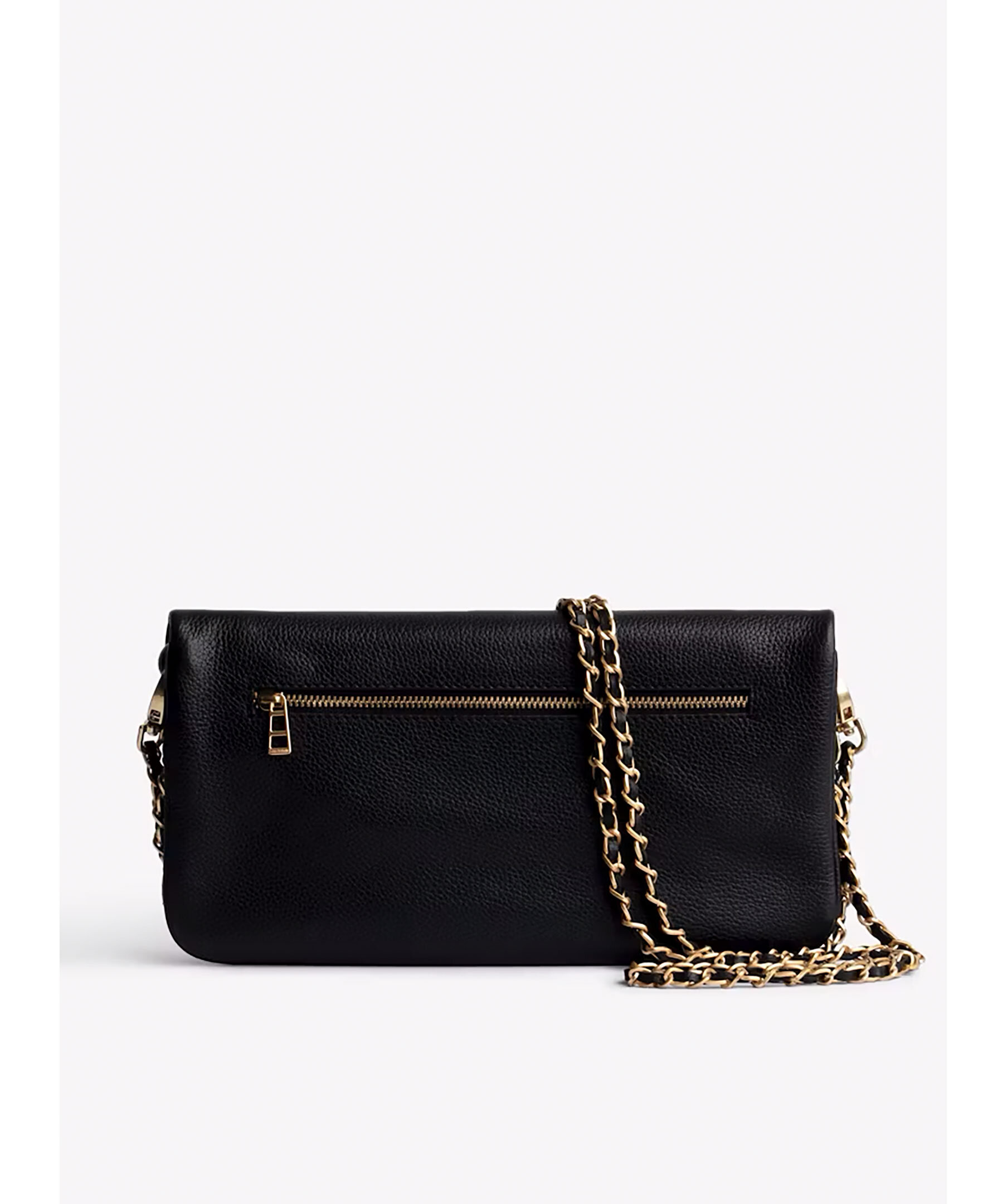 Svart läderclutch med guldtonade detaljer från Zadig Voltaire. Väskan har dubbel kedja och läderrem, så att du kan välja att bära den över kroppen eller på axeln. Bakficka med dragkedja. Väskan har en flik med magentstängning och dragkedja. Guldfärgad metall logotyp på framsidan. Tillverkad i ko-läder. Mått: B: 27cm / H: 13cm / D: 2cm. Kedjeremsfall: 33 cm och 57 cm.