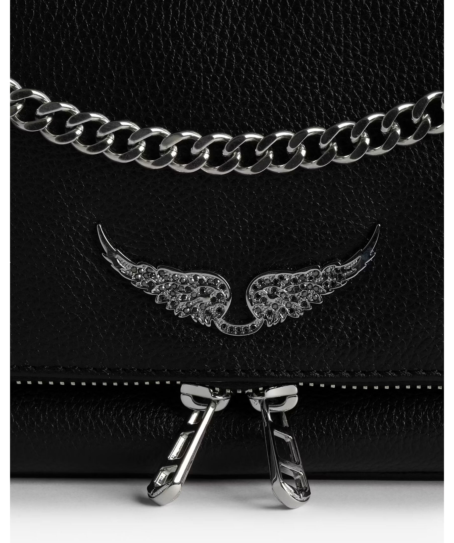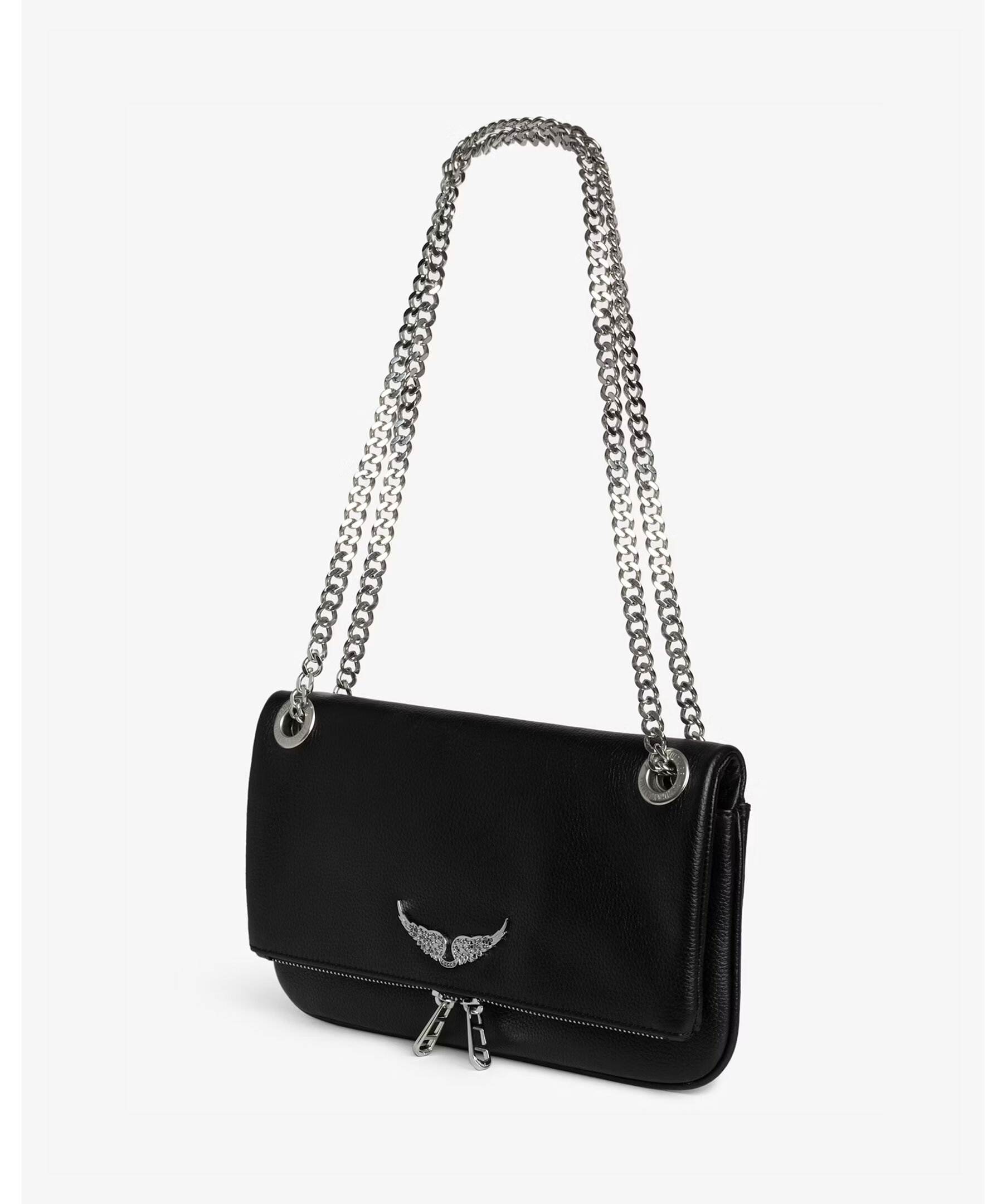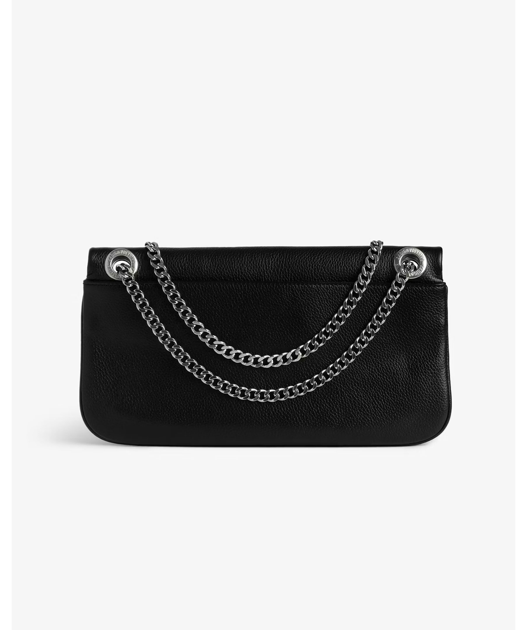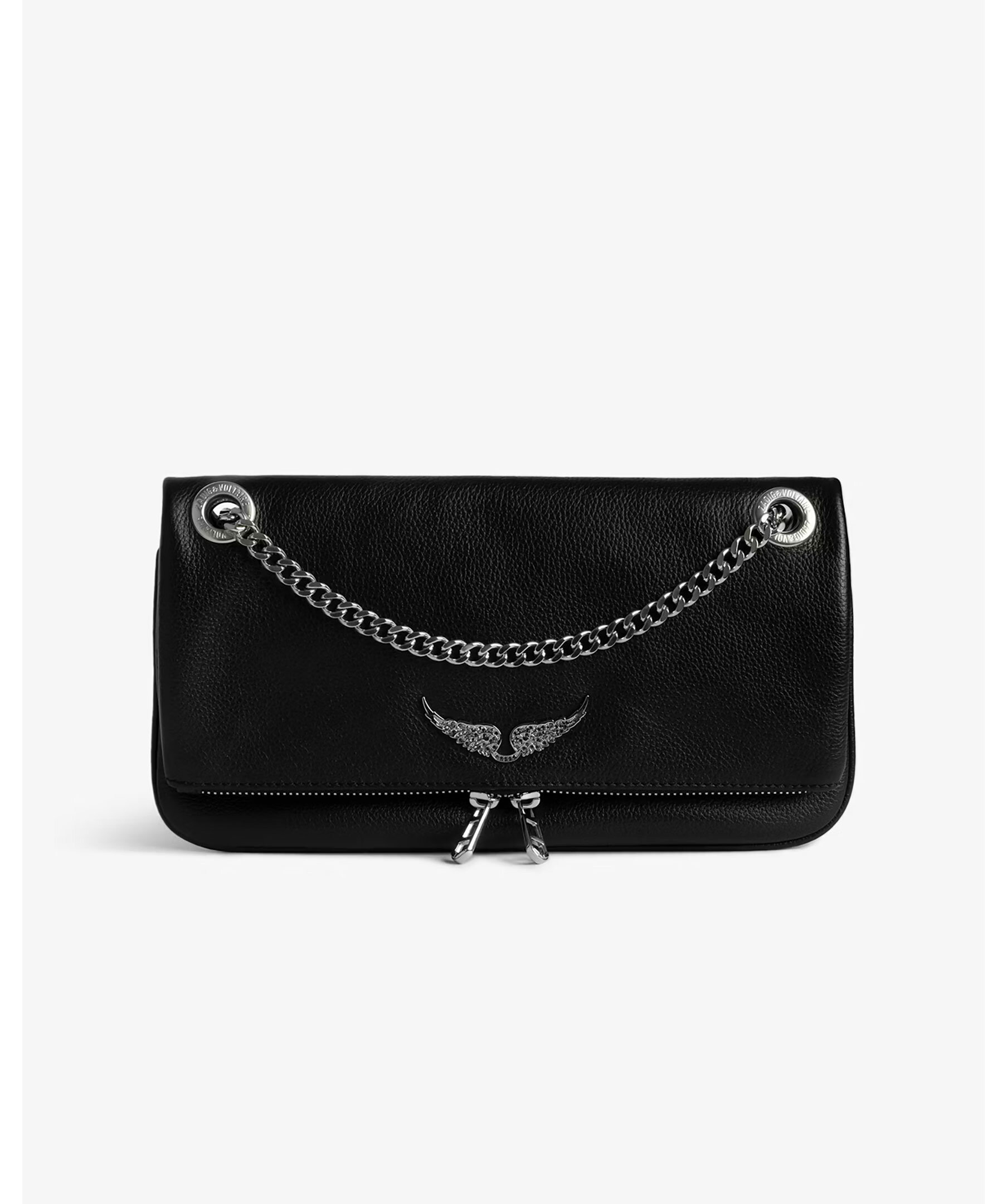 Svart kuvertväska i narvat läder från Zadig Voltaire. Väskan har en kedja i metall, dragkedja och magnetstängning, platt bakficka med magnetisk stängning samt sginaturvingar på framsidan. Tillverkad i läder. Mått: 27 x 12 cm.