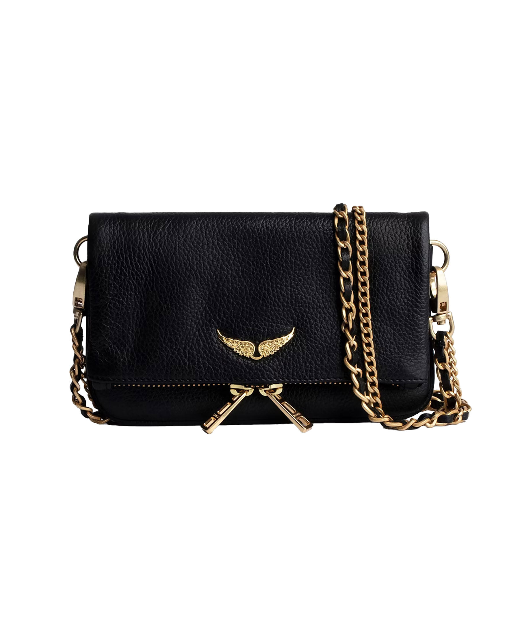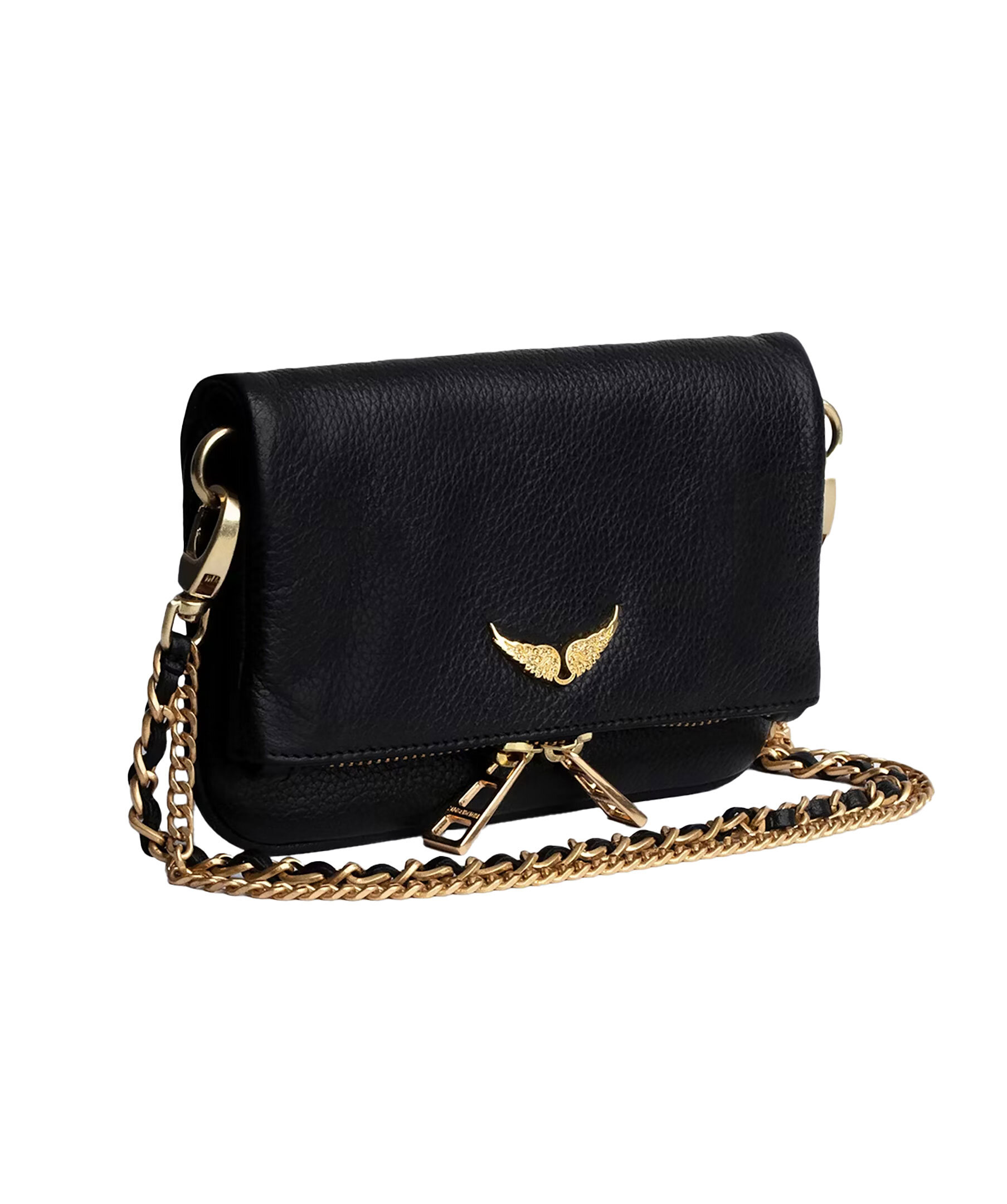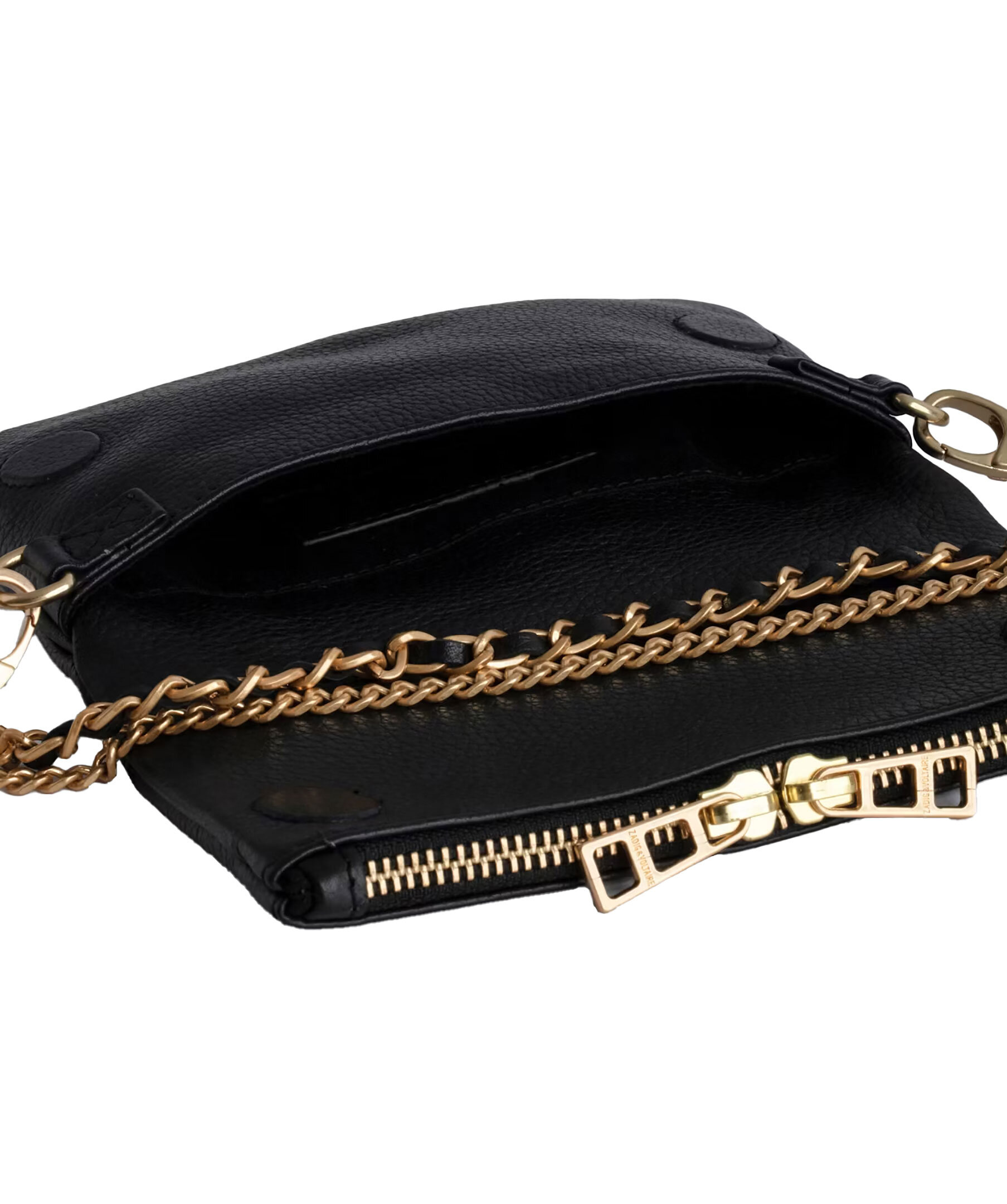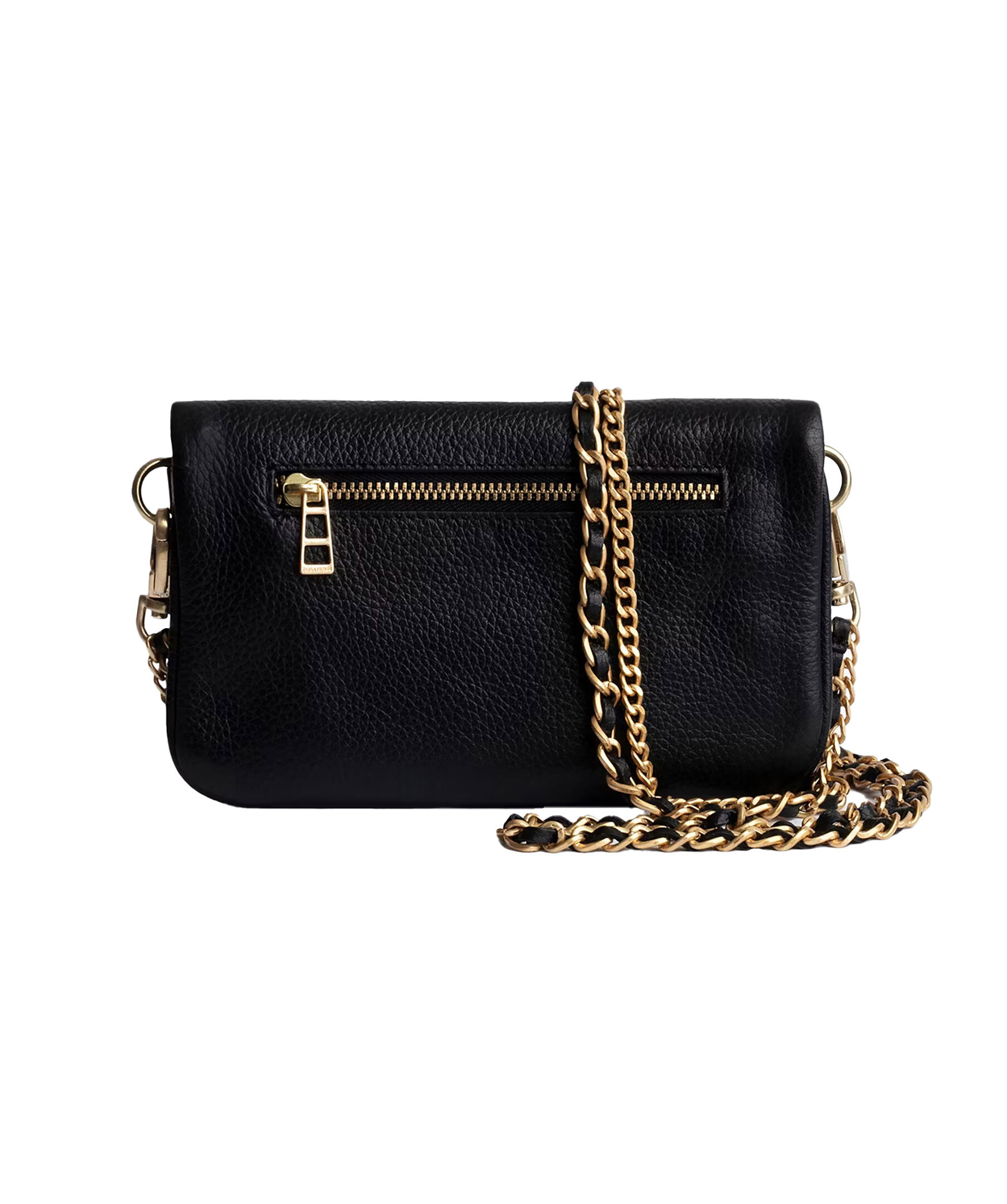 Svart läderclutch med guldtonade detaljer från Zadig Voltaire. Väskan har dubbel kedja och läderrem, så att du kan välja att bära den över kroppen eller på axeln. Bakficka med dragkedja. Väskan har en flik med magentstängning och dragkedja. Guldfärgad metall logotyp på framsidan. Tillverkad i ko-läder. Mått: B: 19cm / H: 11cm. Kedjeremsfall: 21 cm och 61 cm.