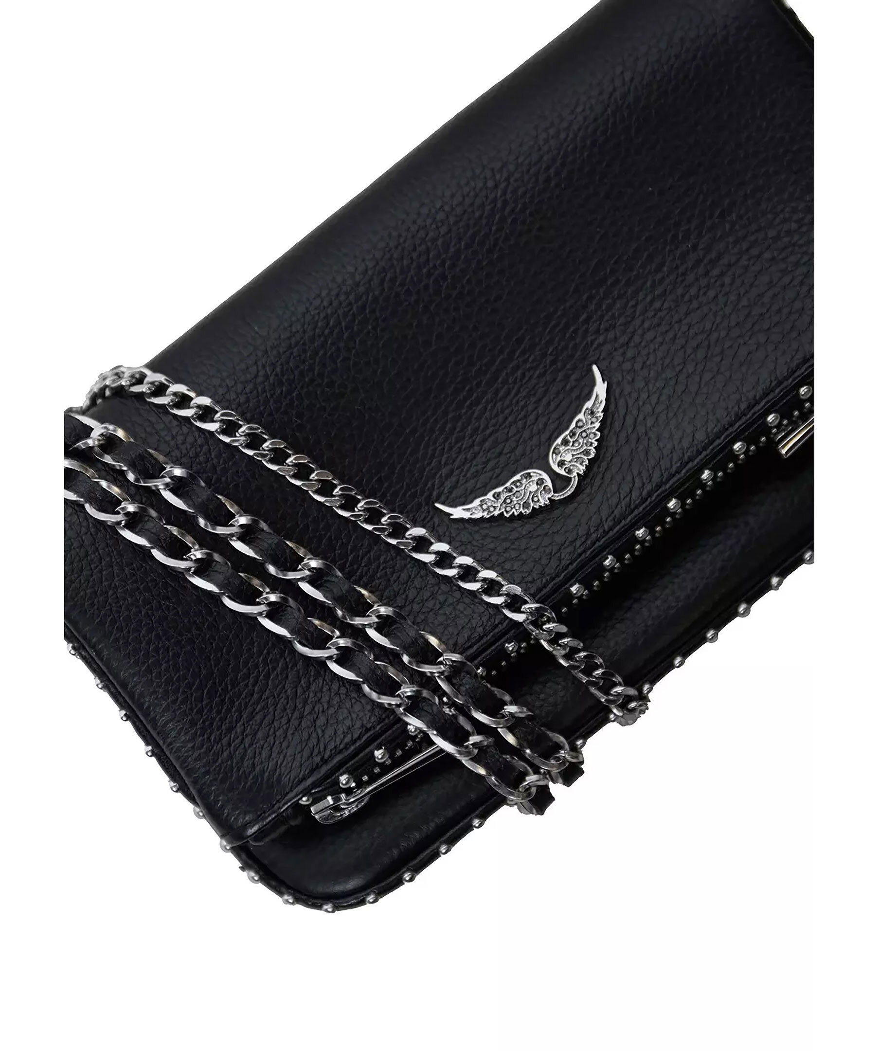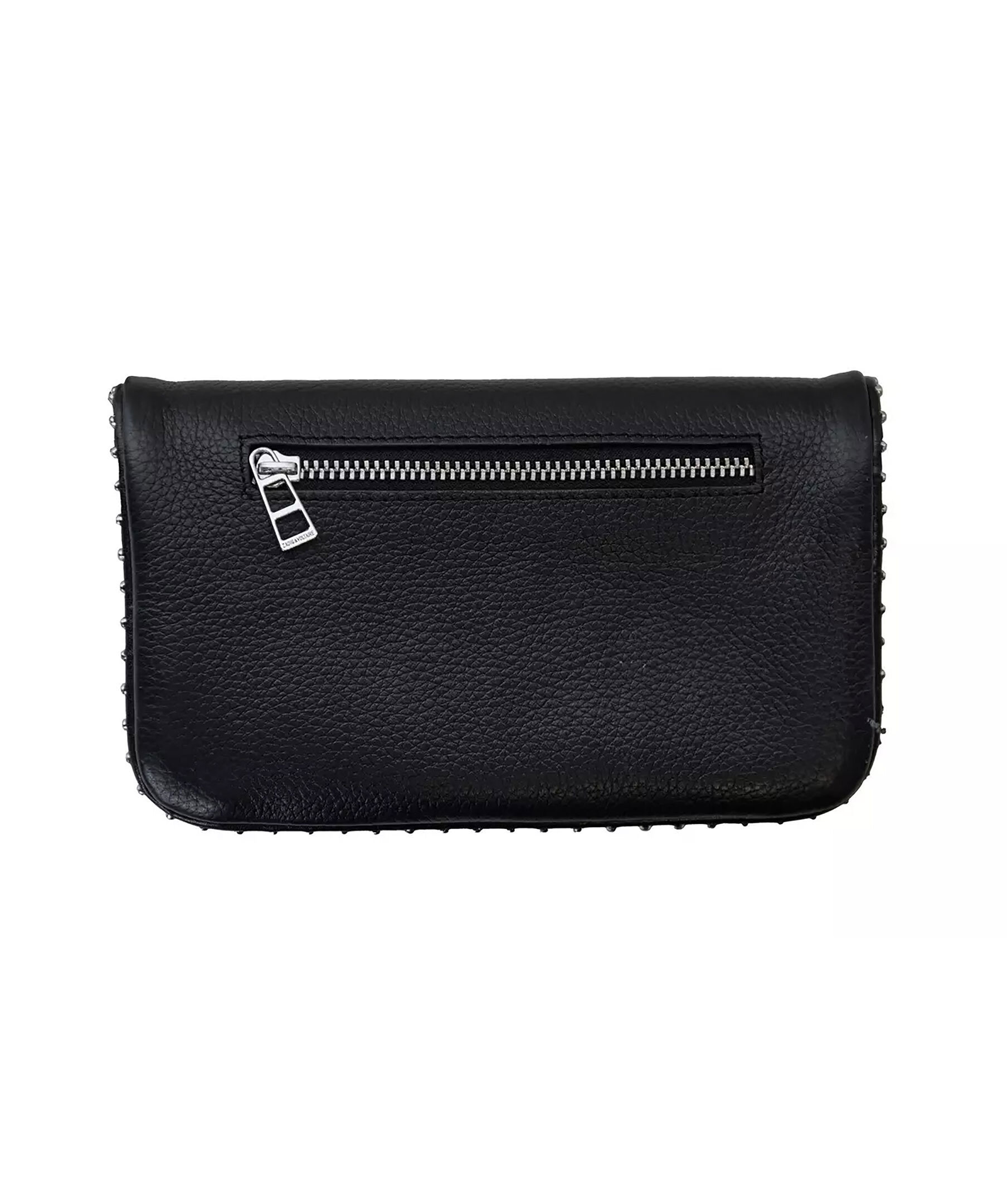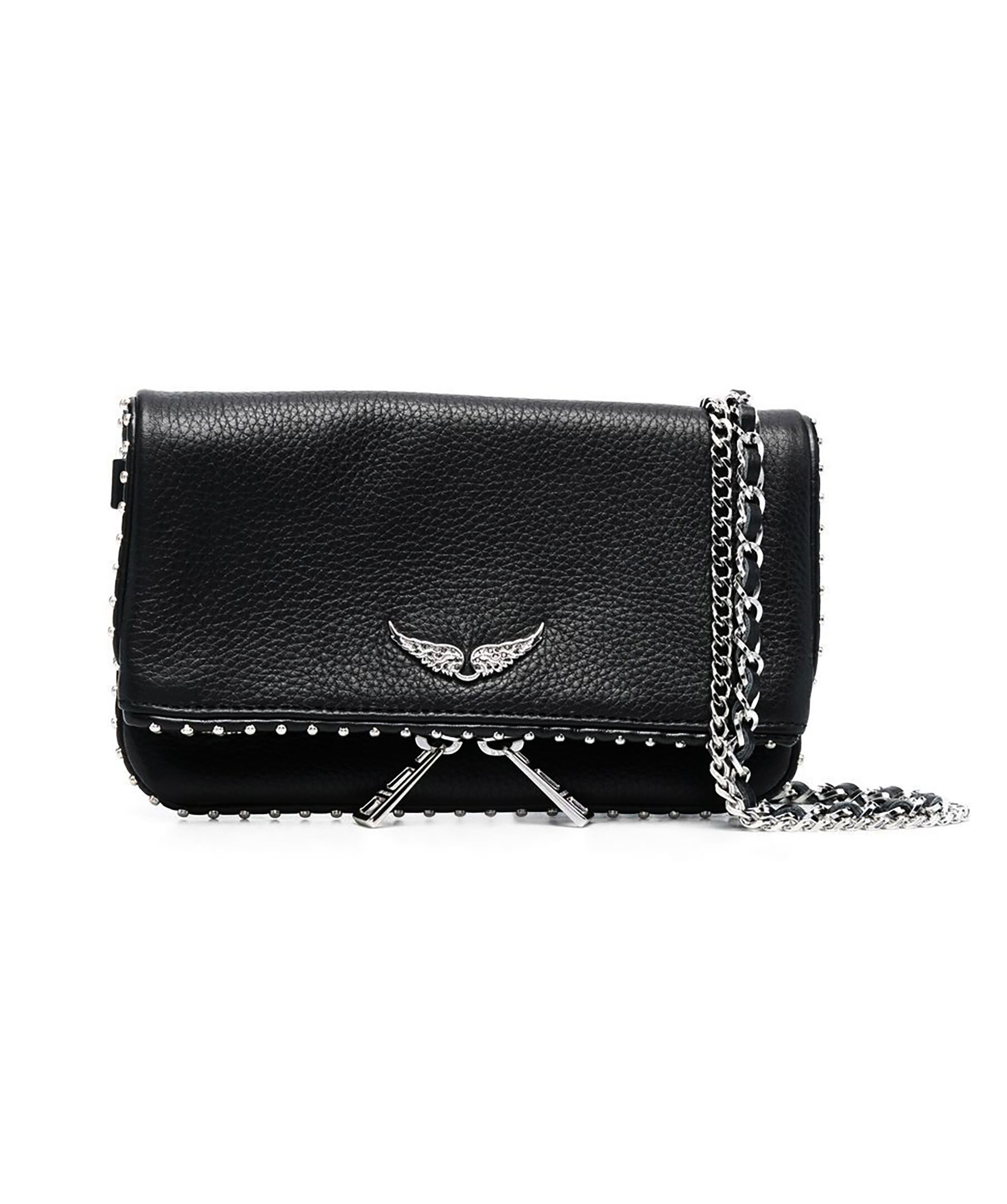 Svart handväska i en rockig stil från Zadig Voltaire med nitar längs kanterna. Väskan har två fickor med dragkedja, flik med magnetisk stängning, avtagbara dubbla kedjor i läder och metall samt logotyp i metall framtill. Kan bäras som handväska, axelväska eller crossbody-väska. Mått: 18cm x 11cm.